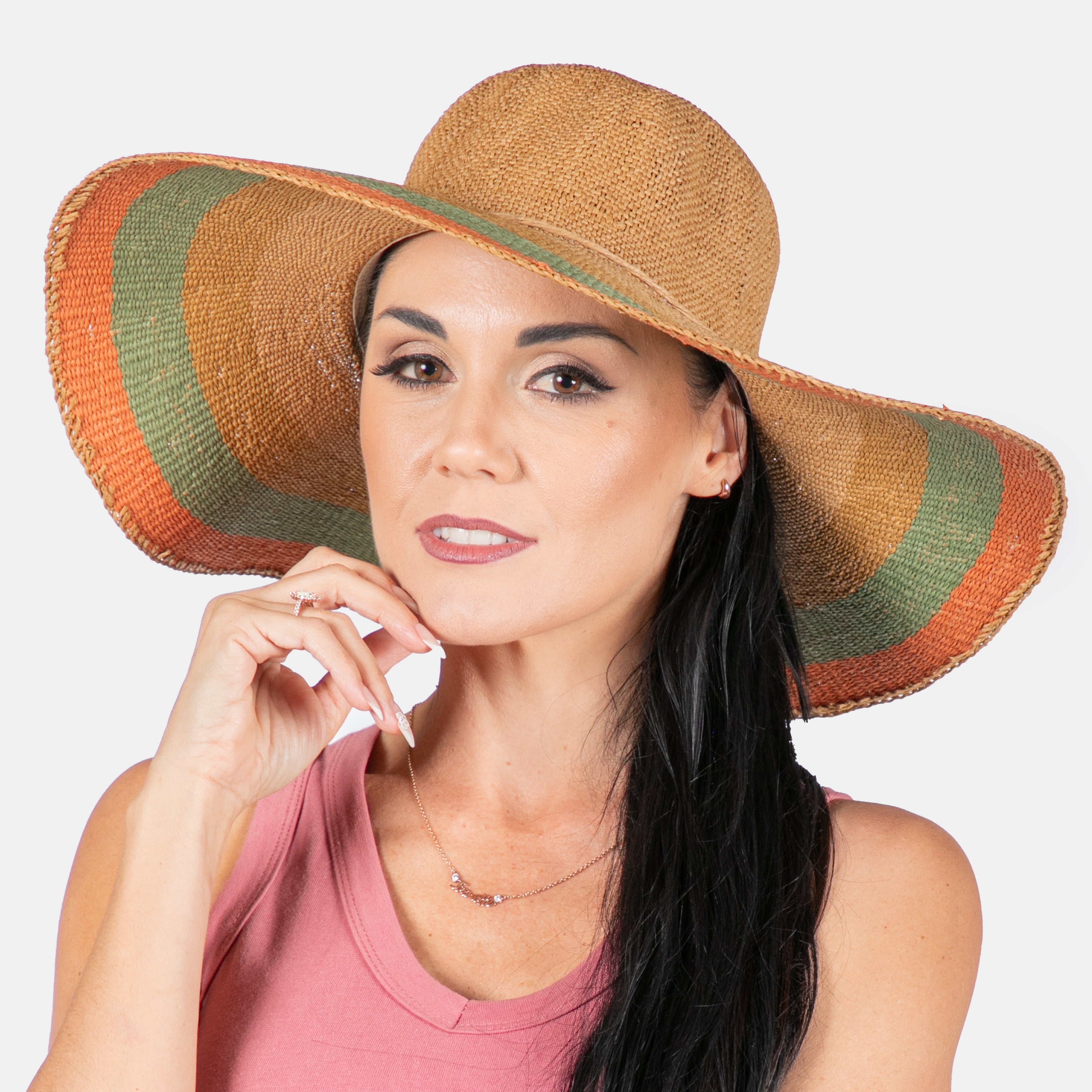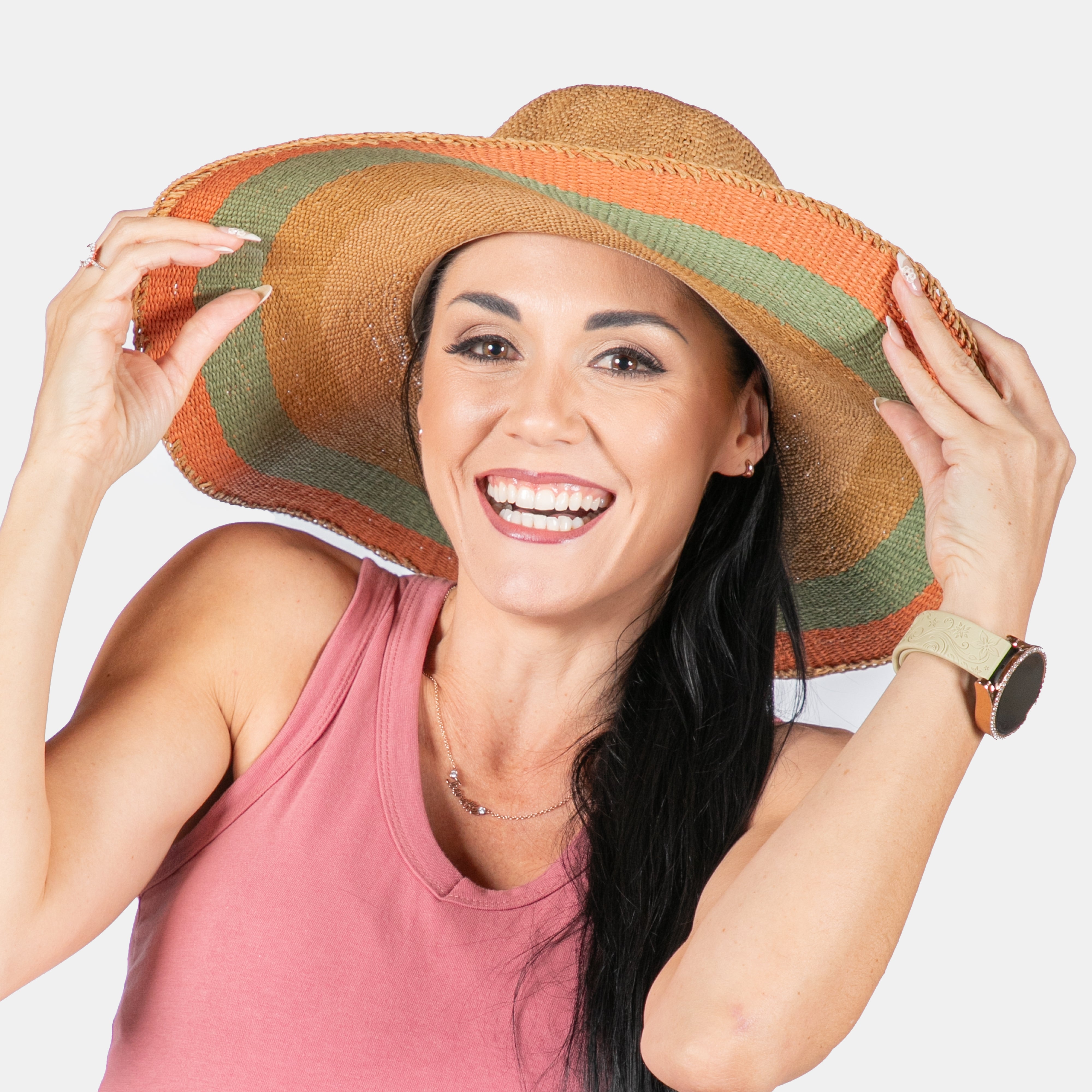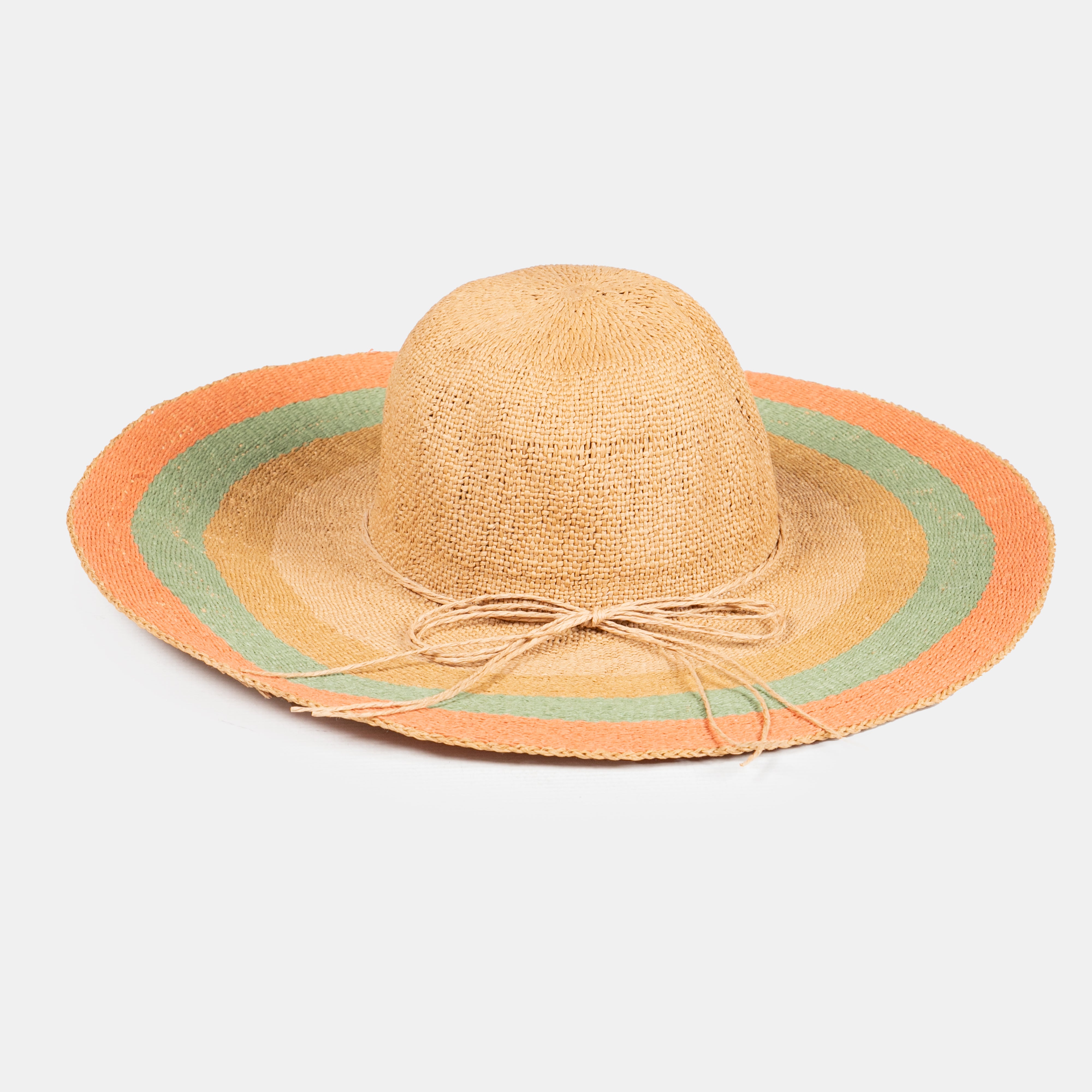 This stylish fibre woven hat is a wonderful accessory to your Summer holiday ensemble. It features a wide brim and a generous, breathable round crown with a thin string tie. The entire hat is woven in expanding bands and tones of neutral to soft green to vibrant Orange.