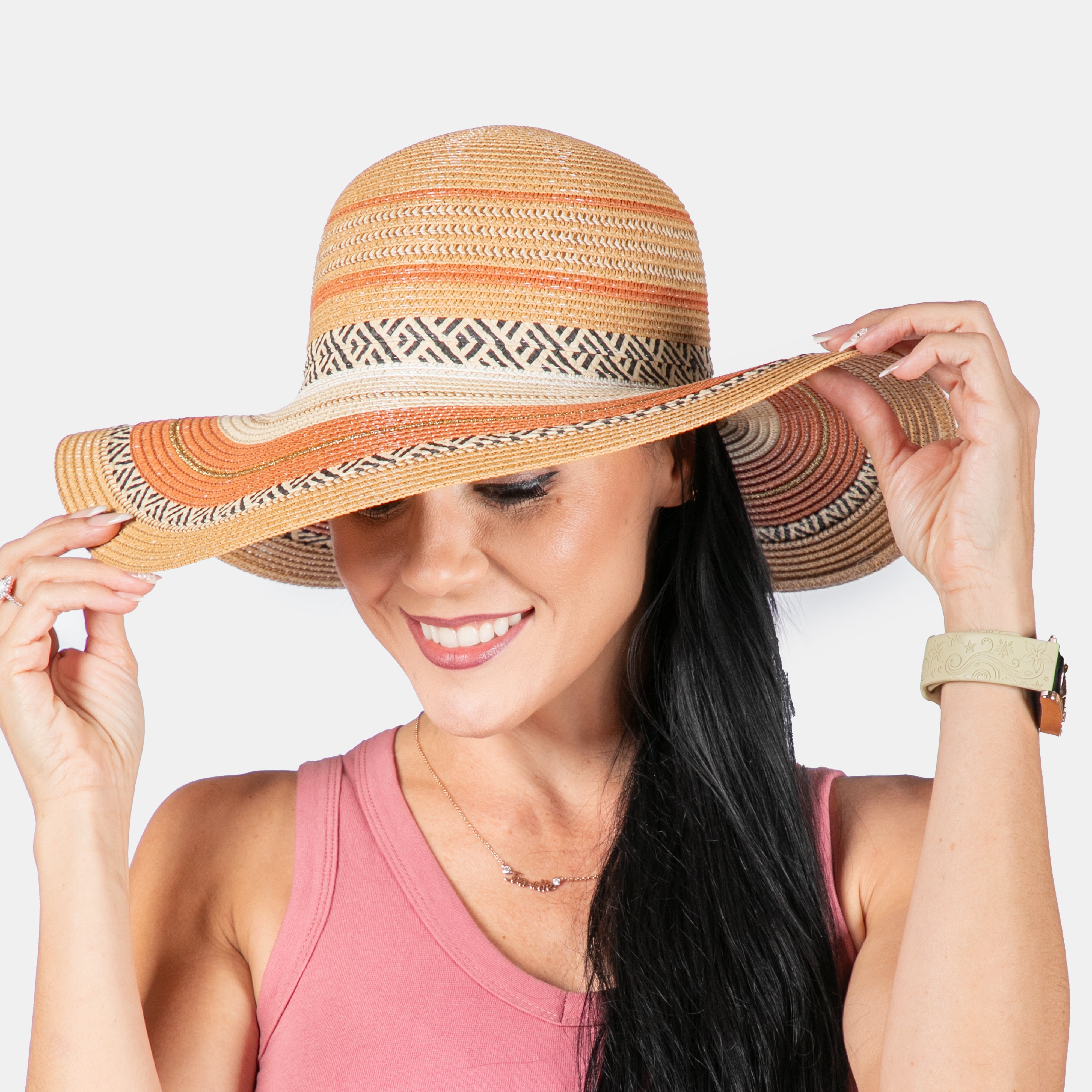 Sun protection is so necessary but there is no need to look frumpy with it. This stylish woven hat is a wonderful accessory to your Summer ensemble. It features a wide floppy brim and a generous, breathable round crown. The entire hat is woven in attractive stripes with elements of ethnic pattern.