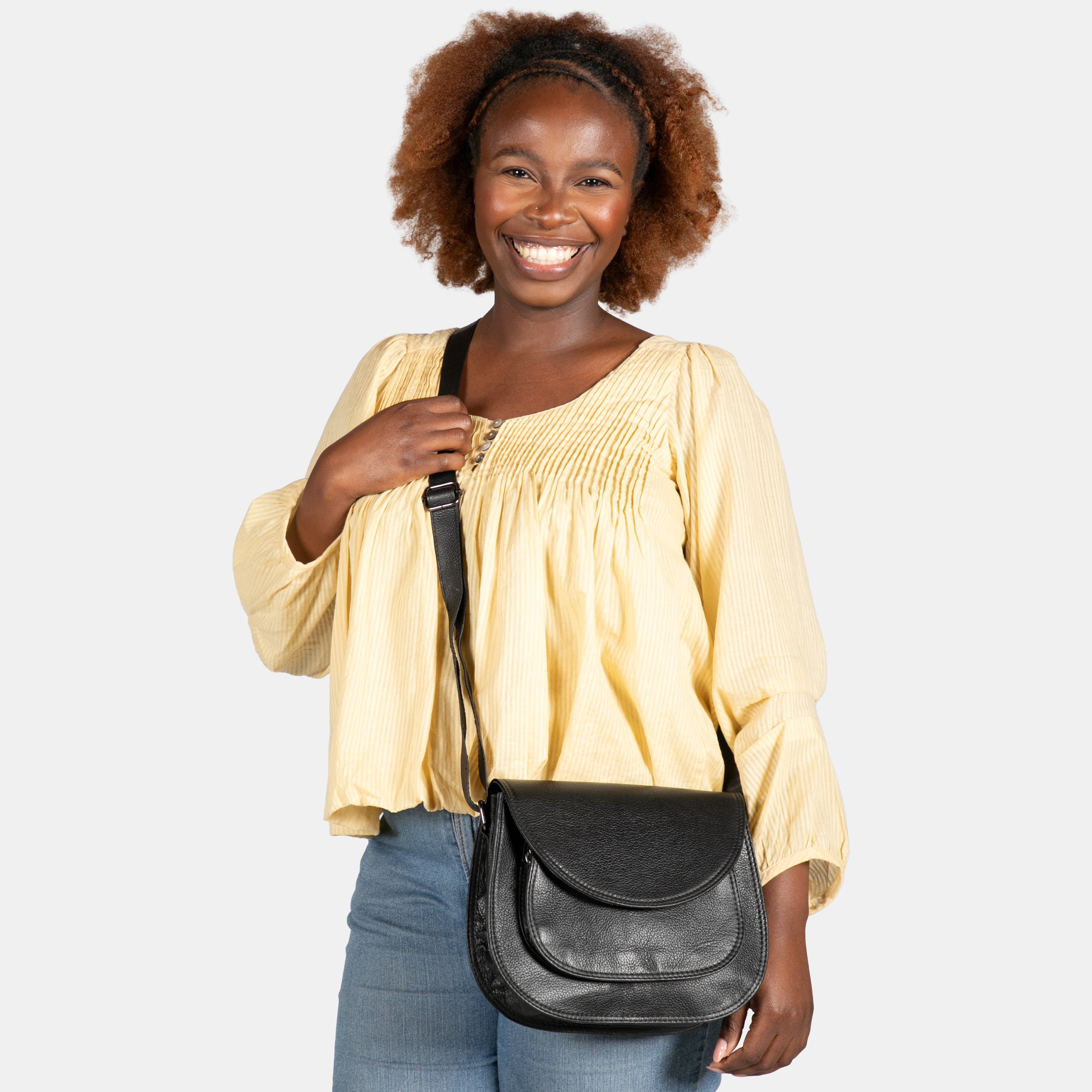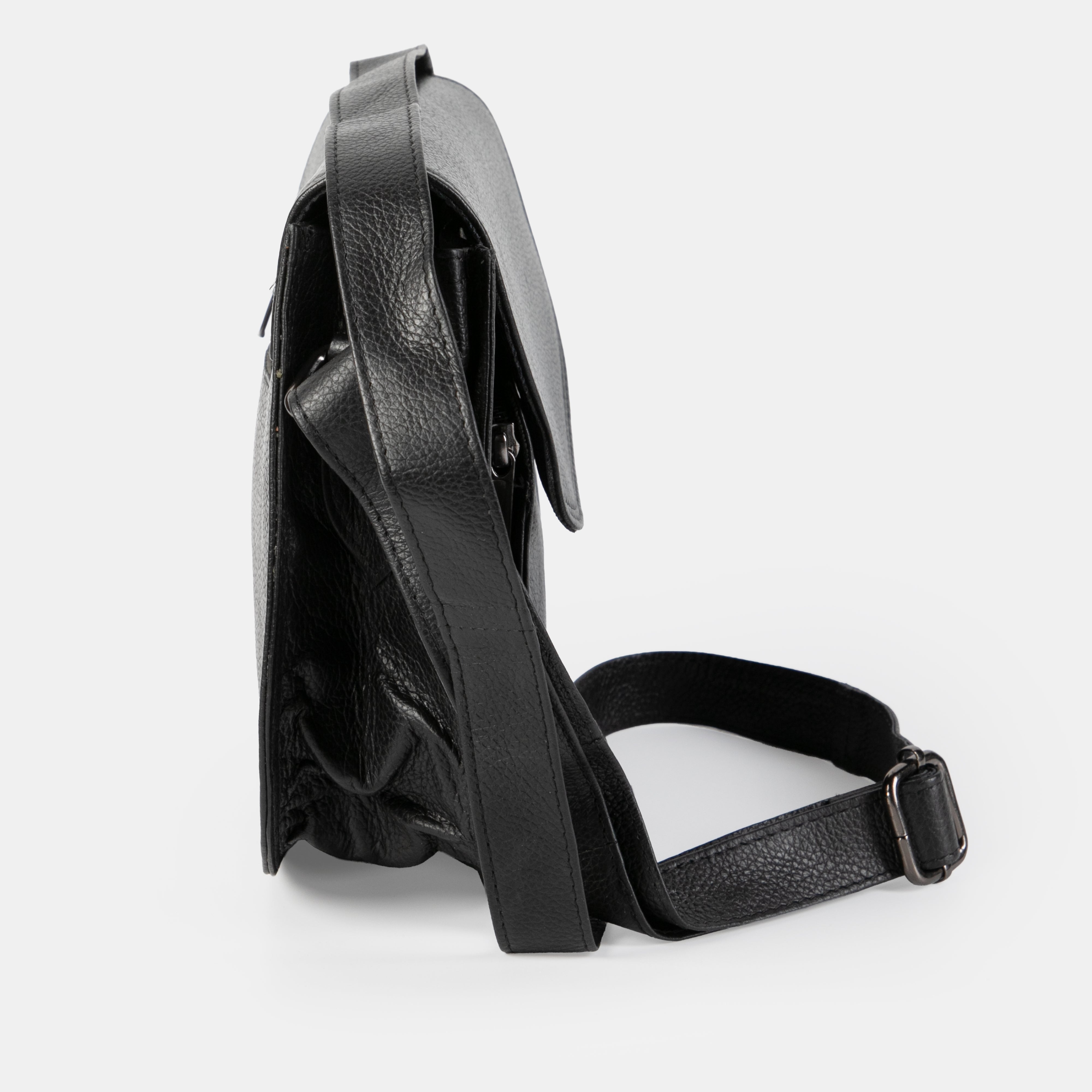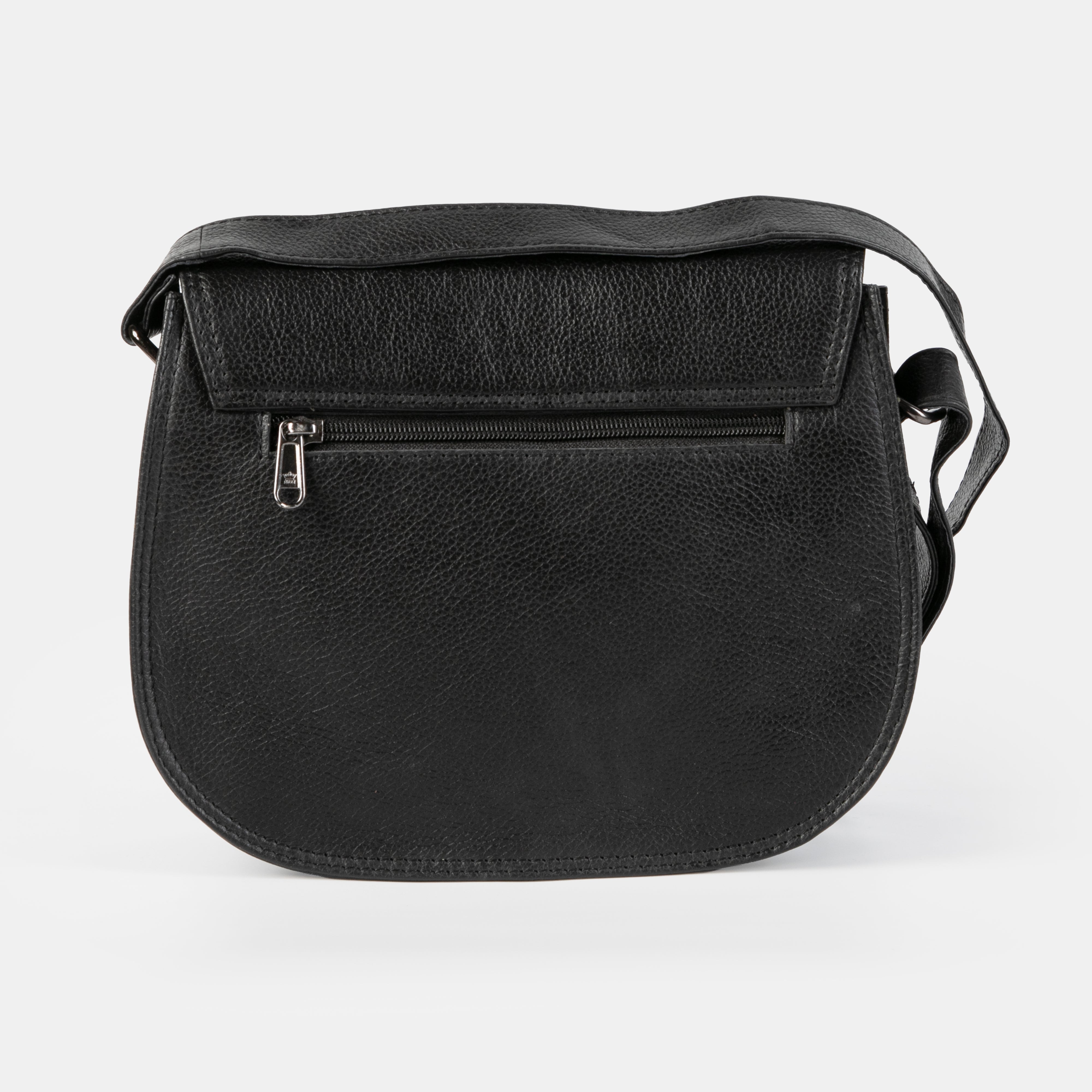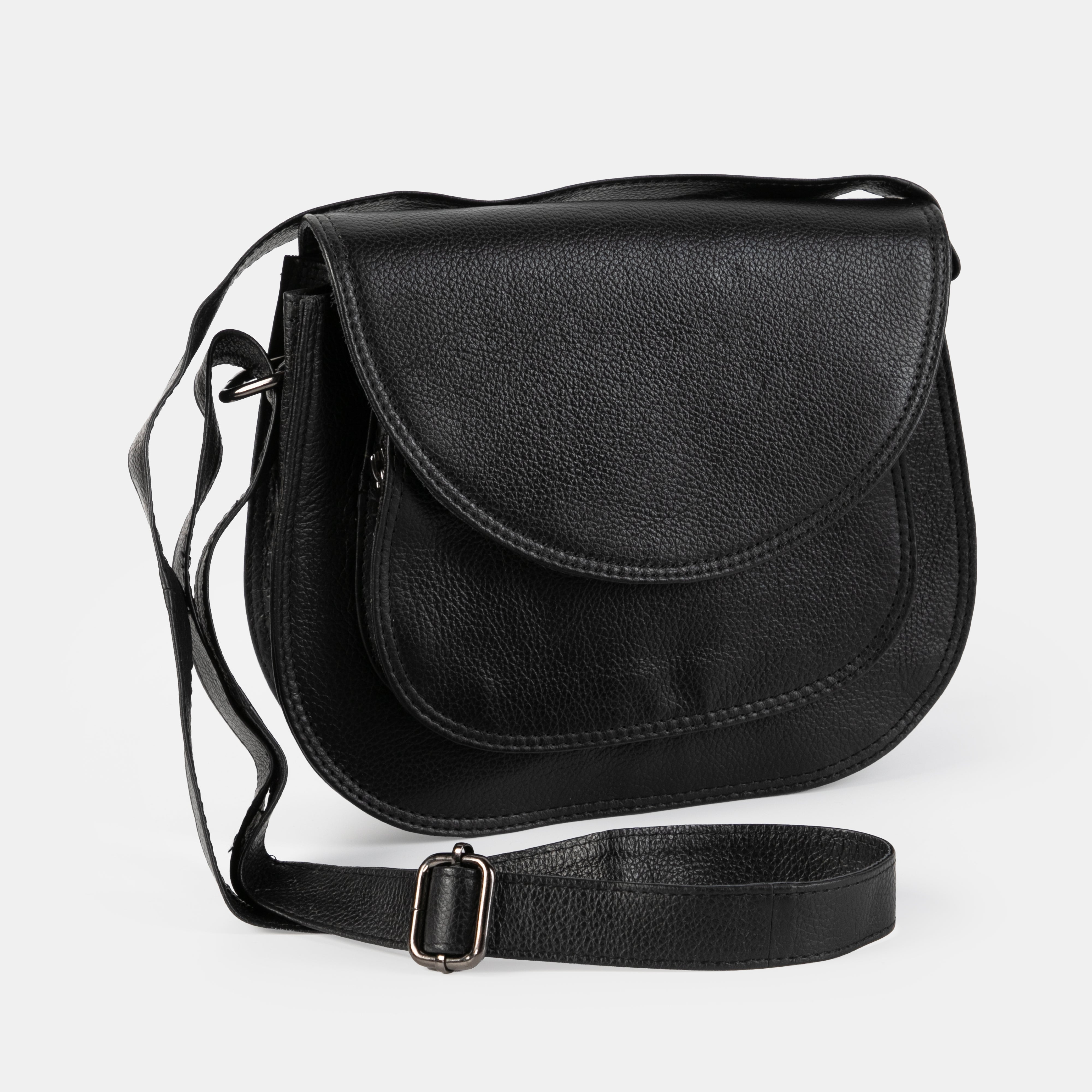 This black leather bag is as practical as it is stylish. Sling it across your body with the adjustable strap and access your essentials through the magnetic-snap front flap. You will discover a pouch in front under the flap and a zippered pocket at the back. Inside a dedicated phone slot and roomy main compartment keep everything organized. Perfect for the woman who refuses to choose between fashion and function.