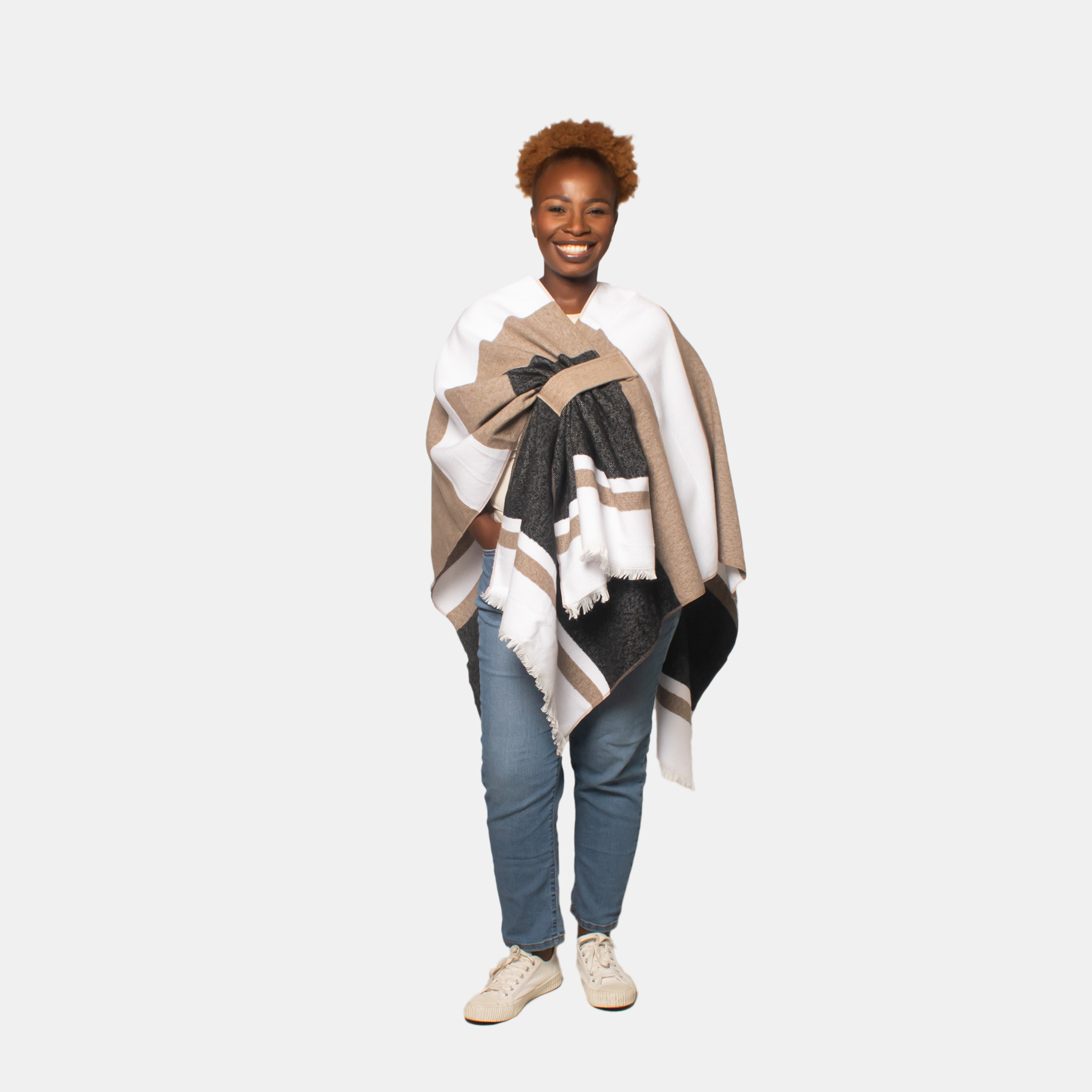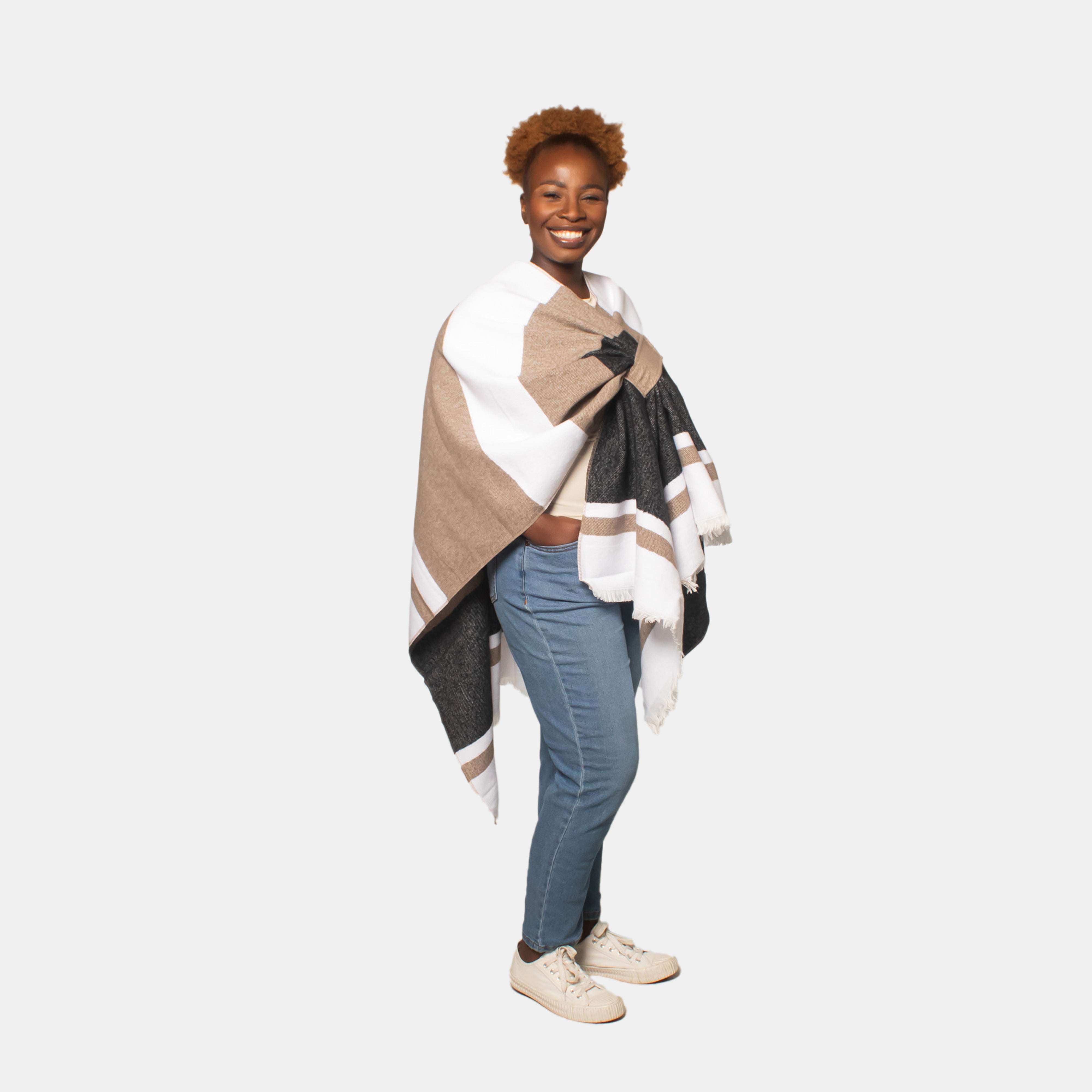 With cooler weather on the horizon, this wraps suits those transitional months and has you looking stylish whilst keeping warm. Crafted from the softest cloth, it features White, Cream and Black stripes and a thread through panel at the front to keep it in place.