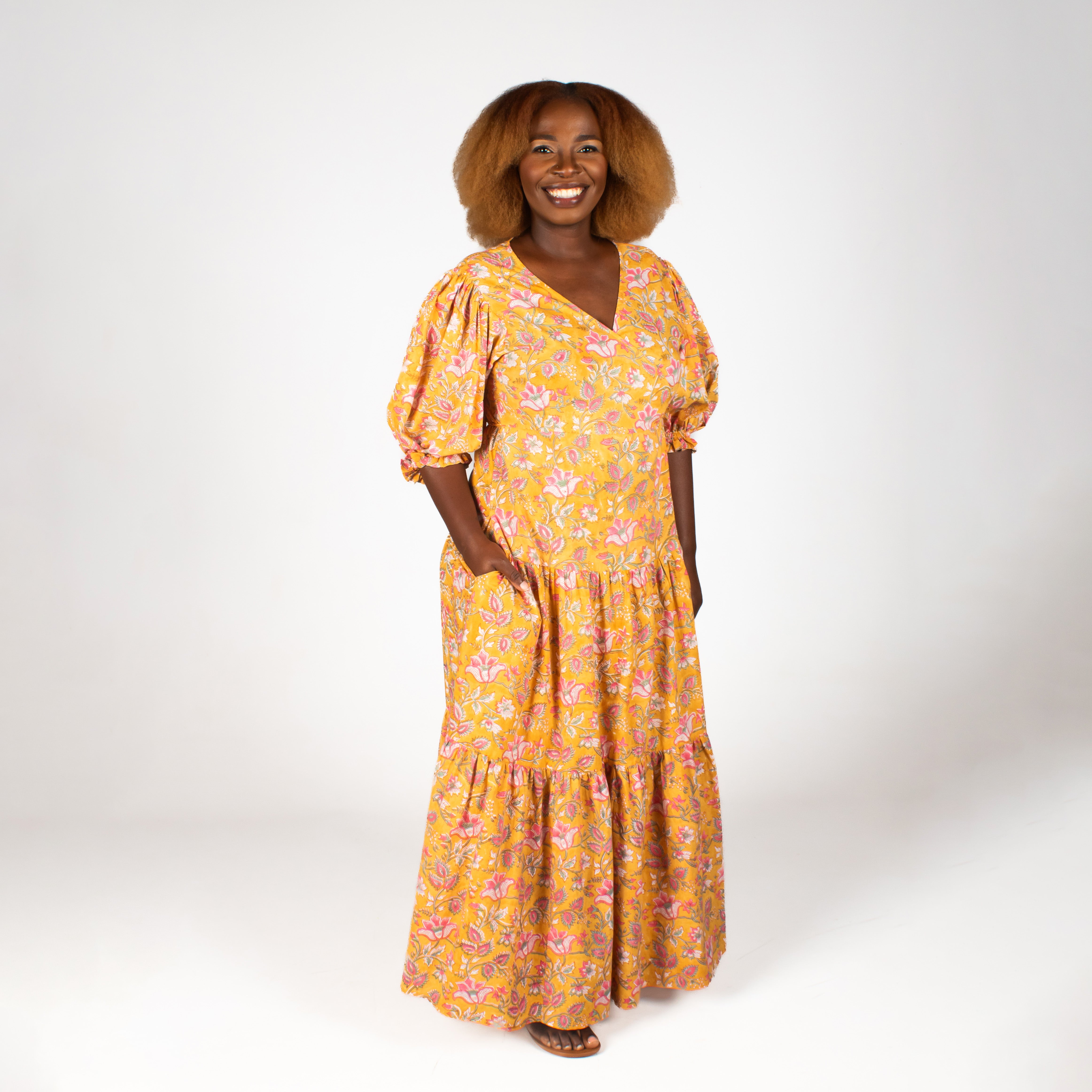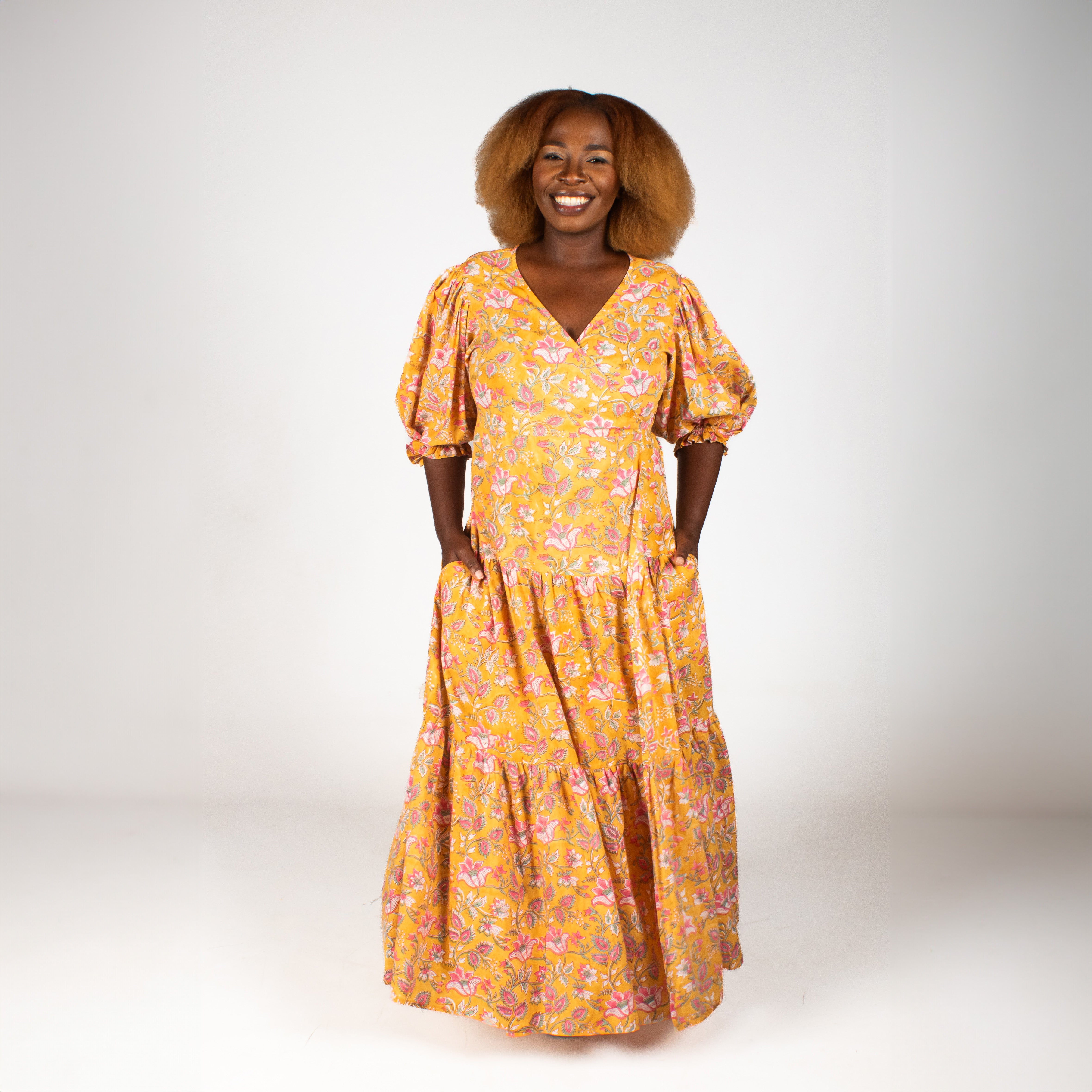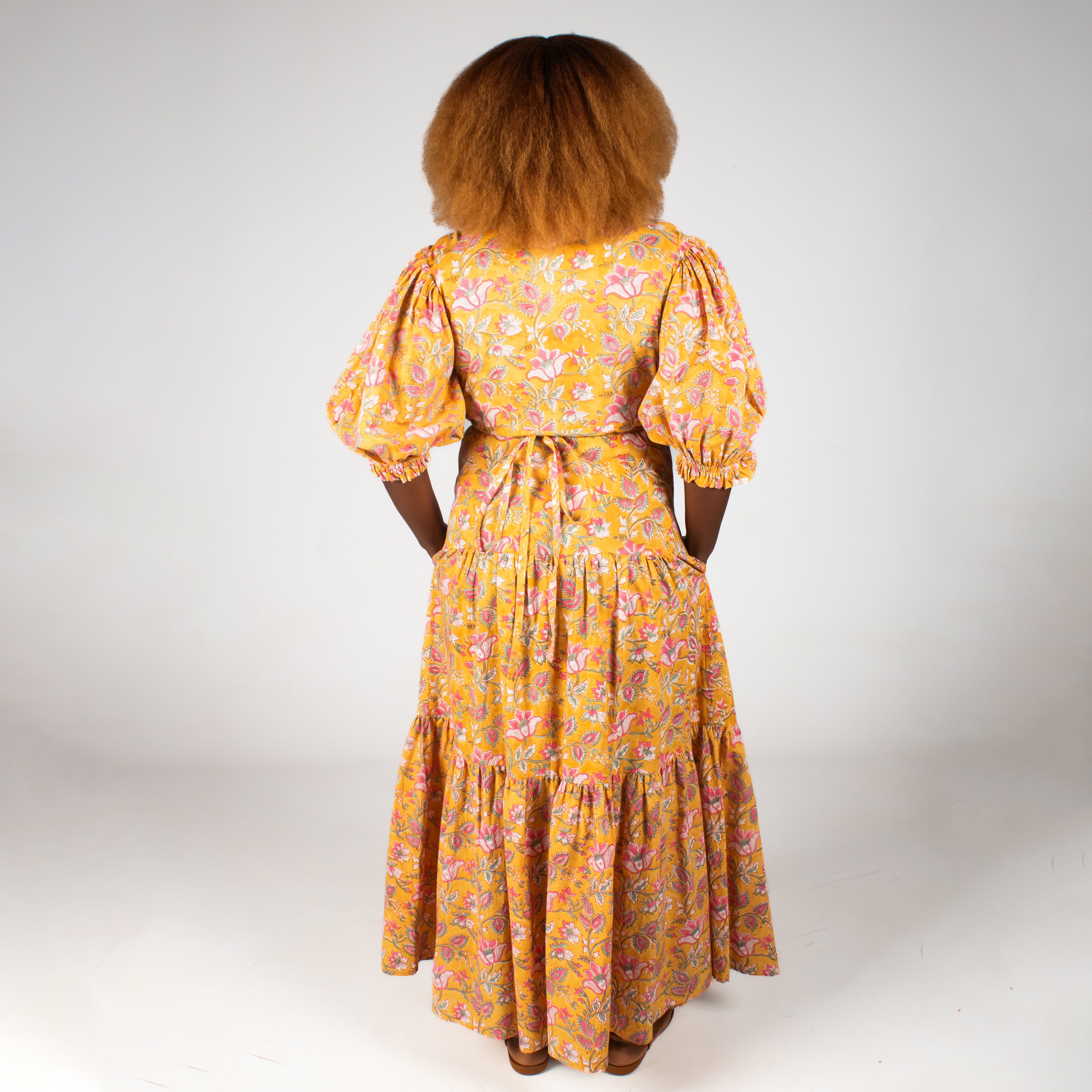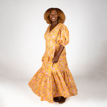 This charming maxi dress features authentic Indian block printing on breathable 100% cotton. The flattering wrap-front pairs beautifully with playful puffed sleeves that gather at the elbows, while a two-tiered gathered skirt sways with every step. Perfect for warm days when you want to feel both comfortable and utterly fabulous.