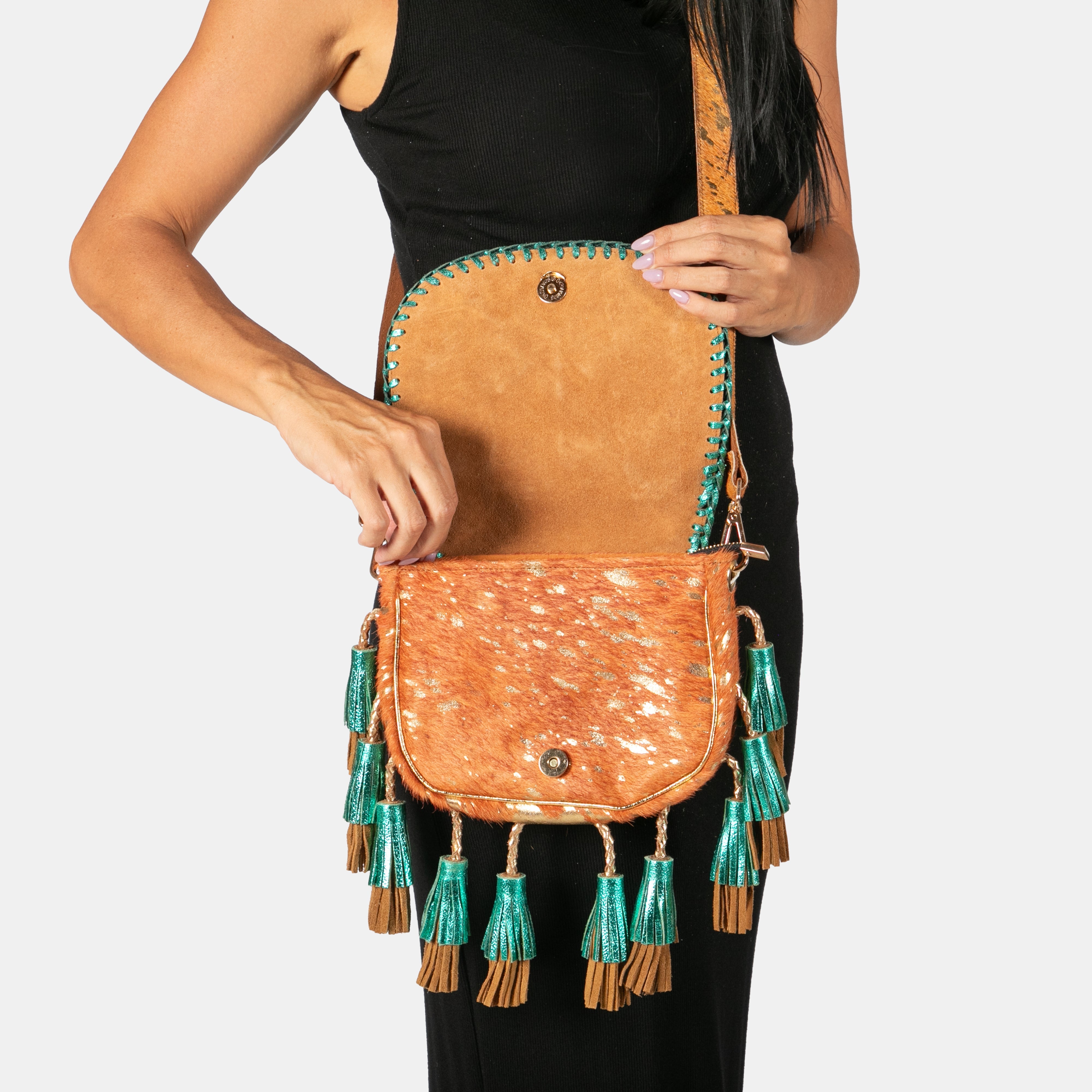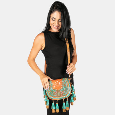This medium sized cross body bag is crafted from genuine leather. Shaped like a saddle bag and beaded in a magnificent design, this bag is certainly one of a kind! The adjustable strap has lobster clasps and is removable. An embellished front flap covers the entire front and closes with a magnetic stud. Inside you will discover a zipped closure with a smaller compartment stitched into the lining. Ten evenly spaced tasselled bunches hang from underneath the bag and swing like crazy as you walk.