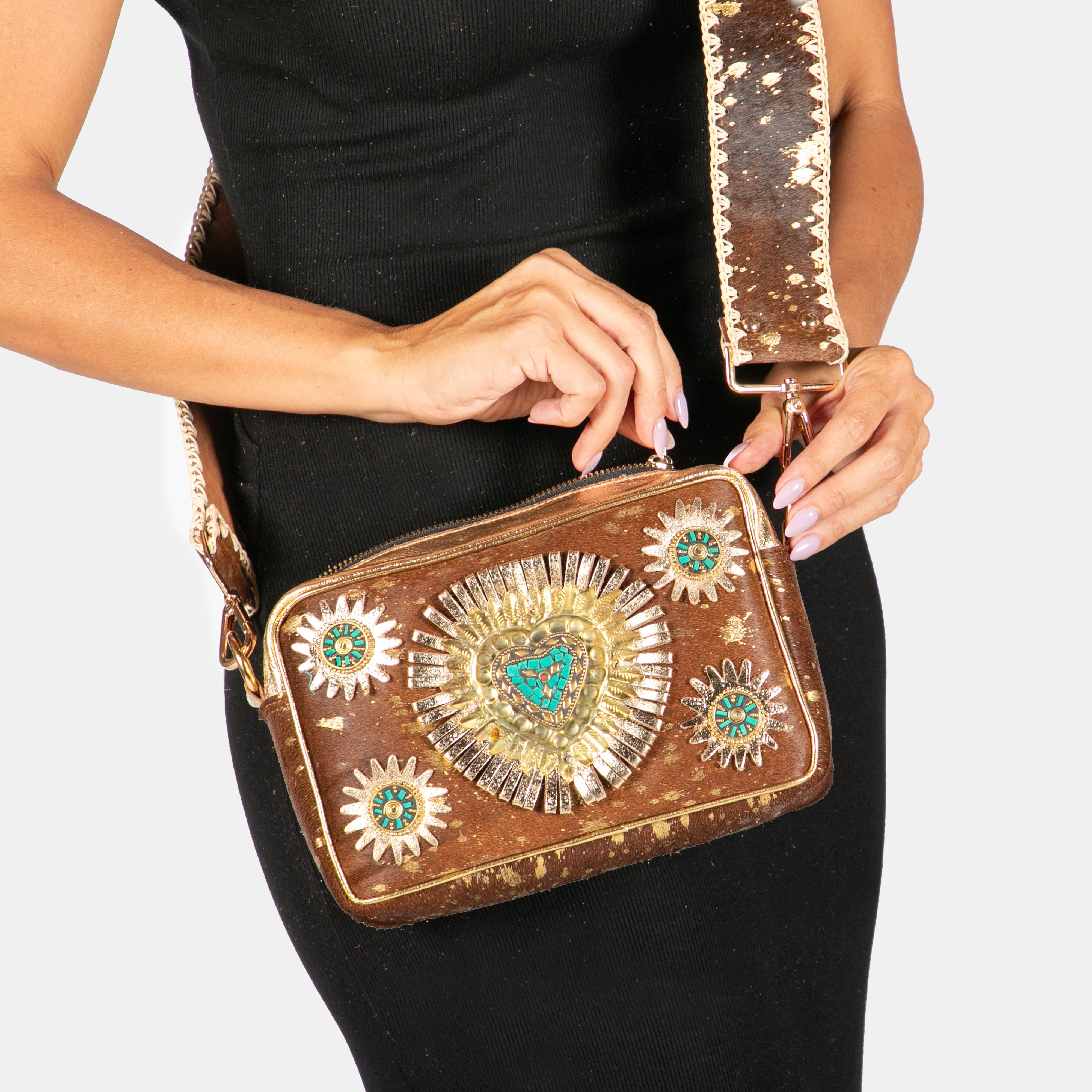 The name '4 circles' comes from the beaded circles on the four corners of this bag. In the centre you will find a metal heart with feathers and a turquoise beaded heart. The strap is also cowhide embellished with gold foil and crochet work on the edges. This strap is removable and adjustable and is attached with lobster clasps. Medium in size it is large enough to accommodate your purse, phone, make up and keys with ease.