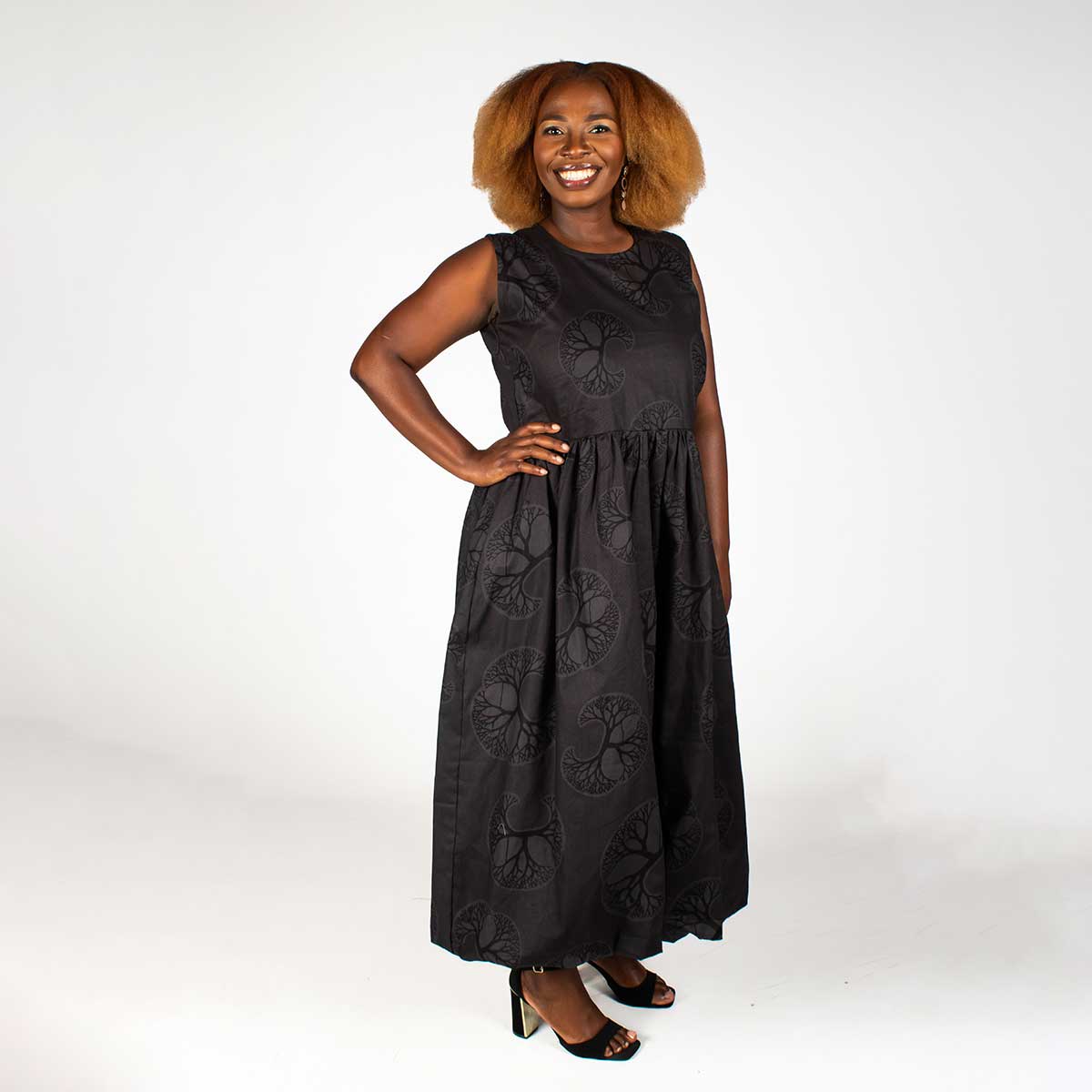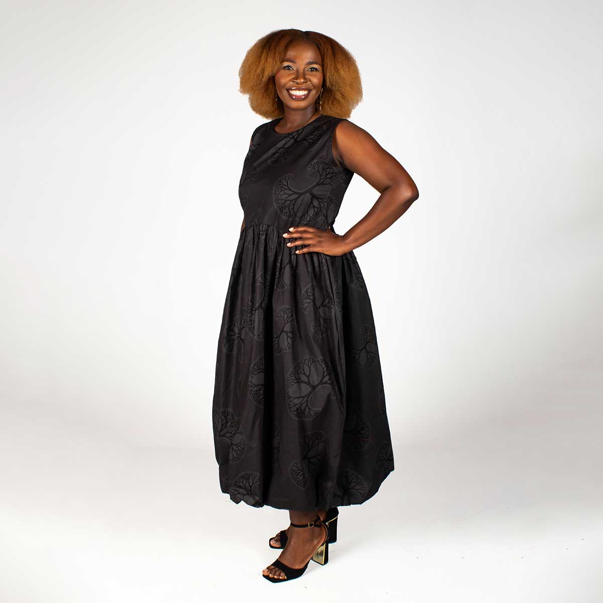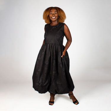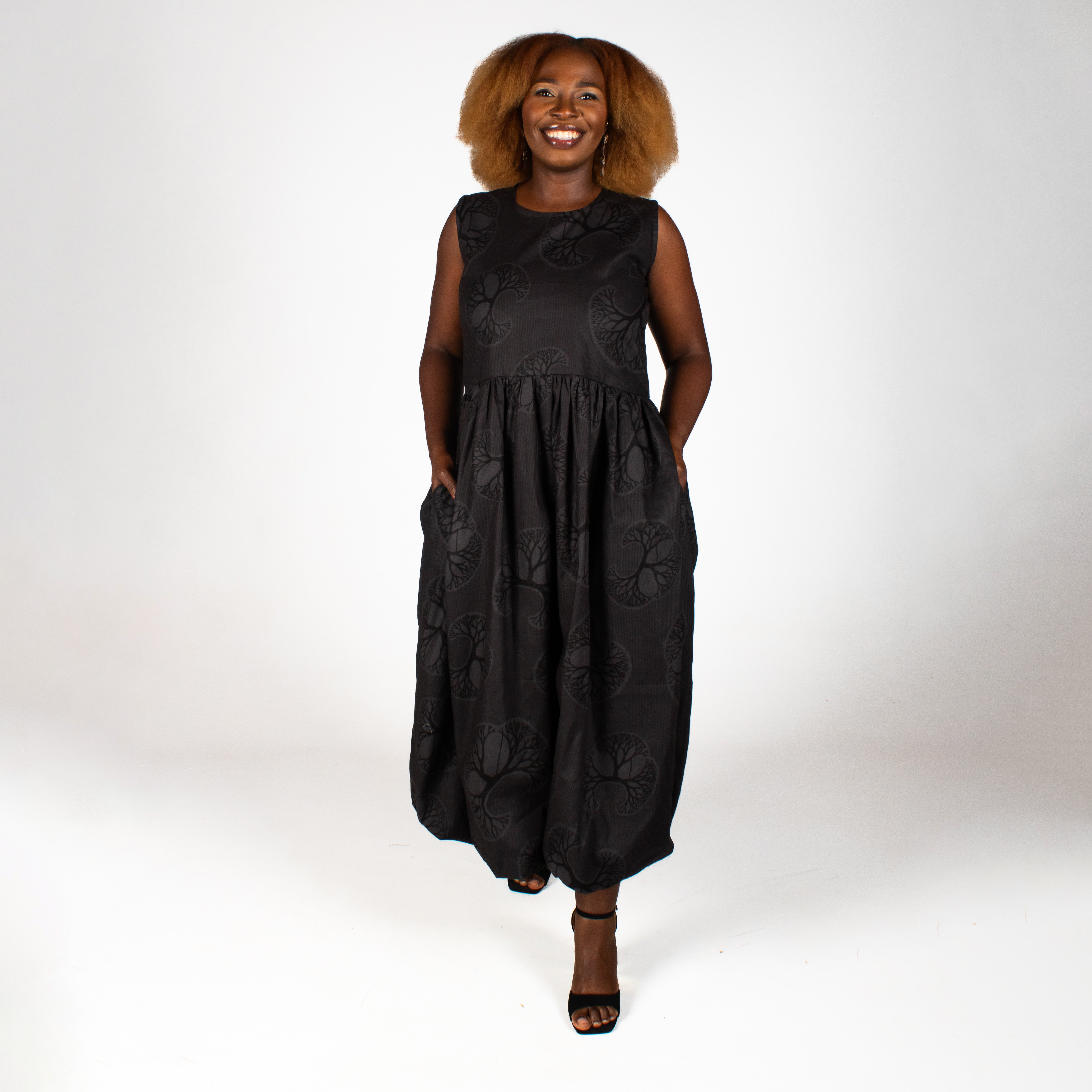 Make a statement this summer in our chic Bubble dress, proudly crafted right here in South Africa. This beauty showcases gorgeous black and grey tree patterns that catch the eye, paired with a sleek round neckline and fitted bodice secured by a discreet back zip. The playful bubble skirt hits mid-calf and comes complete with handy side pockets. Pure summer magic.