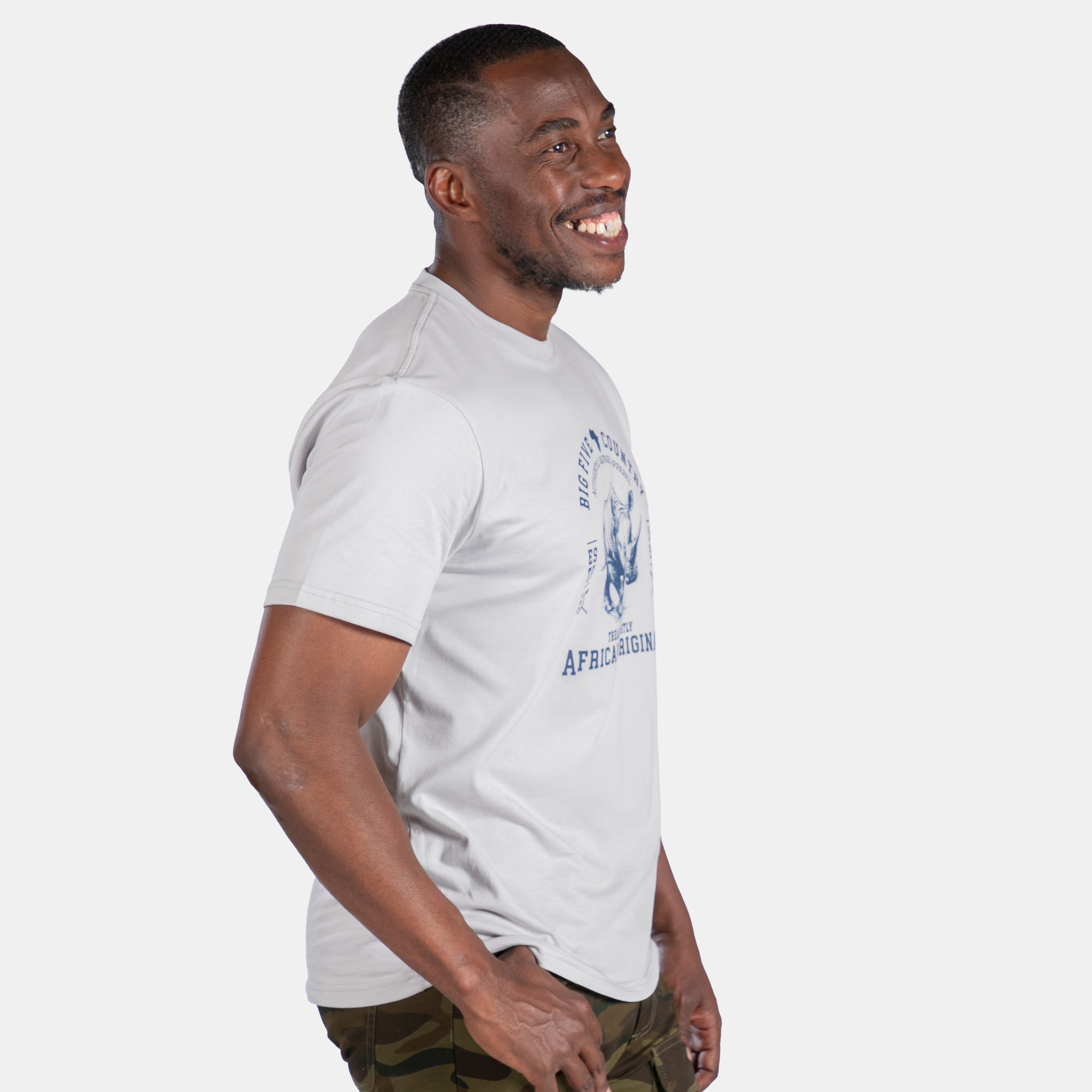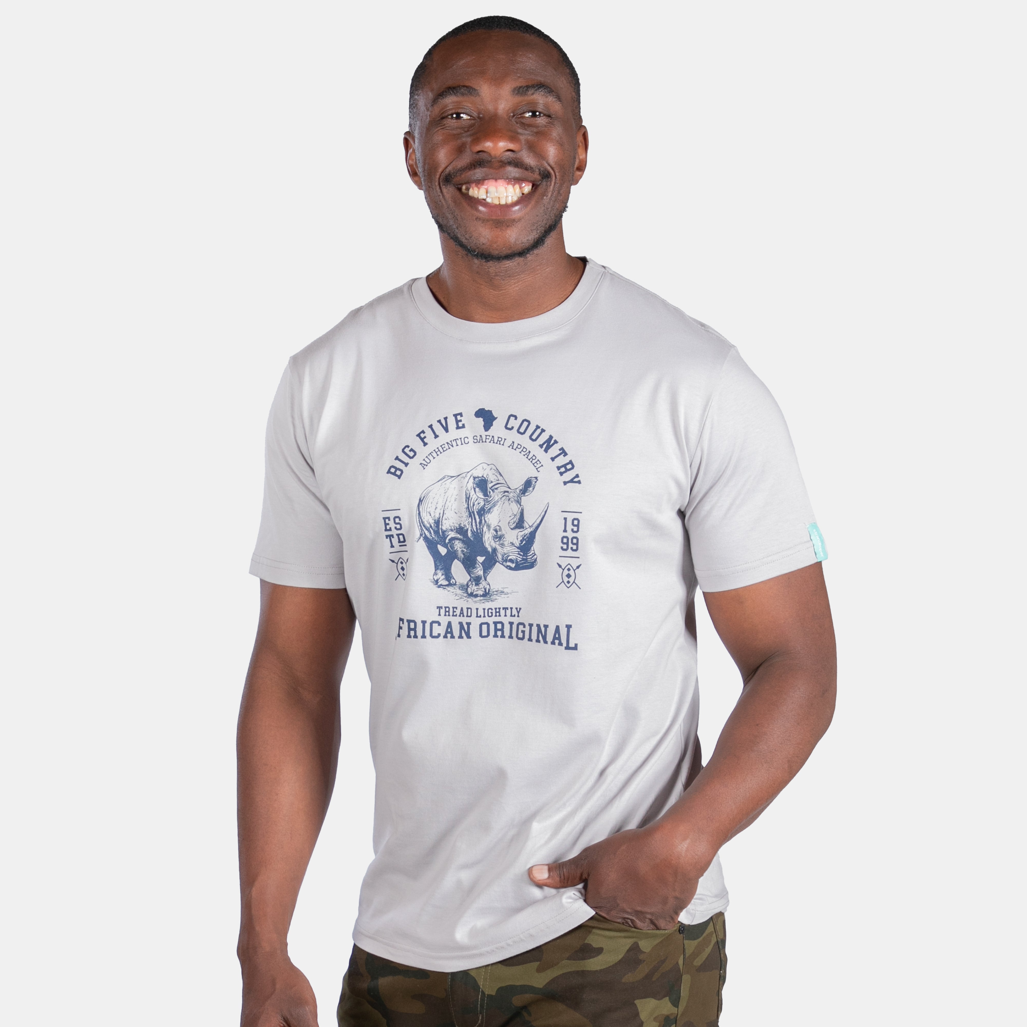 Big 5 country, African original. The stately rhino makes part of the design statement on this new t-shirt for men. Tread Lightly!