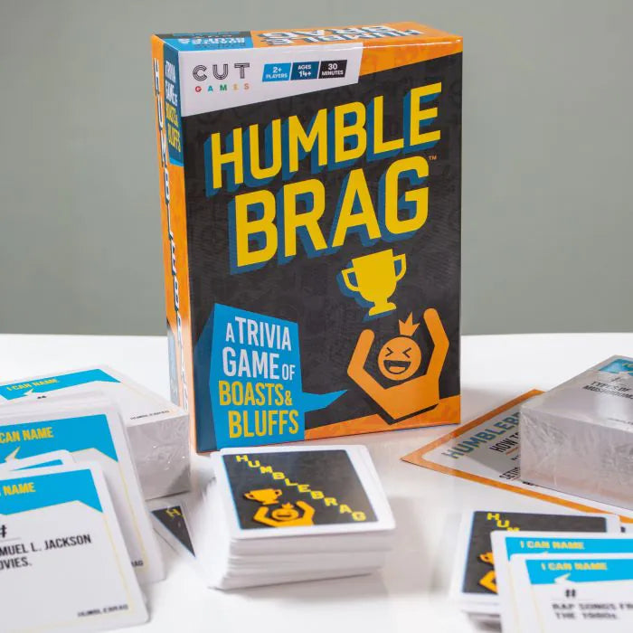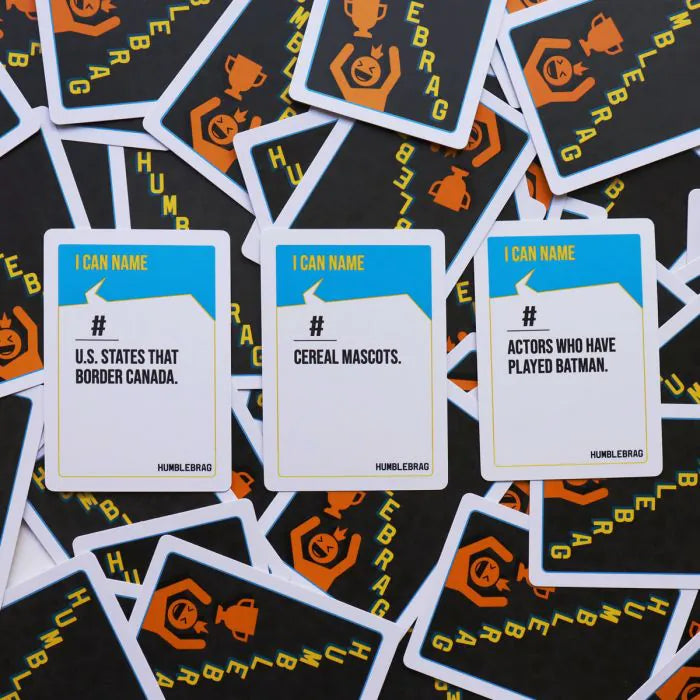 Humble Brag is a hilarious bluffing card game where you brag about naming things in 60 seconds, then prove it or lose!