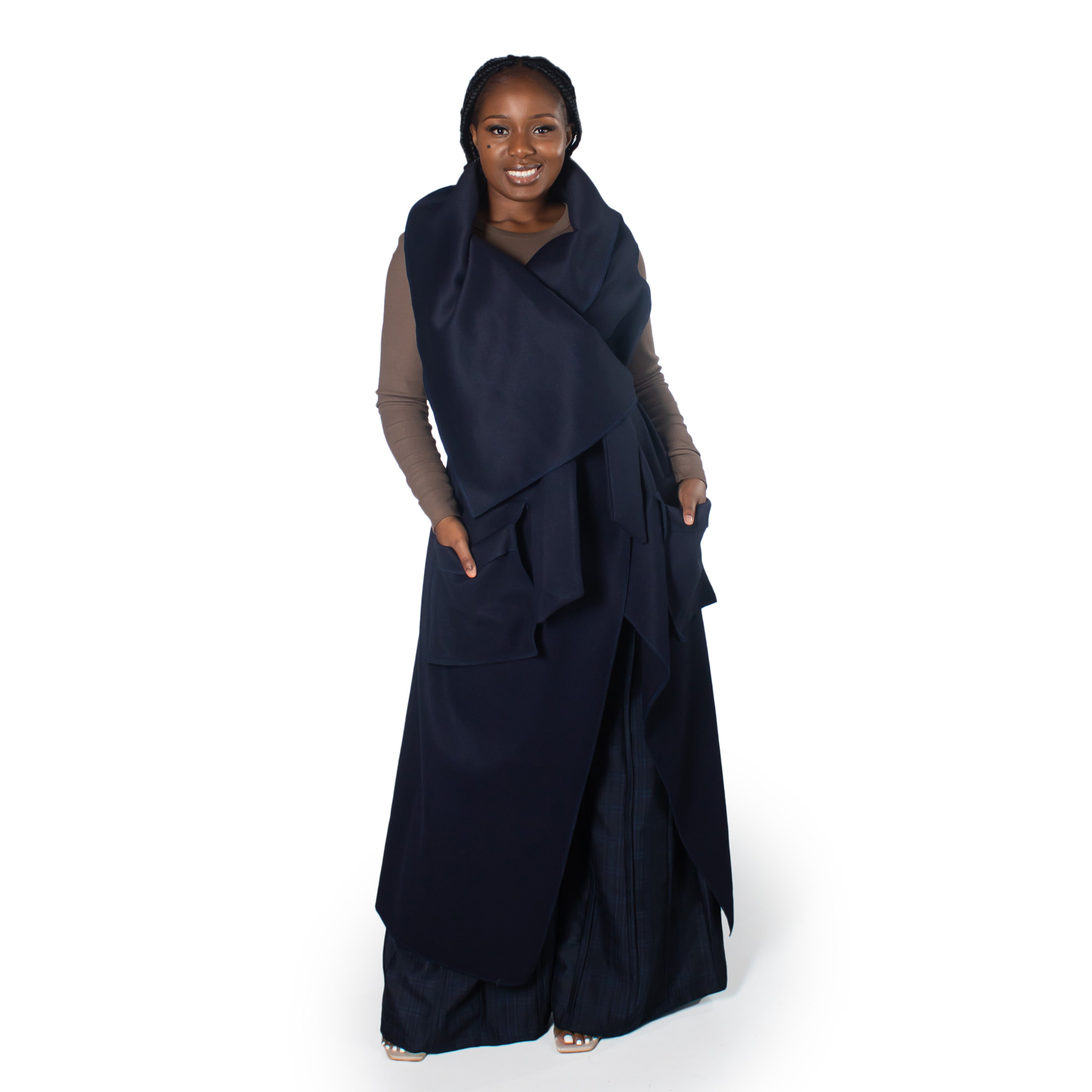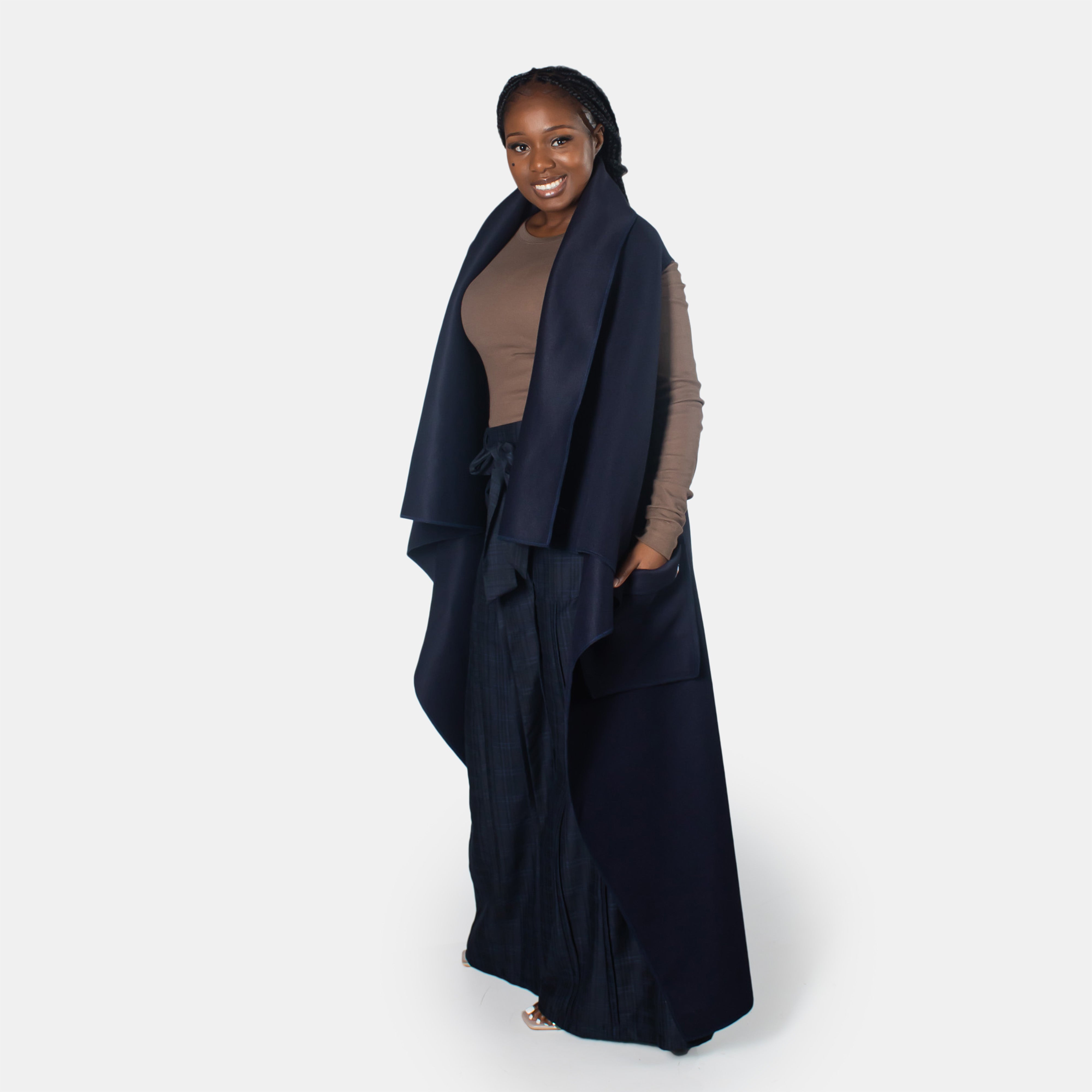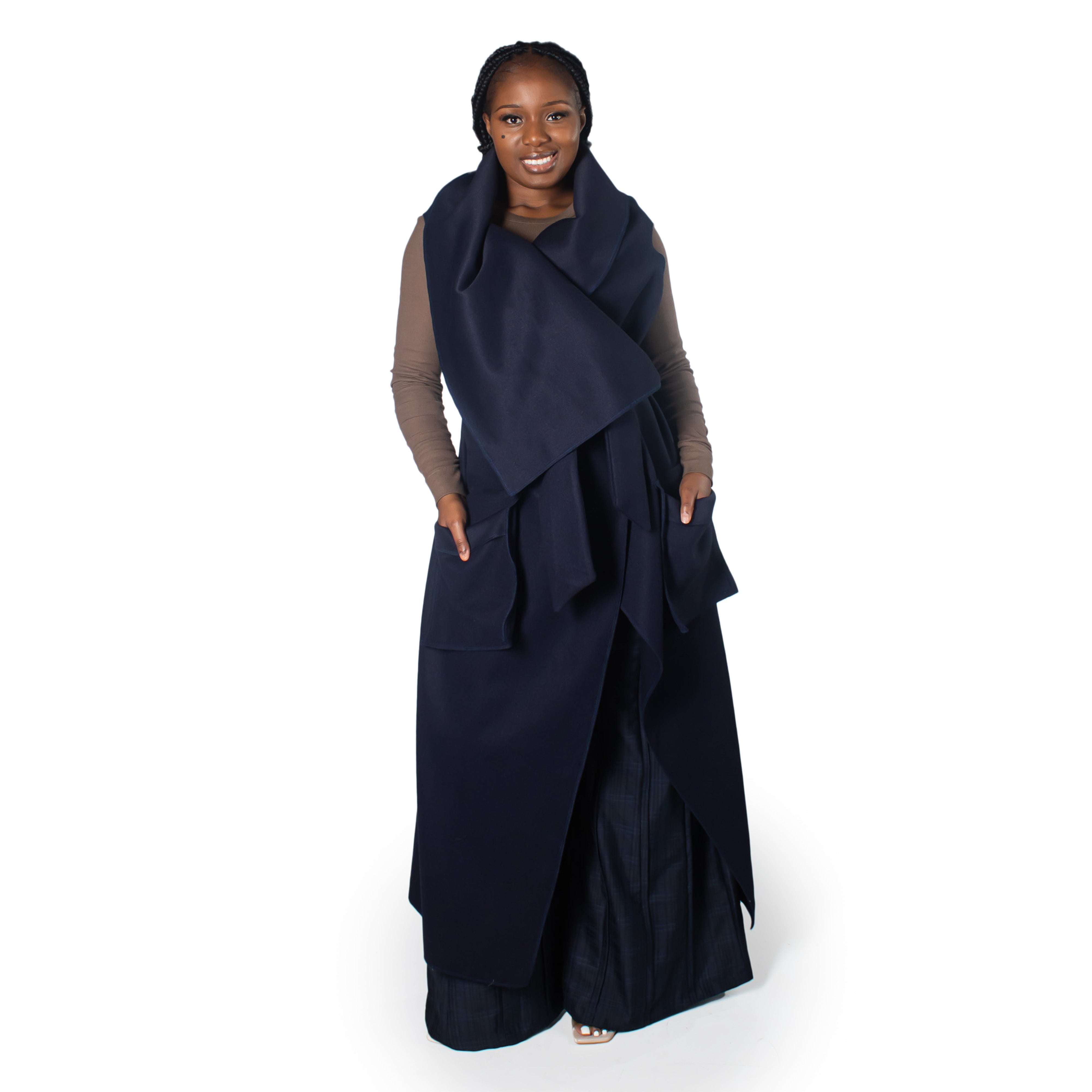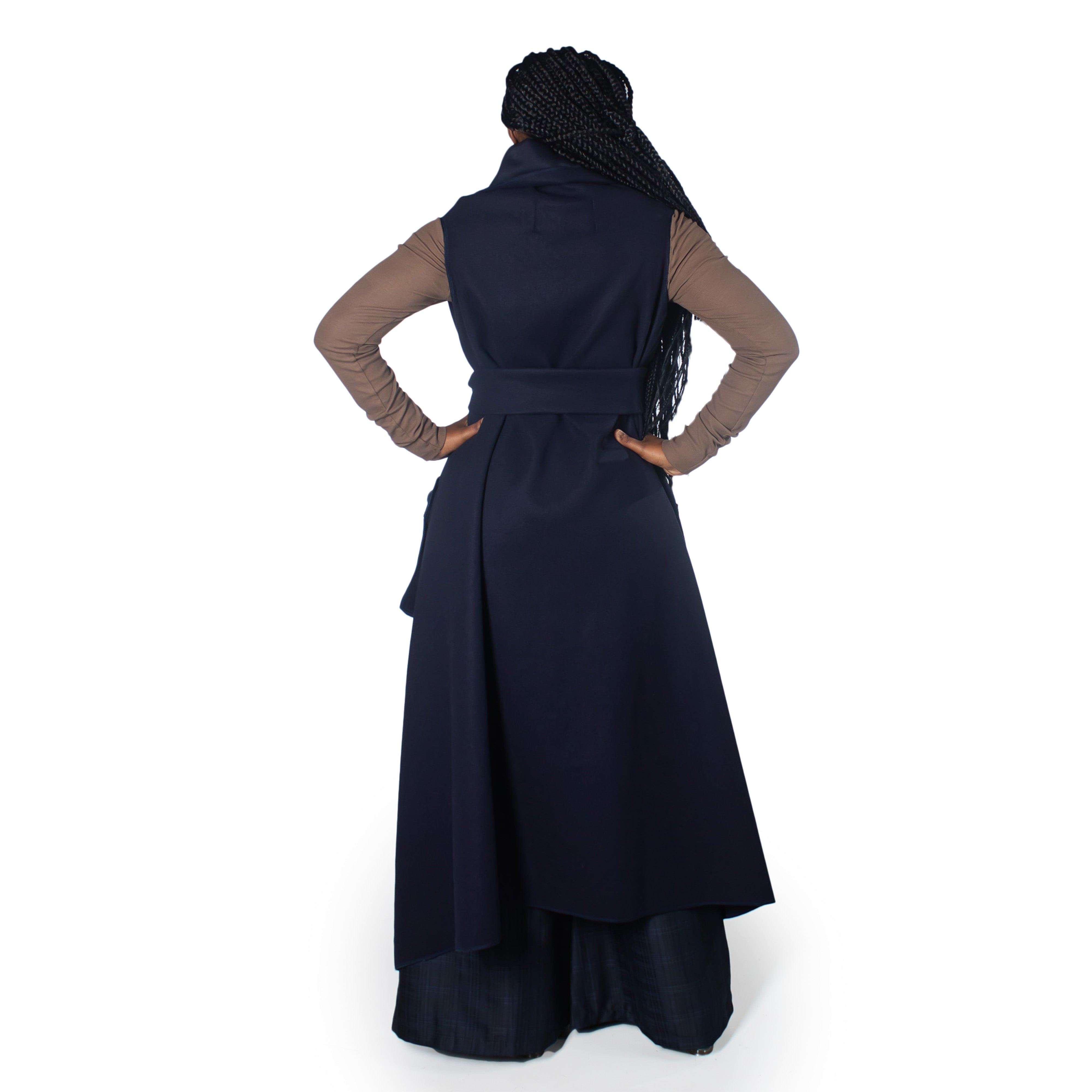 This sleeveless navy coat features a striking oversized collar and a cinched belt for definition. The relaxed, open front design pairs effortlessly over shirts and sweaters, while a functional side pocket adds practicality. Perfect for transitional seasons when you need coverage without bulk.