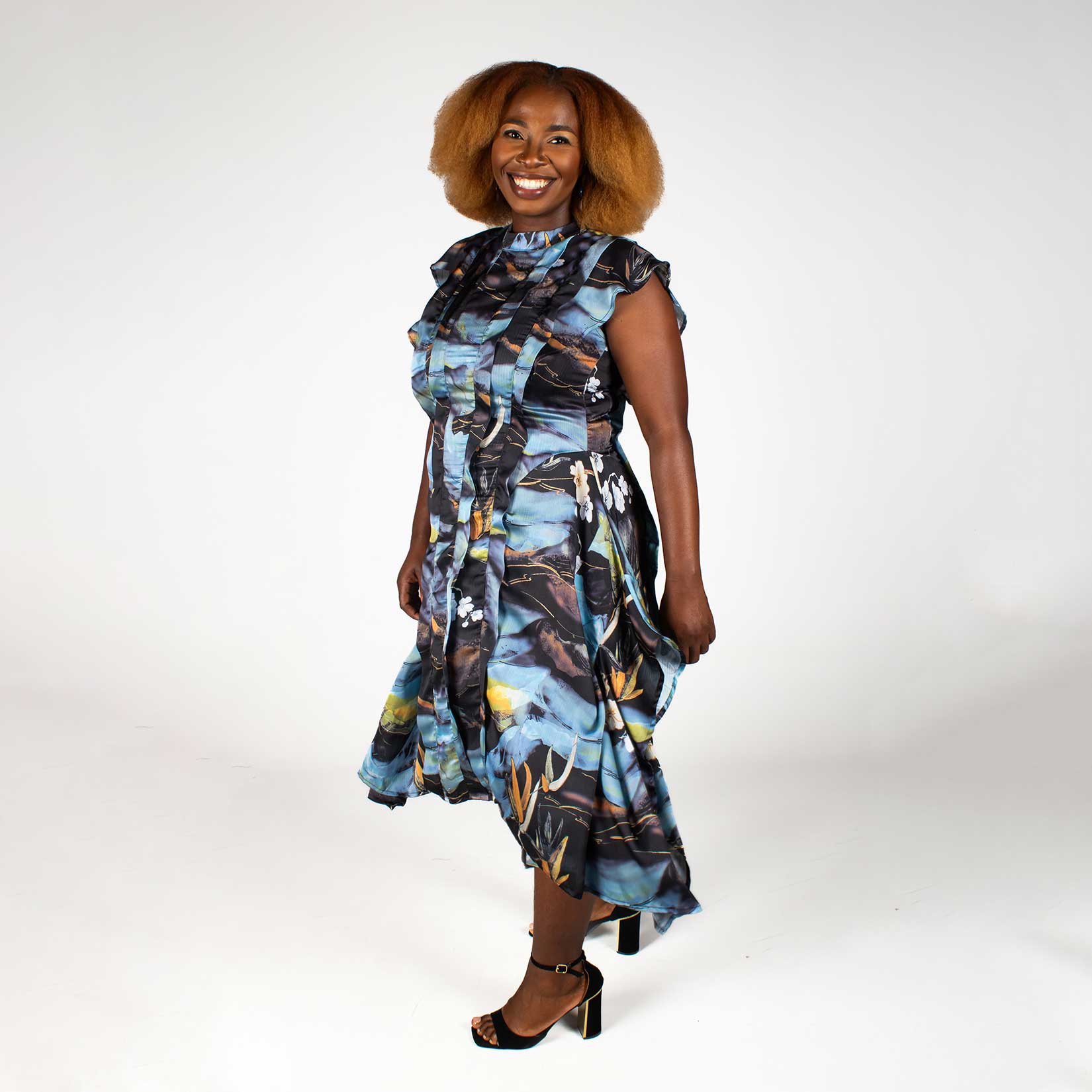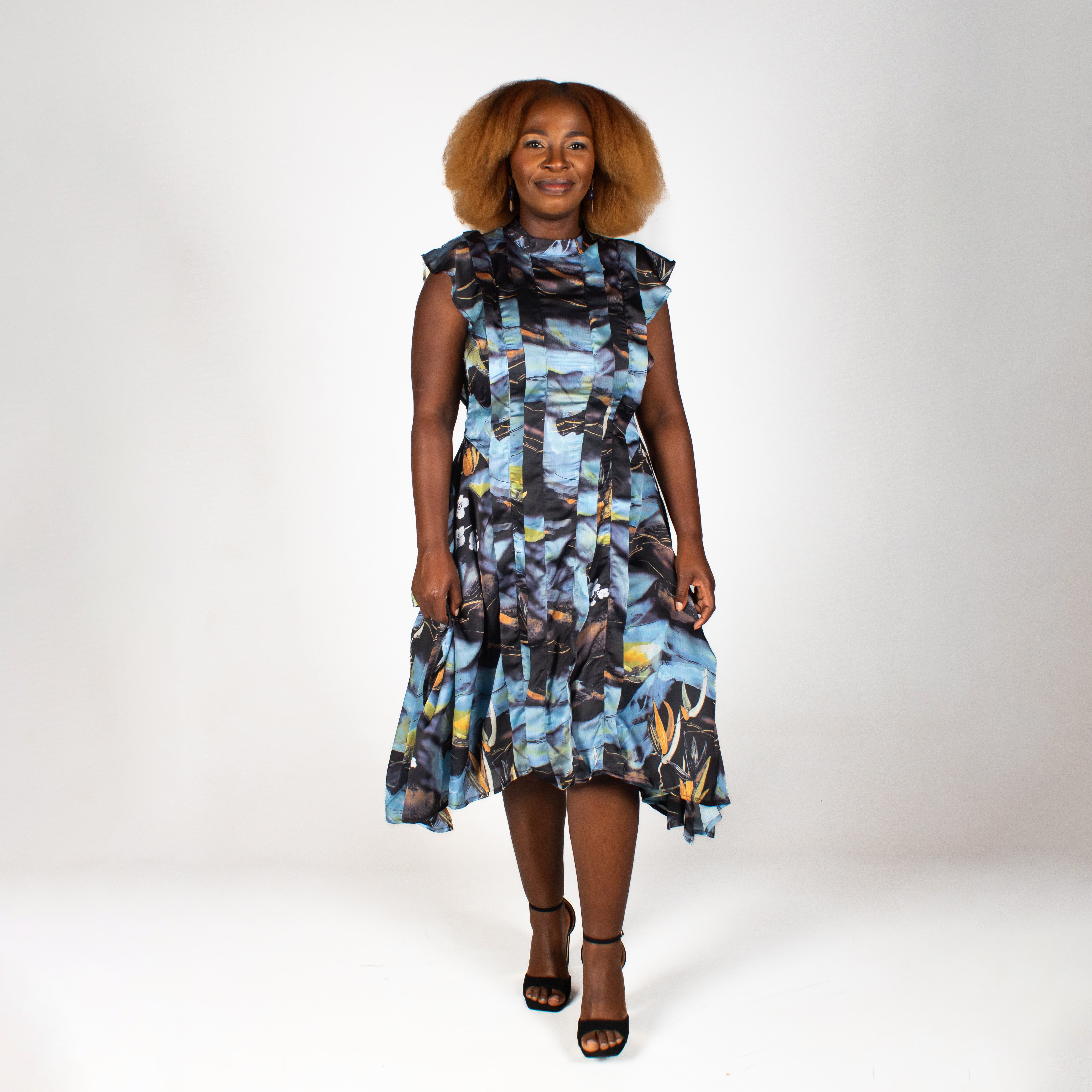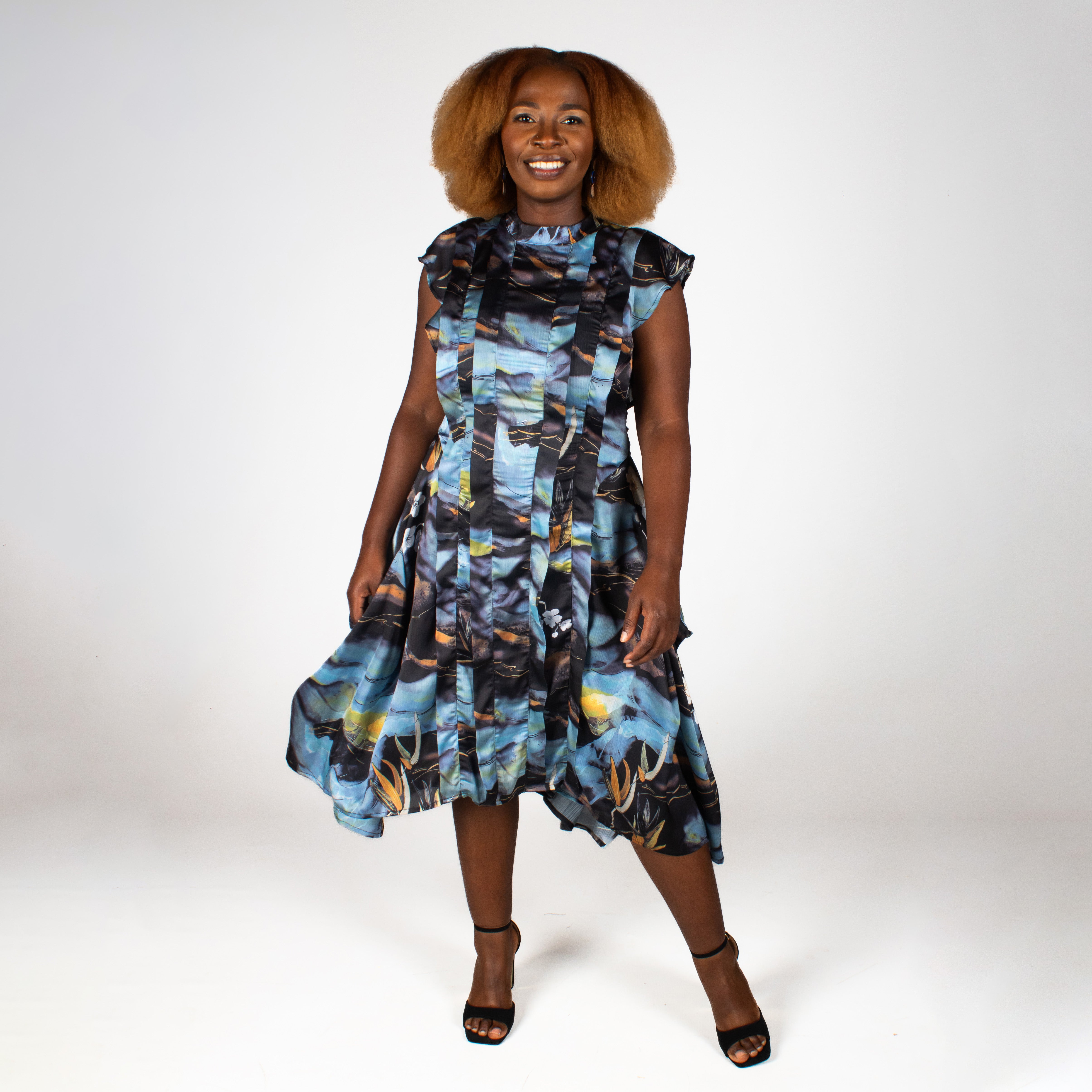 This stunning dress features clever vertical paneling that flatters your figure. The short capped sleeves pair beautifully with a V-shaped skirt that moves with every step. Flap-style panels at the front add dimension, while the back panels sit smooth and sleek. A discreet back zip closure ensures an effortless fit that feels as good as it looks.