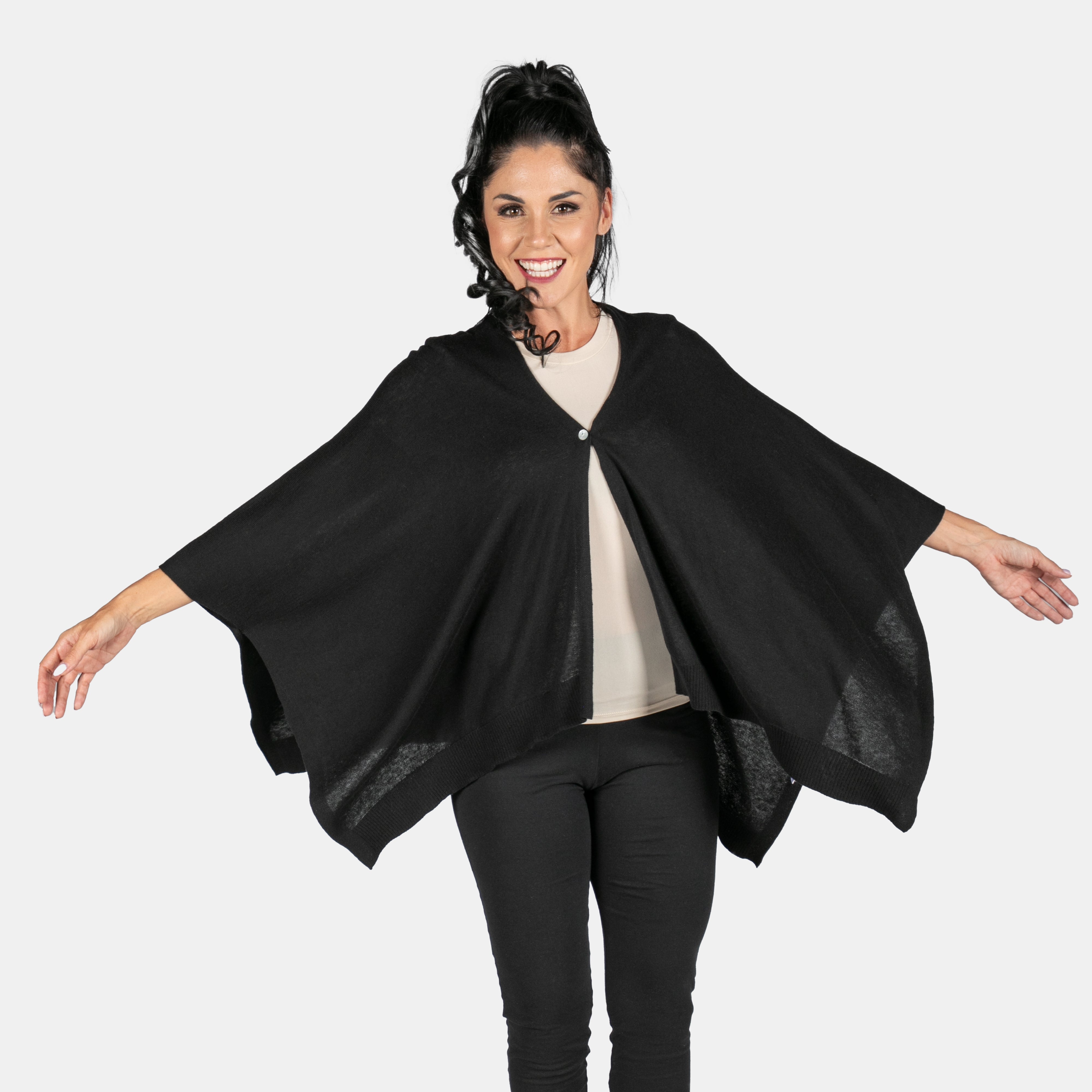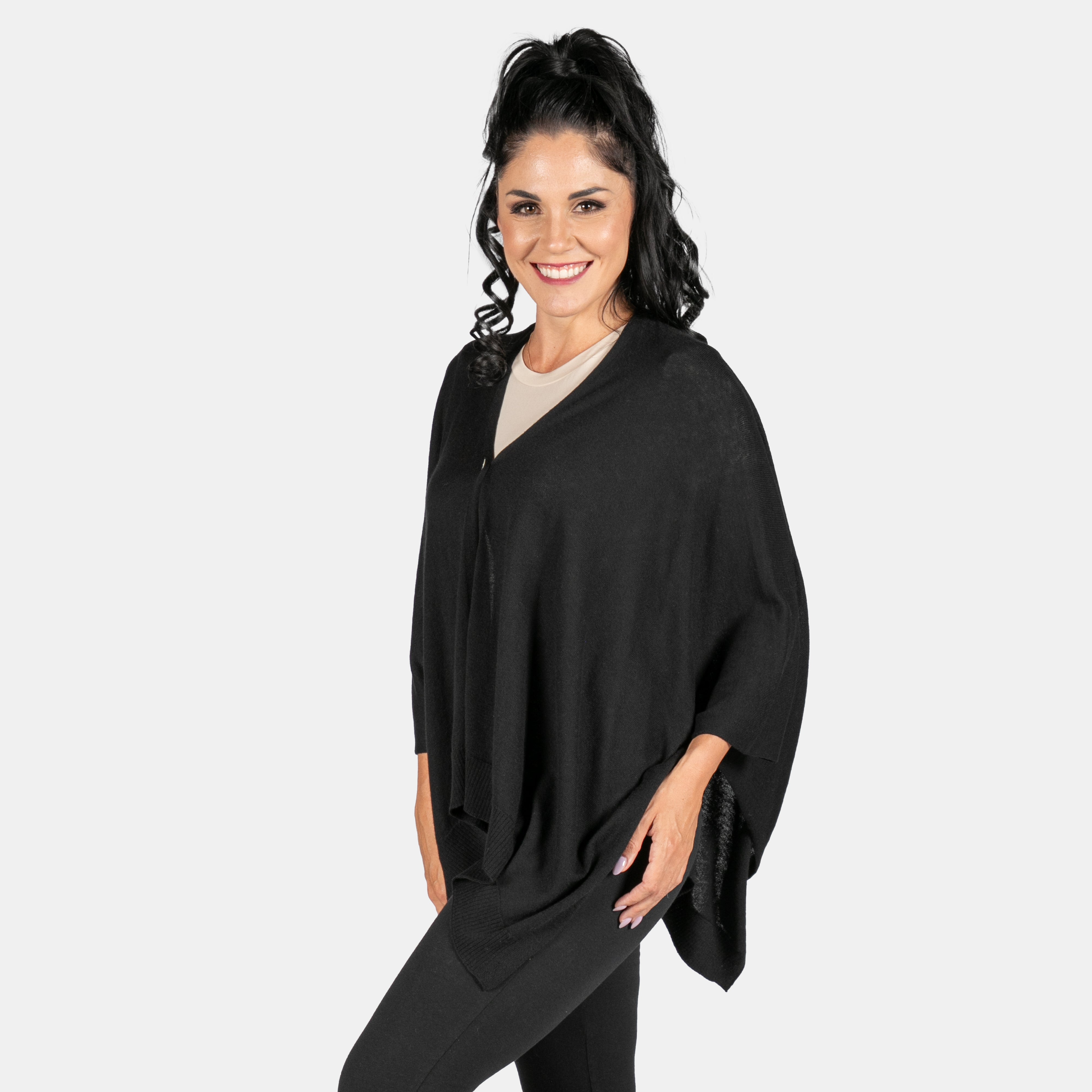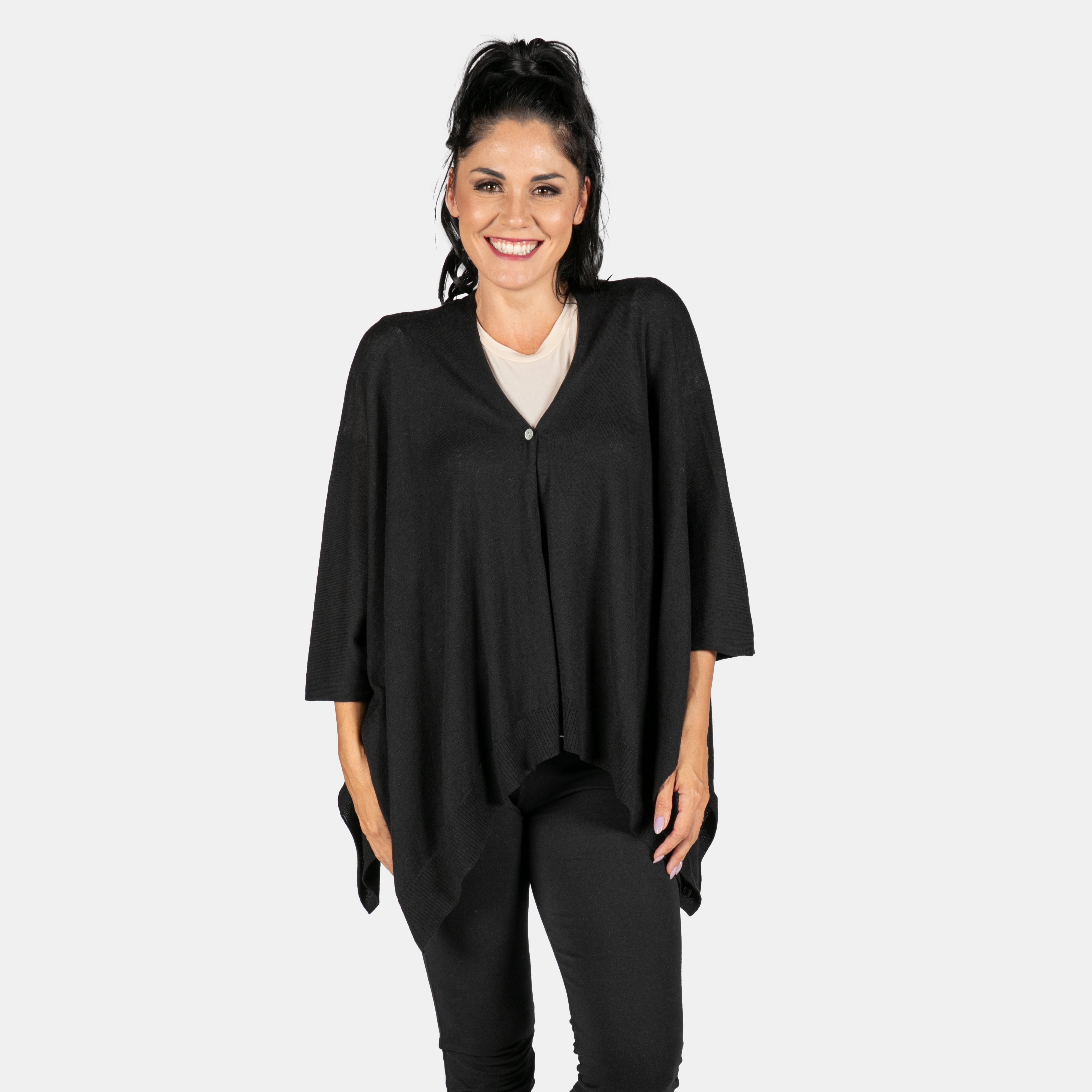 This soft luxury jersey is shaped like a wrap but we've included one little button to help keep it secure. When you close the button you create a V-neck and a wrap that won't move. Wear it traditionally with the closure in front or to the side like an oversized scarf. This jersey will keep you warm during the transition seasons and level up your outfits every time.