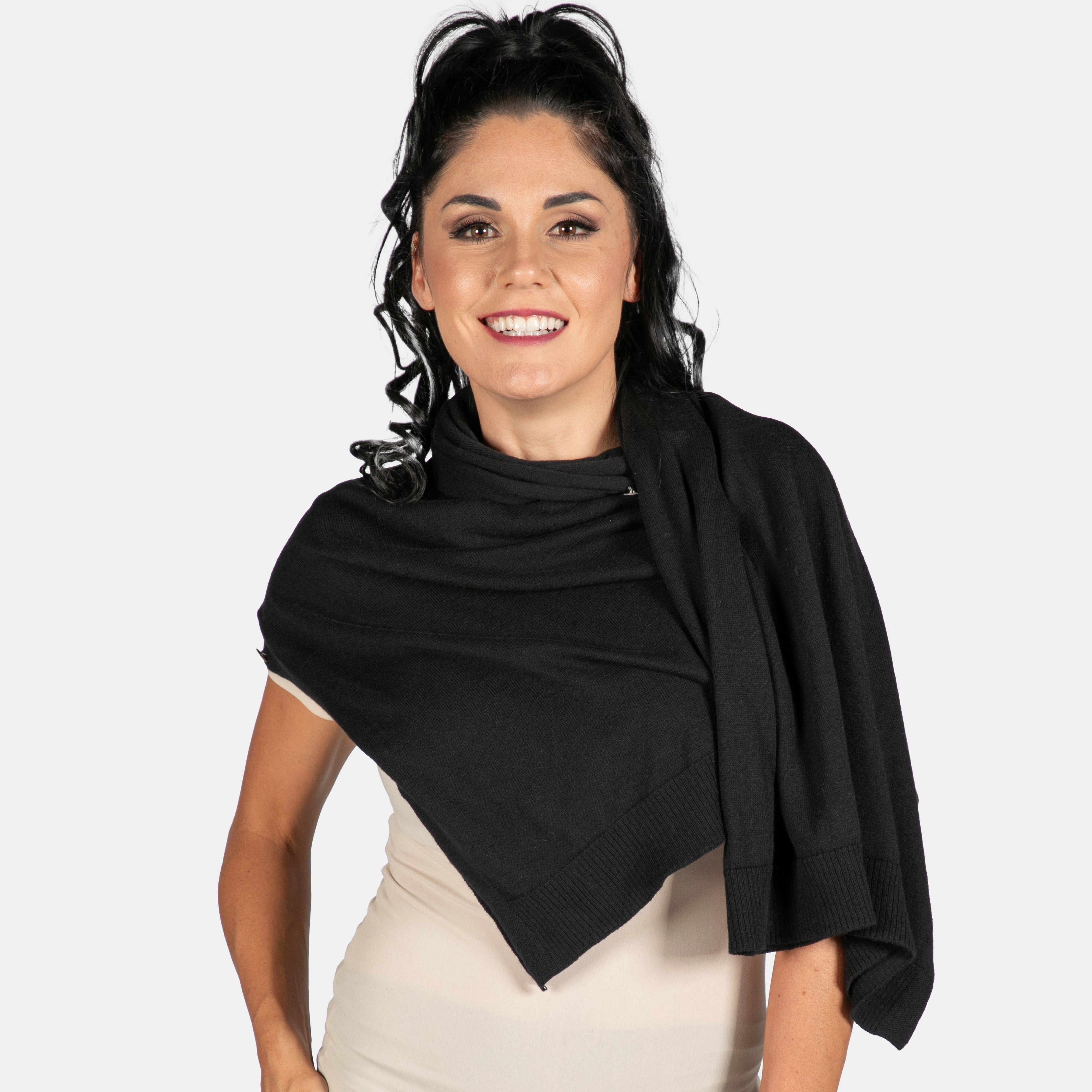 Feels like a pashmina, wraps like a pashmina with none of that slipping off drama. Available in punchy Teal and timeless Black.