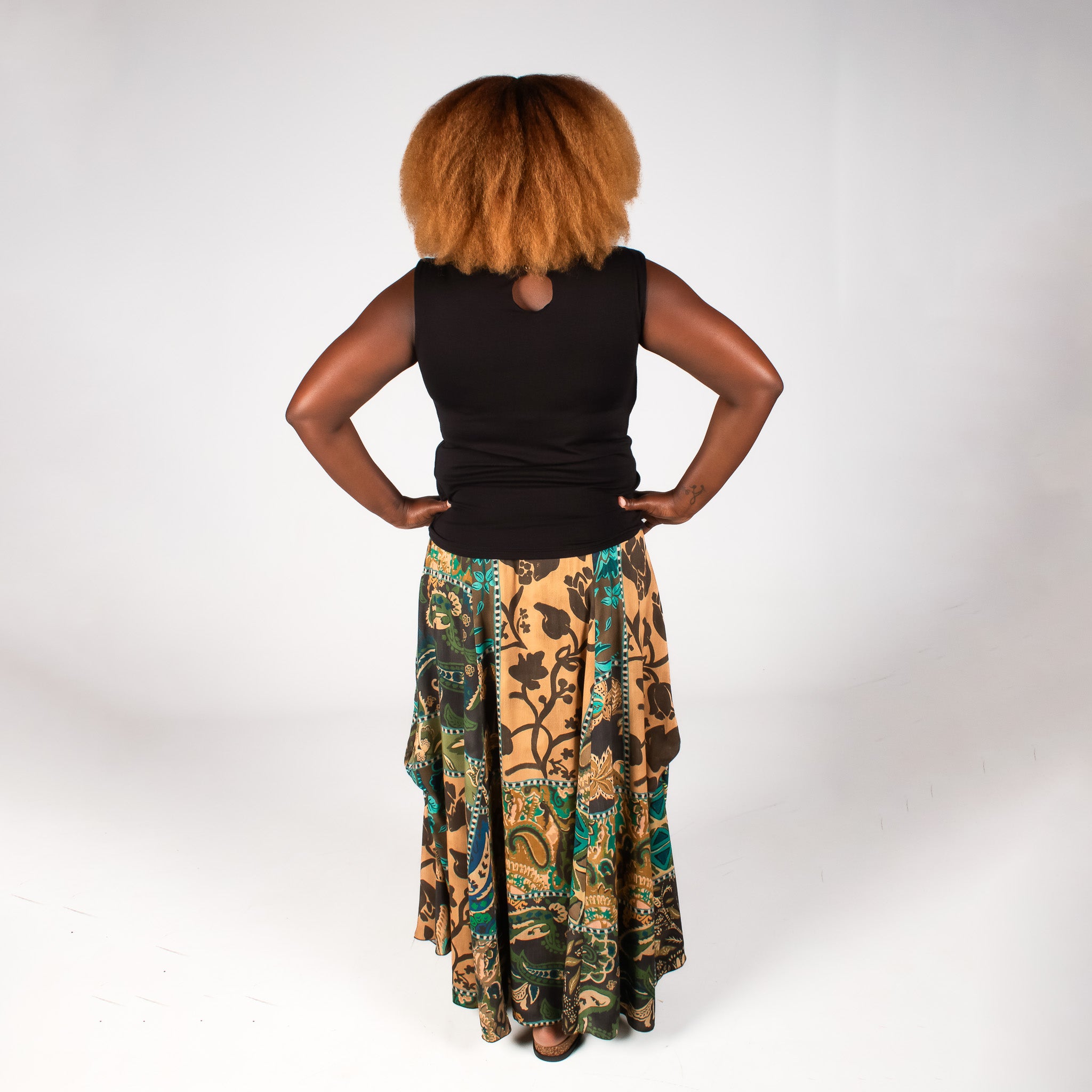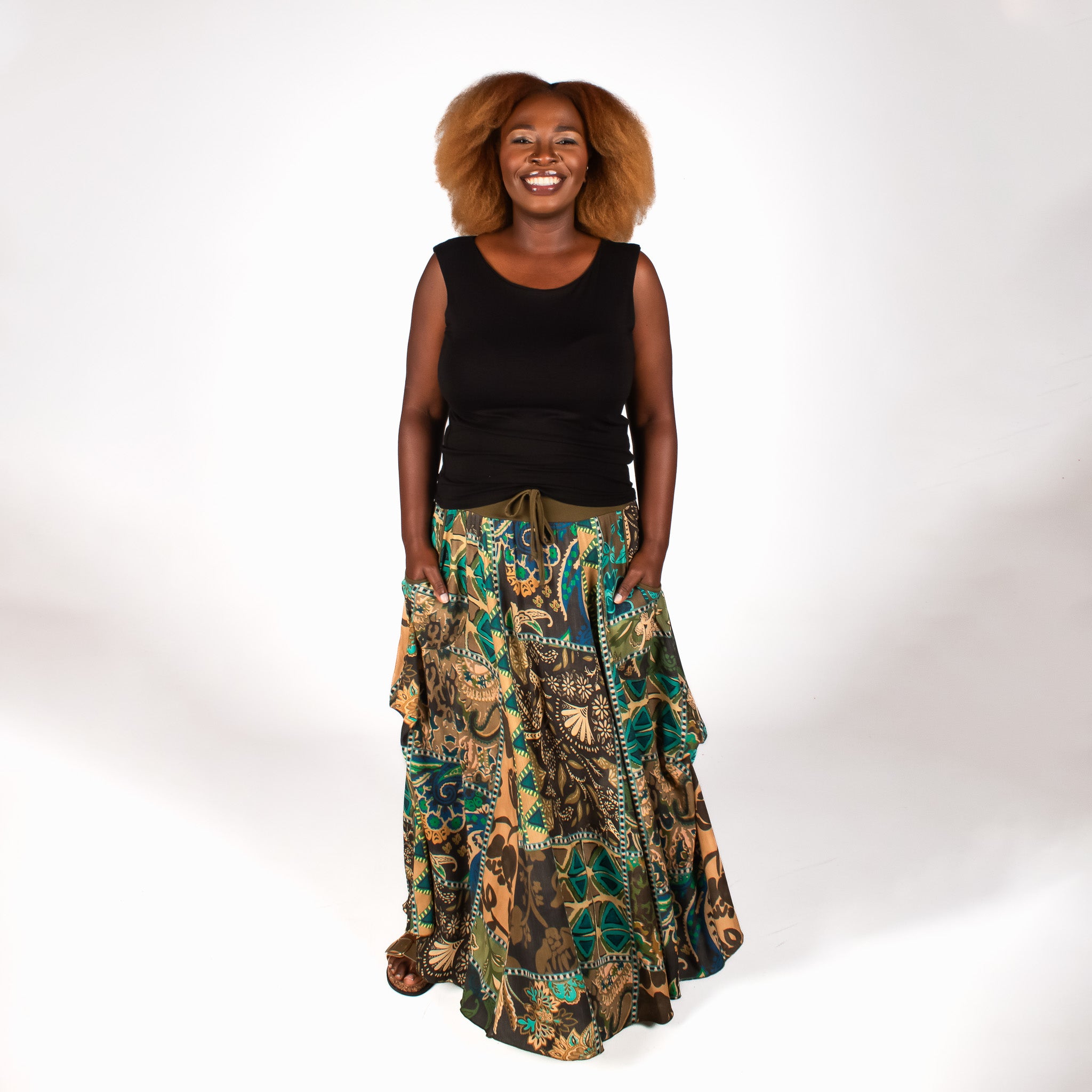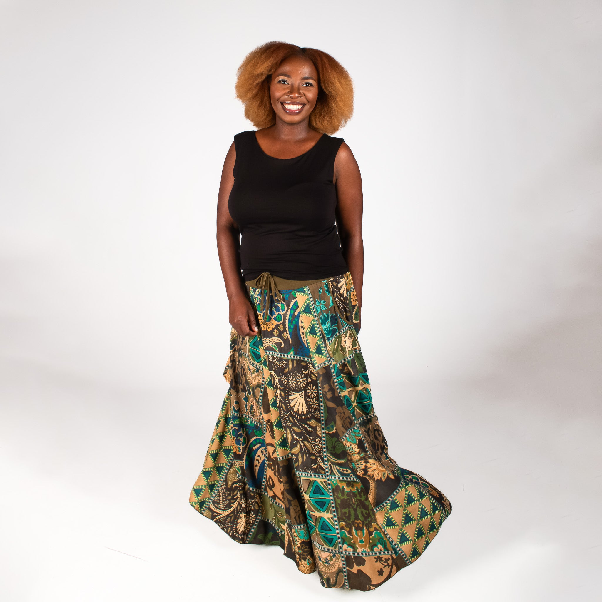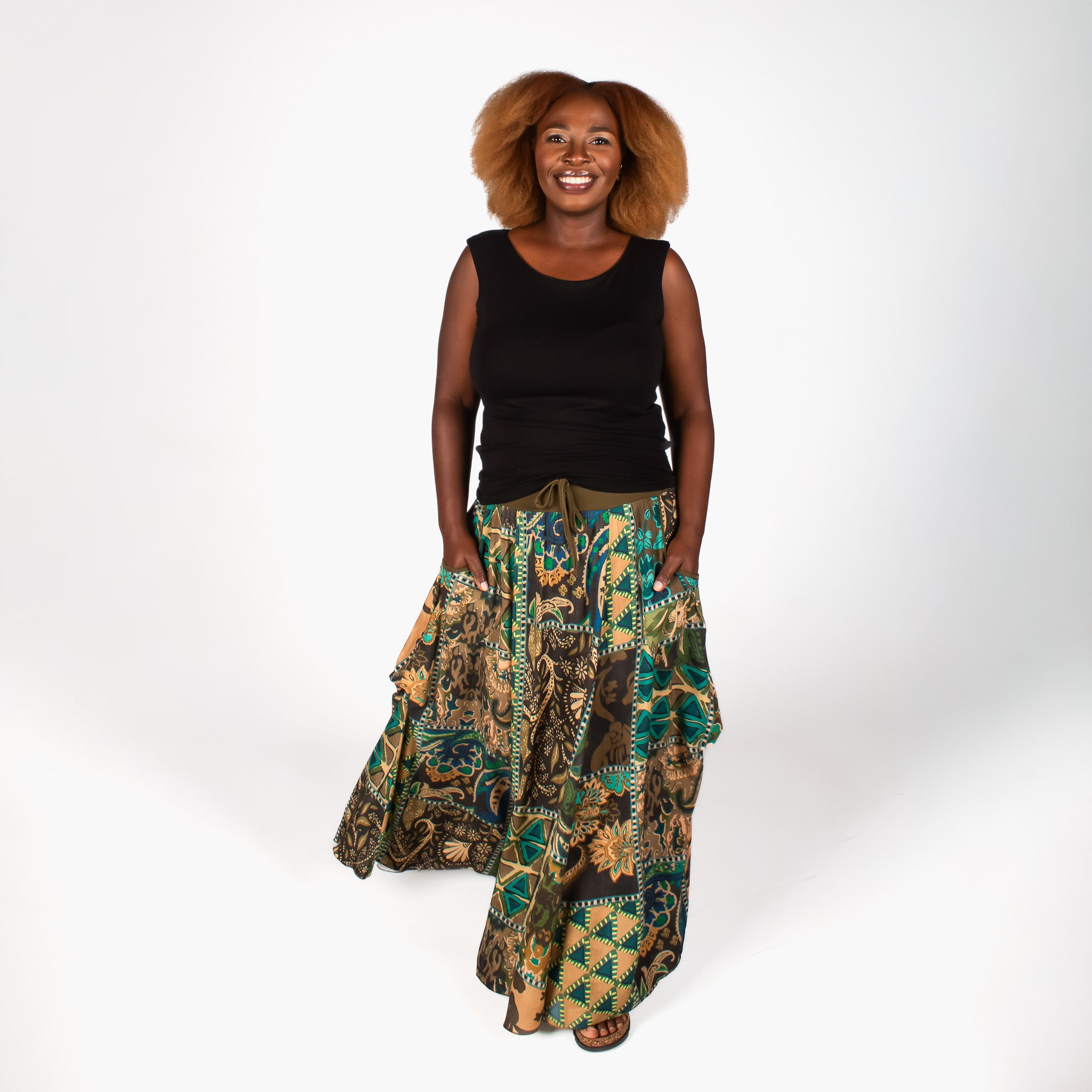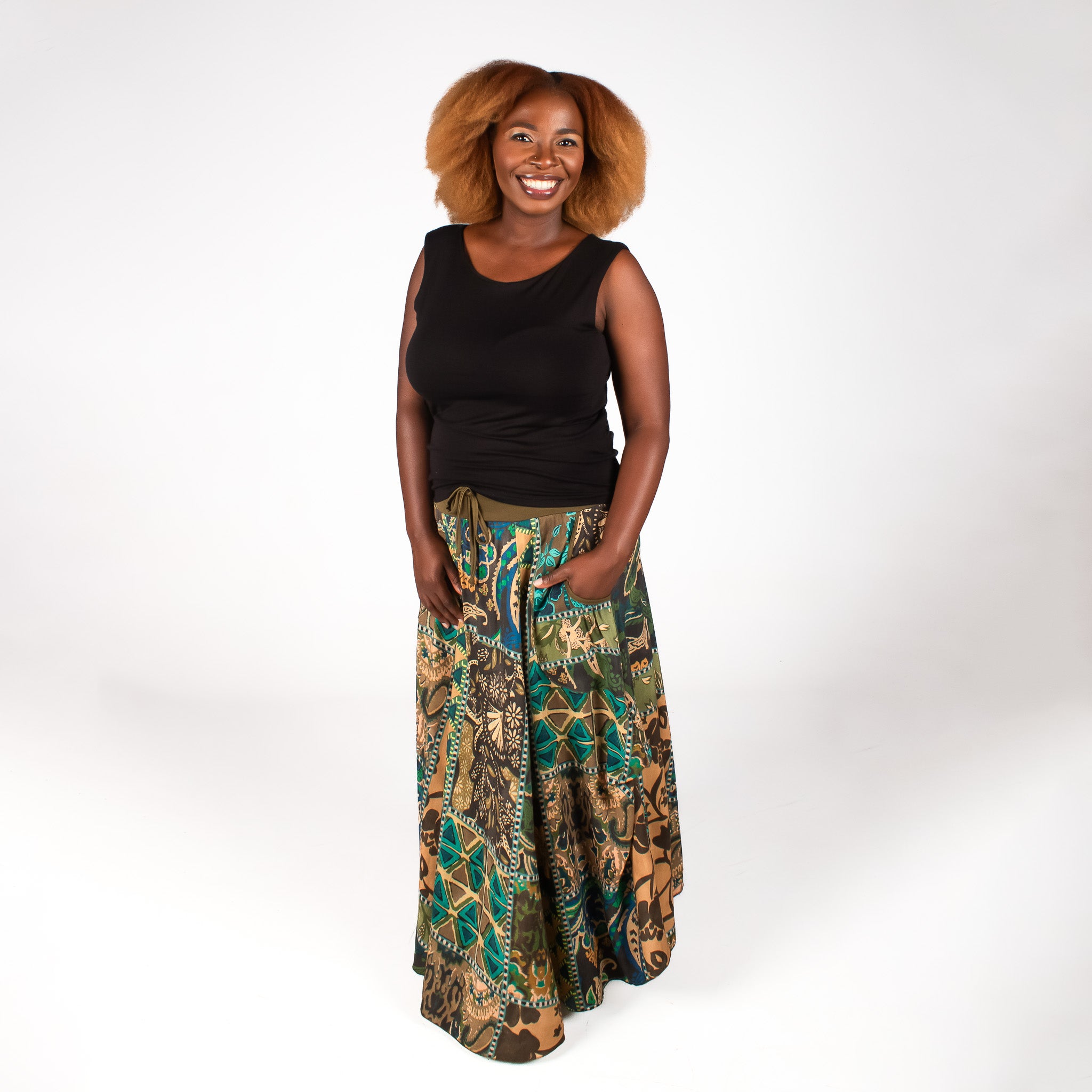 The pretty floral print fabric with the binding on the hem and waistband are what make the statement here. Four vertical panels are joined by a soft stretch waistband which makes dressing quick and easy and ensures you stay comfortable all day long. Big bound pockets on each side and a faux tie in the waistband center add to the detail on this timeless skirt.