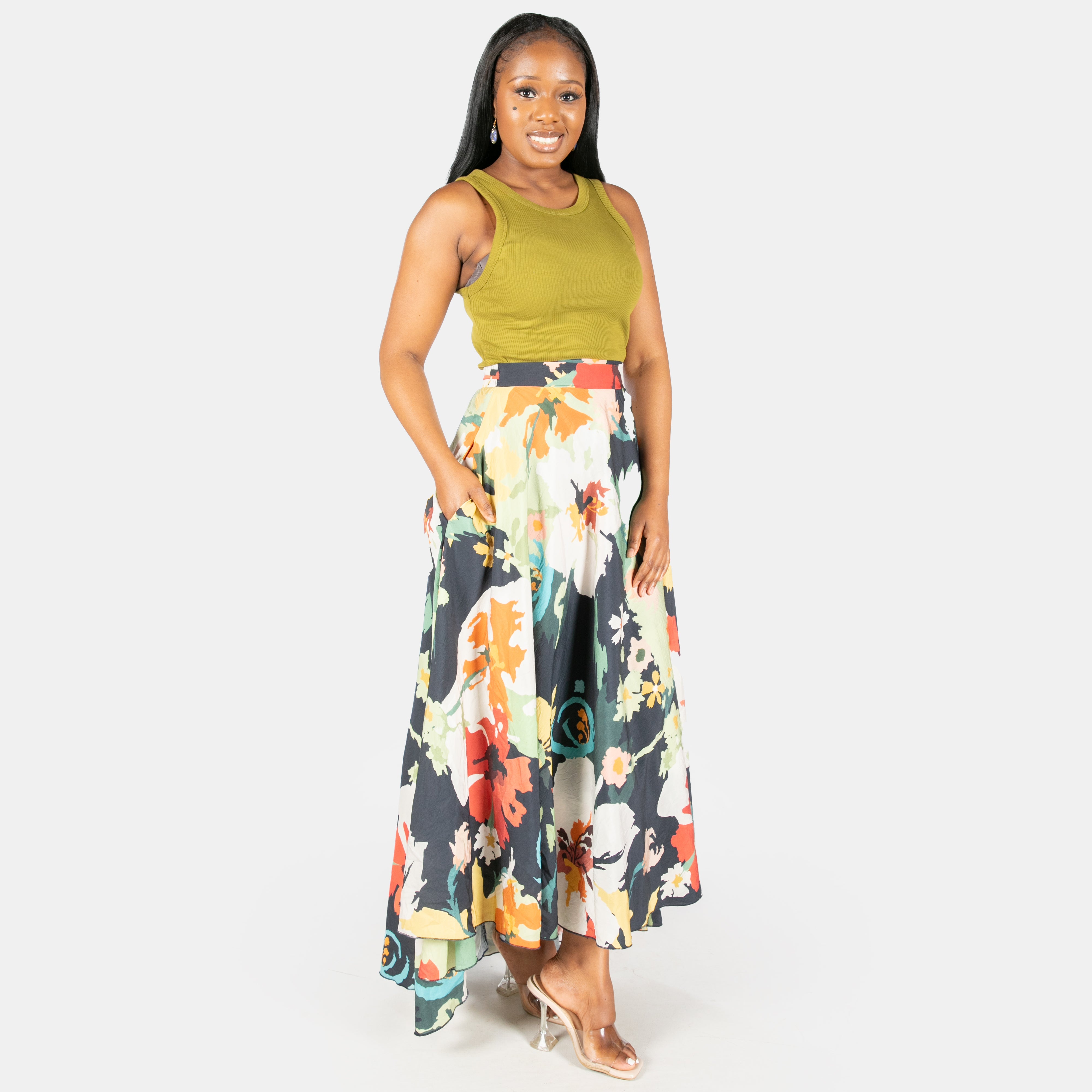 The Babylon skirt features a waistband that is flat in front and elasticated in the back for stretch, it has an attached belt that threads through the side to tie at the back. This long skirt has a hi-lo hemline, loads of volume and is sure to make you feel fantastic as you wear it. Flats or heels are perfect!
