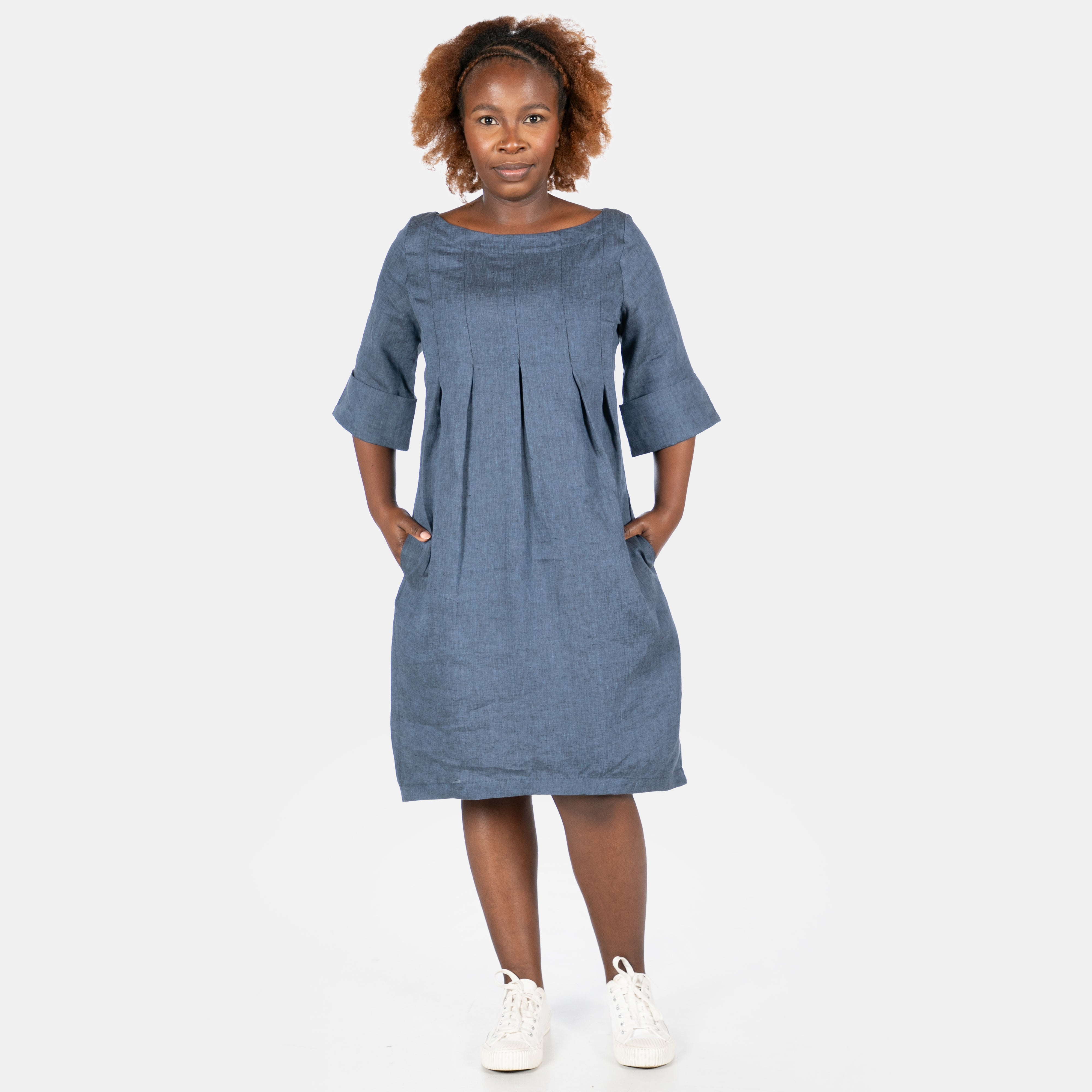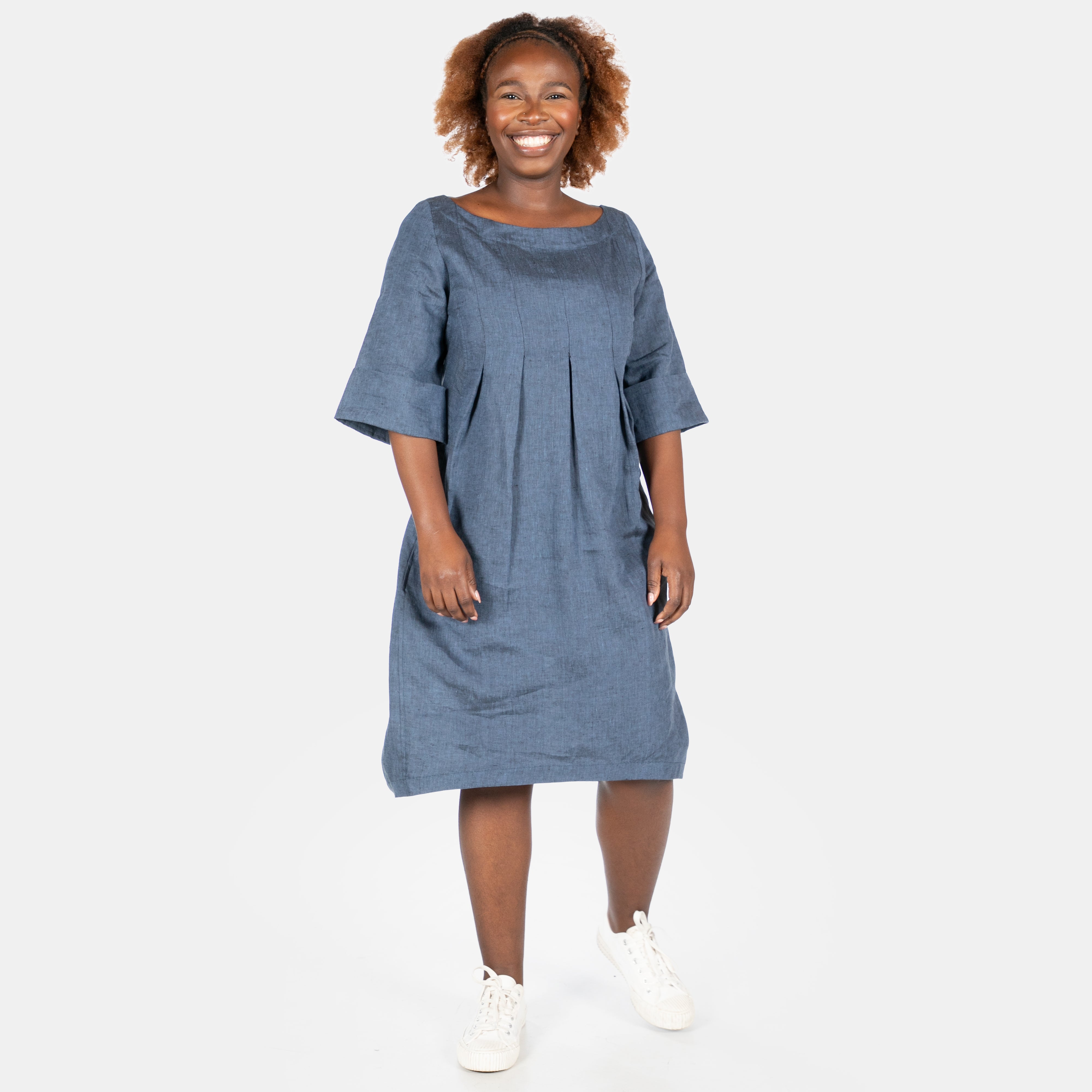 This charming Blue linen dress features a relaxed boat neckline and three-quarter sleeves with chunky cuffs.