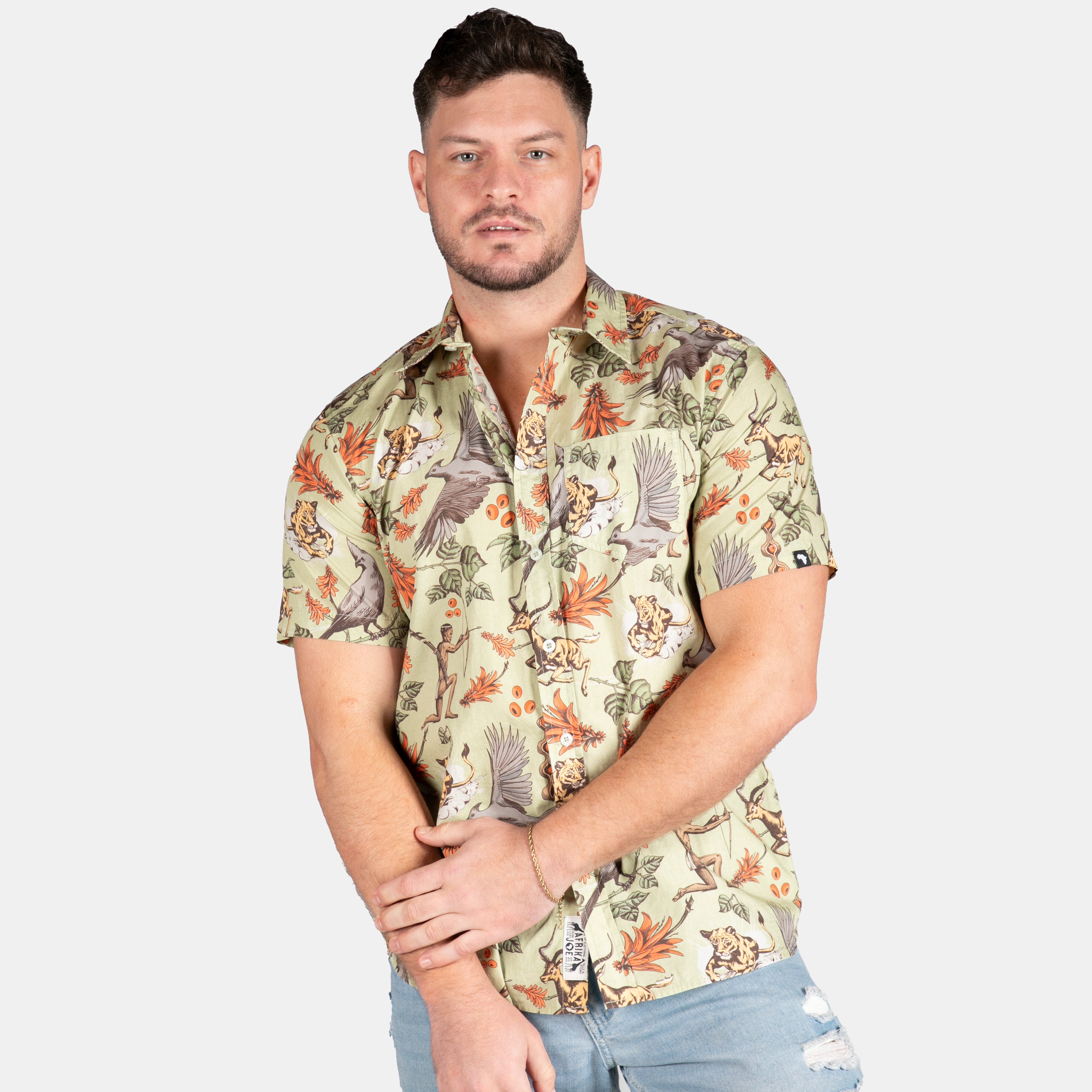 Step into the wild with Afrika Joe's latest collared essential. This short-sleeved olive shirt boasts a crisp button-up front and classic collar that's ready for adventure. Pair it with the matching shorts for a coordinated look, throw it on with jeans for casual cool, or top it off with the bucket hat for full safari vibes.