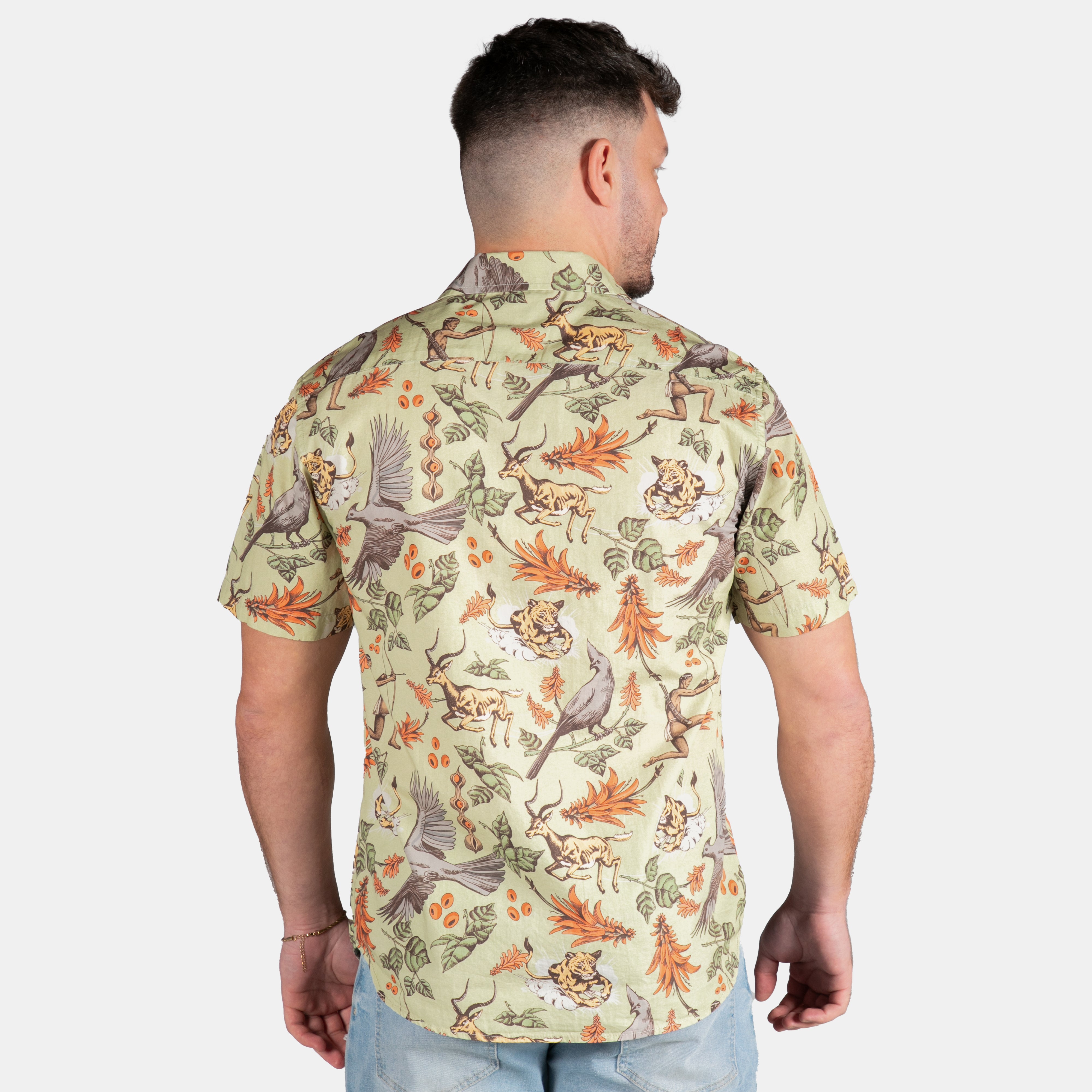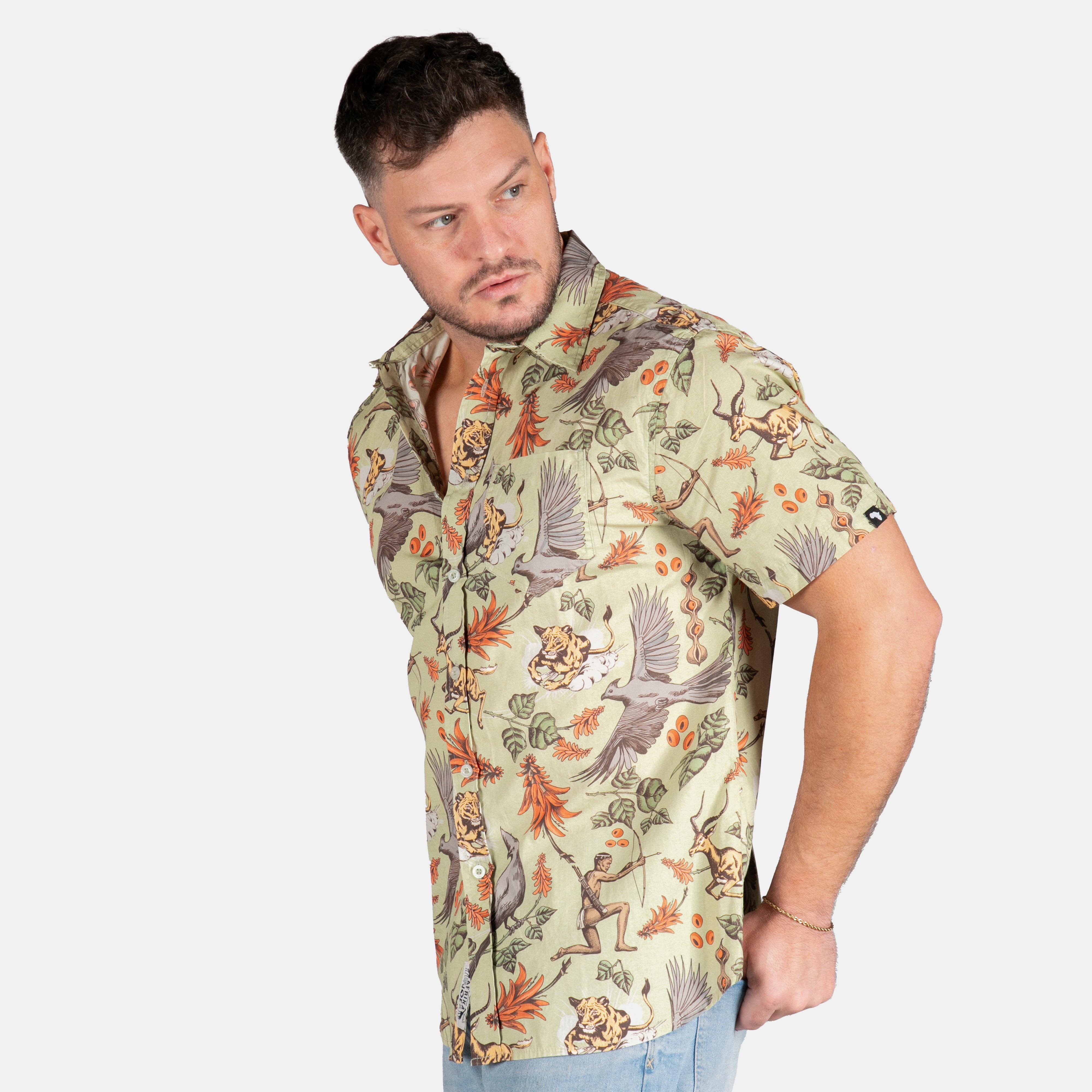 This premium shirt for men pays homage to the traditional hunters of the bushveld. Featuring a collection of small paintings depicting their skills and celebrating the wildlife and beautiful details of the African bushveld. Proudly South African art!