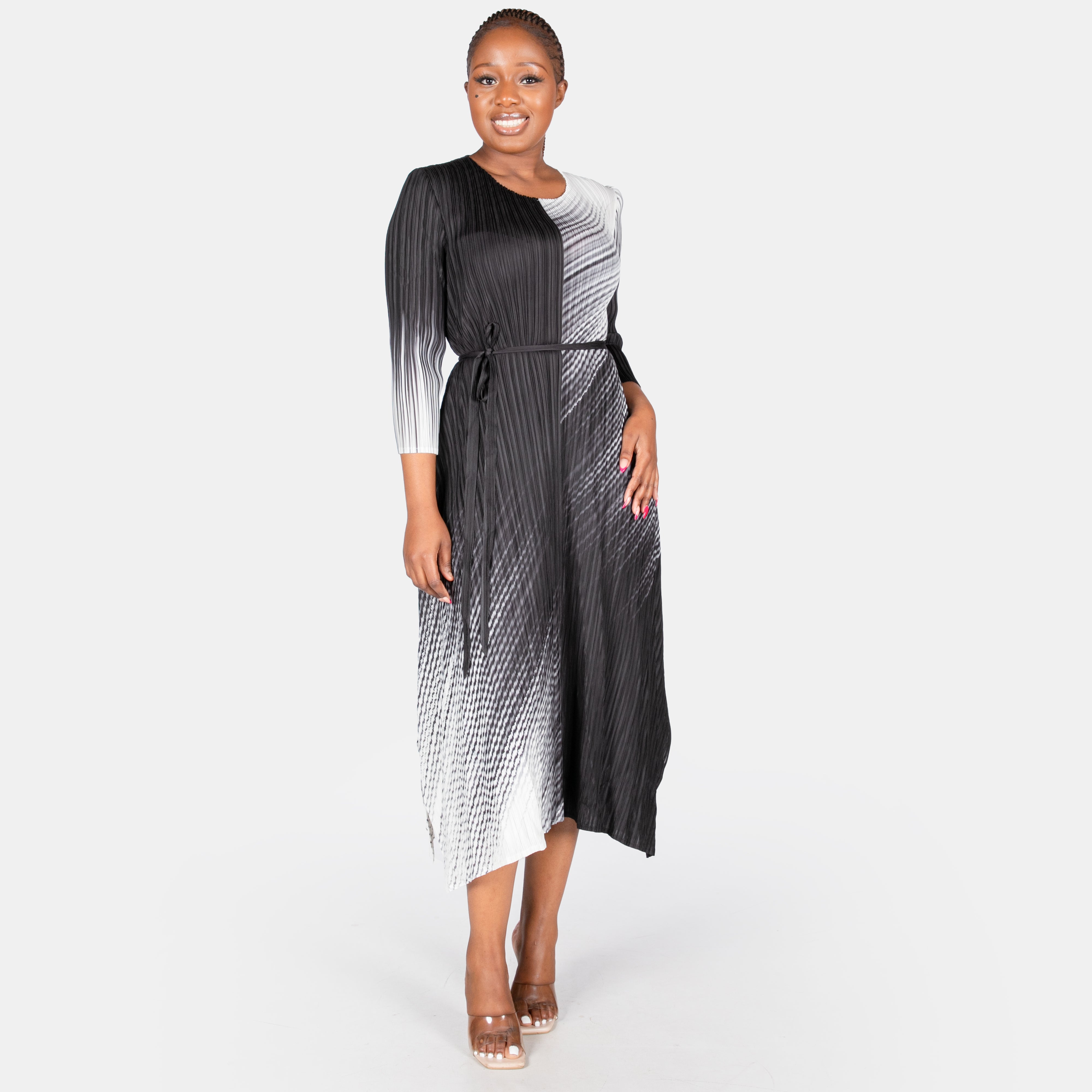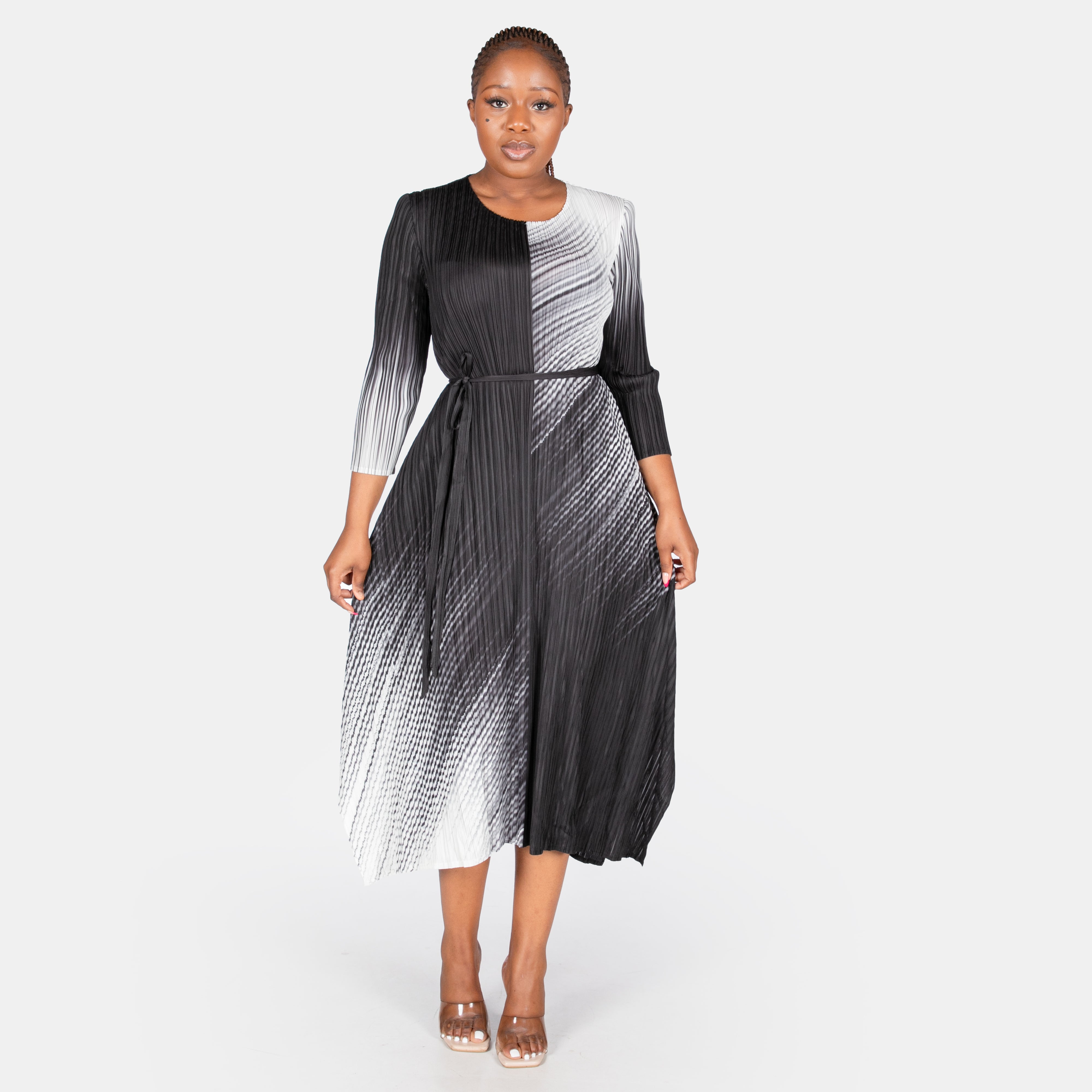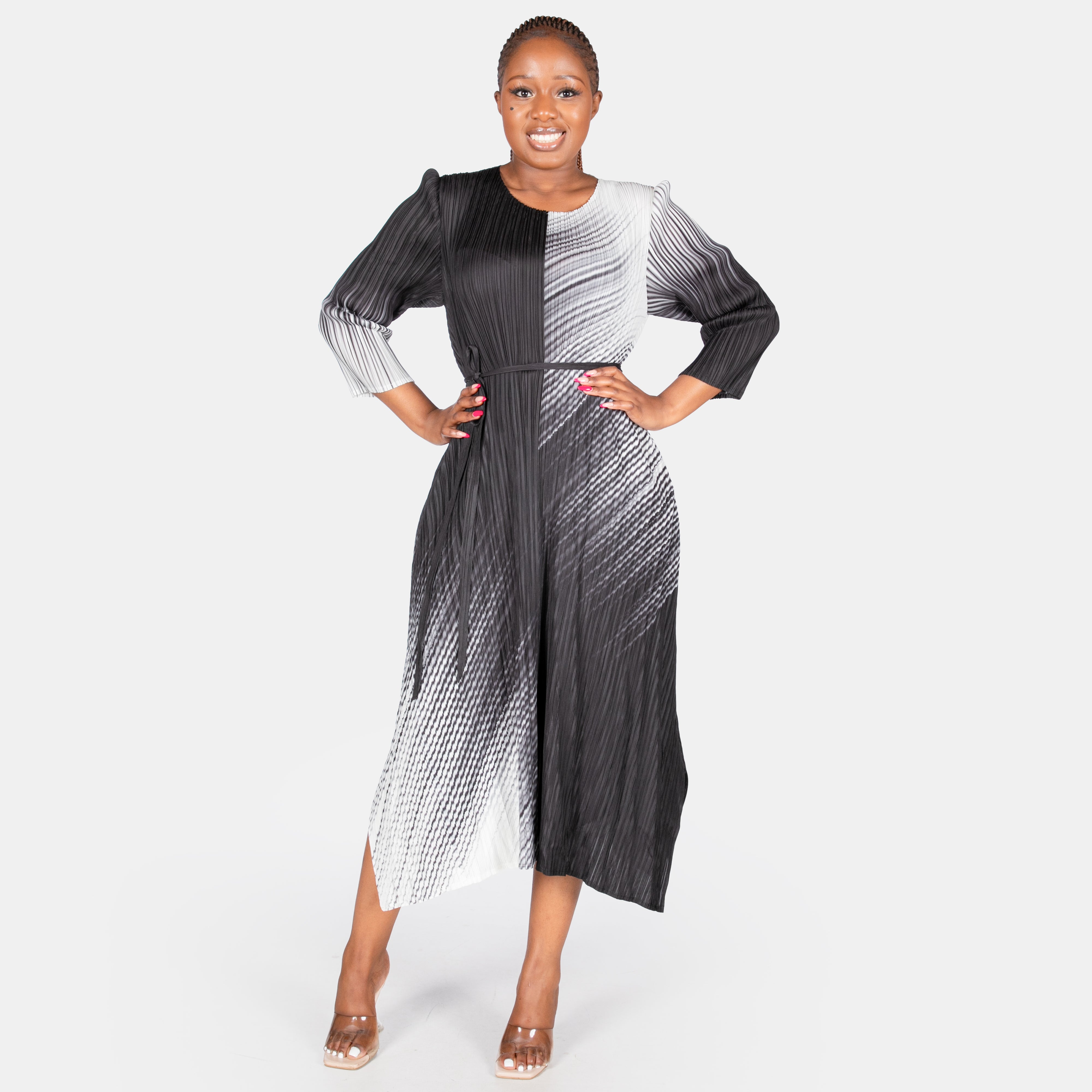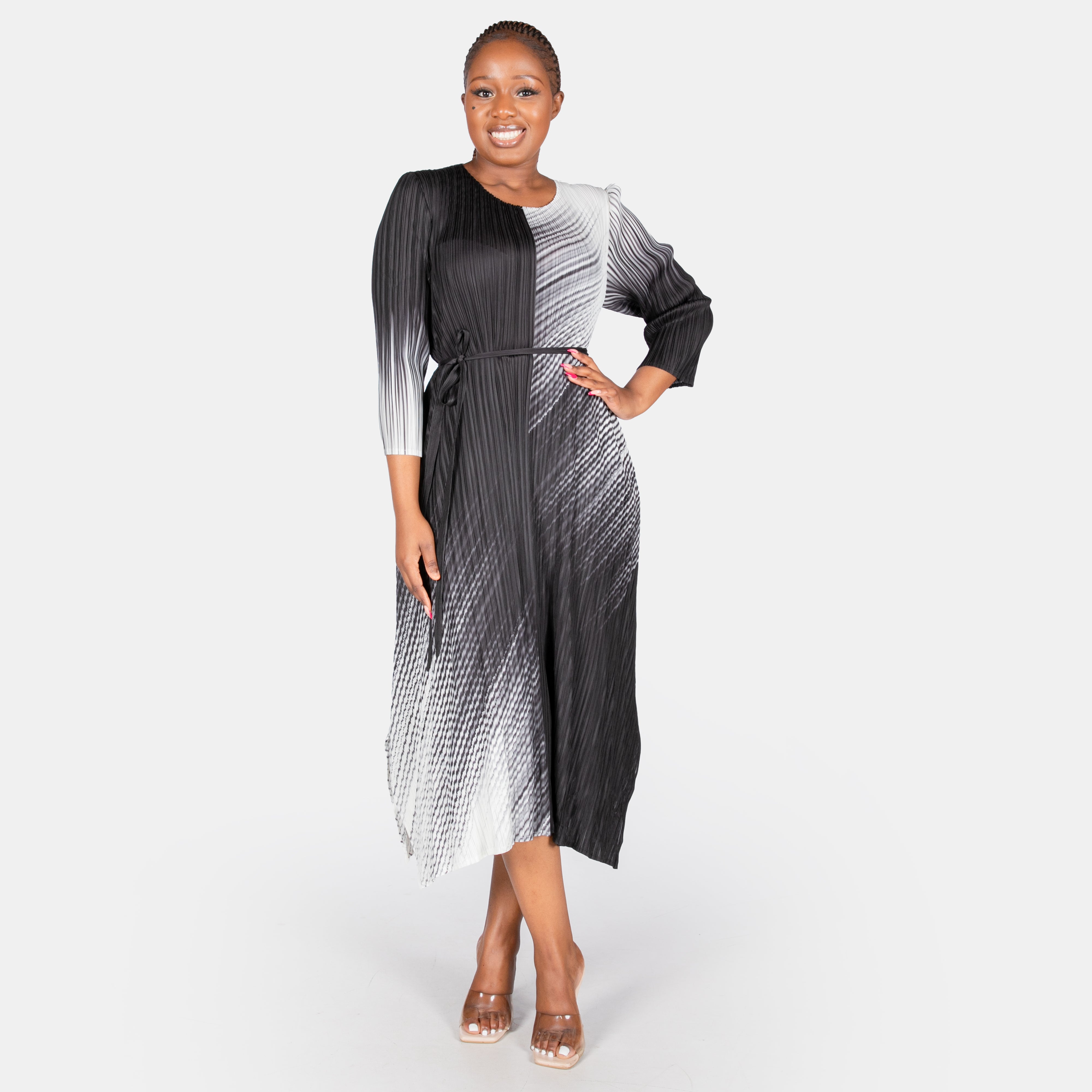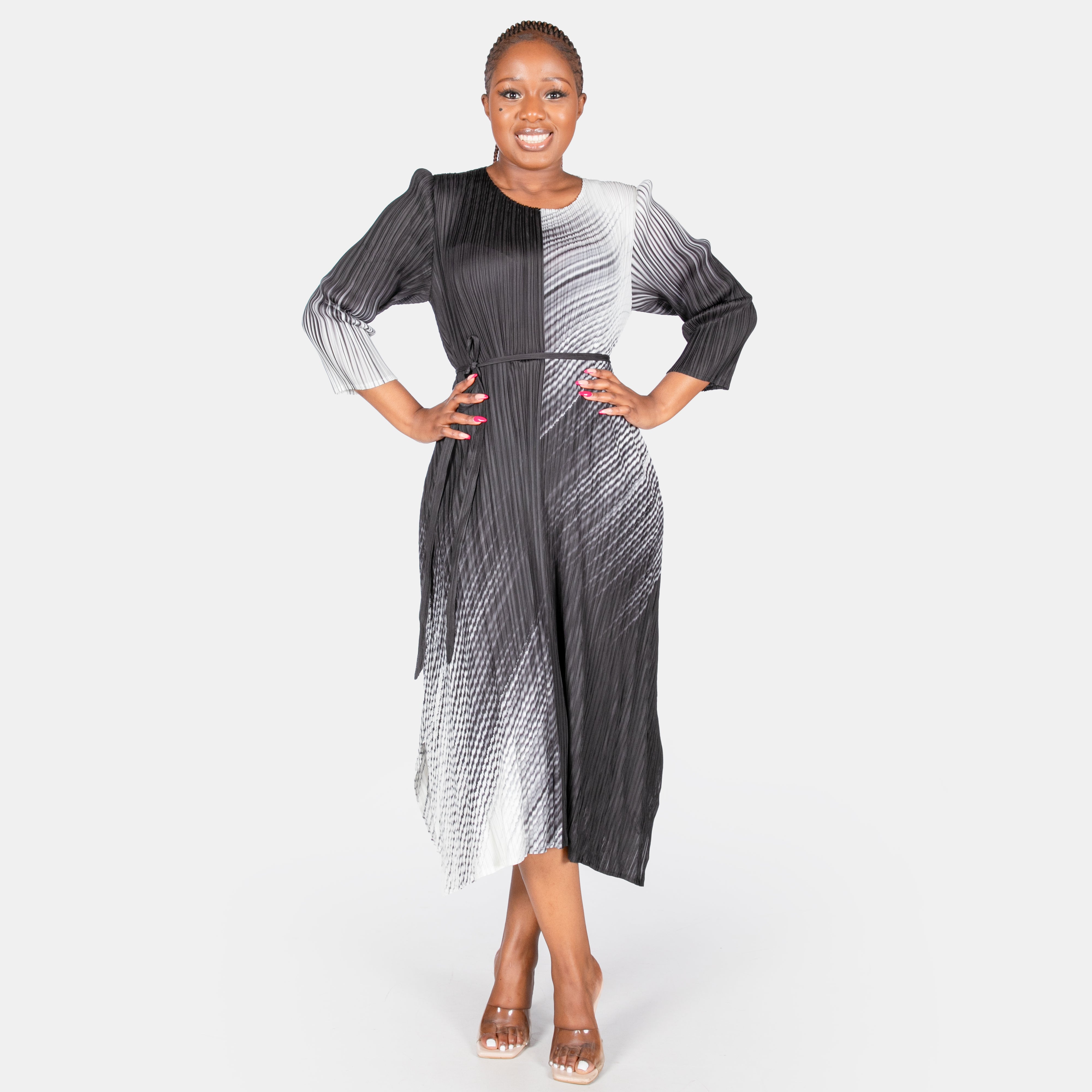 The Georgia dress is your answer to smart occasions and business travel. Crafted from a delicate permanent pleat fabric that requires no ironing and fits over your bust and hips, no matter their size. In fact, your dress can be rolled in a ball and worn straight away. She features a round neck, long sleeves and a straight cut to mid calf. You will notice small slits at the sides and a detachable soft tie belt at the waist. Georgia is definitely more dynamic in heels. One size fits most.