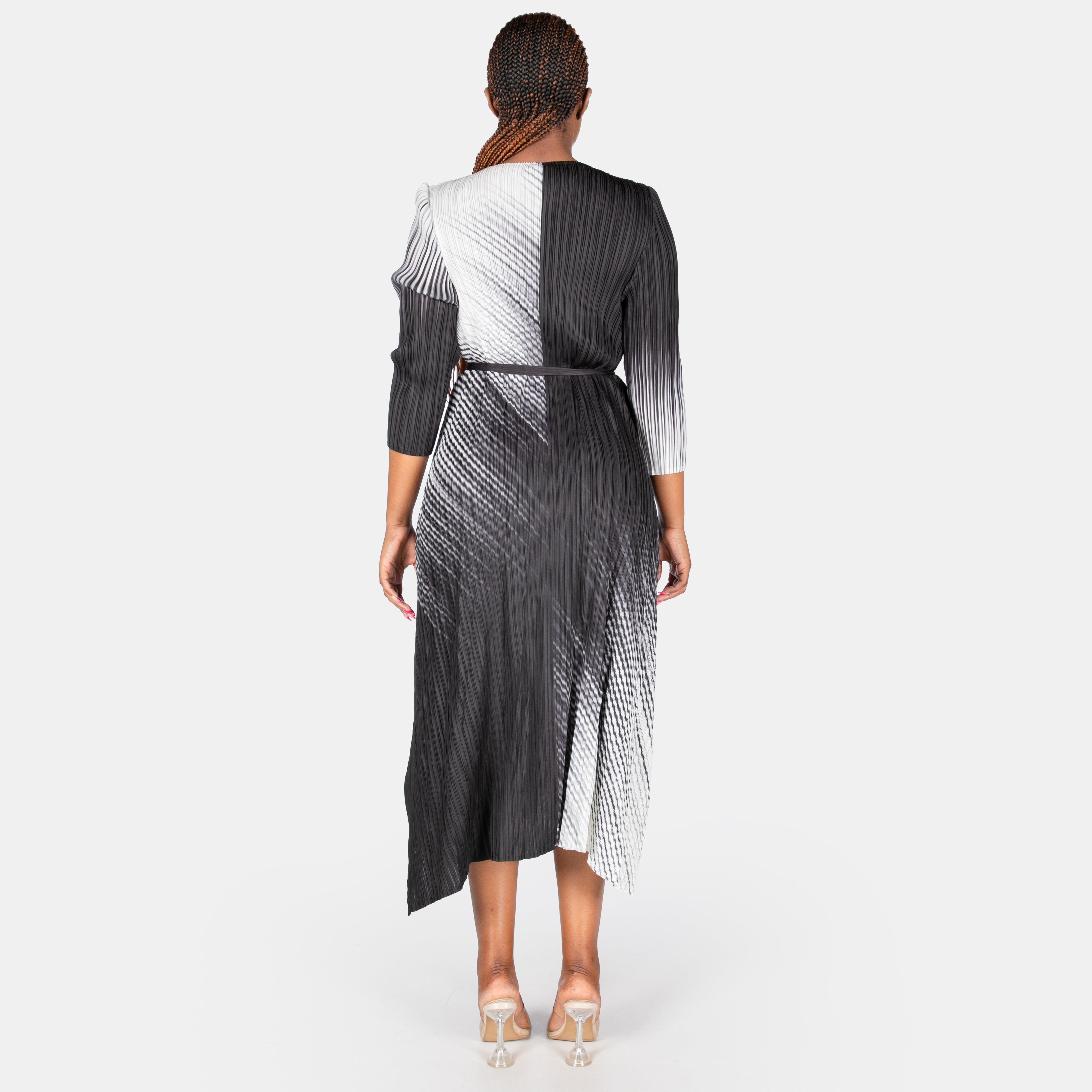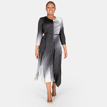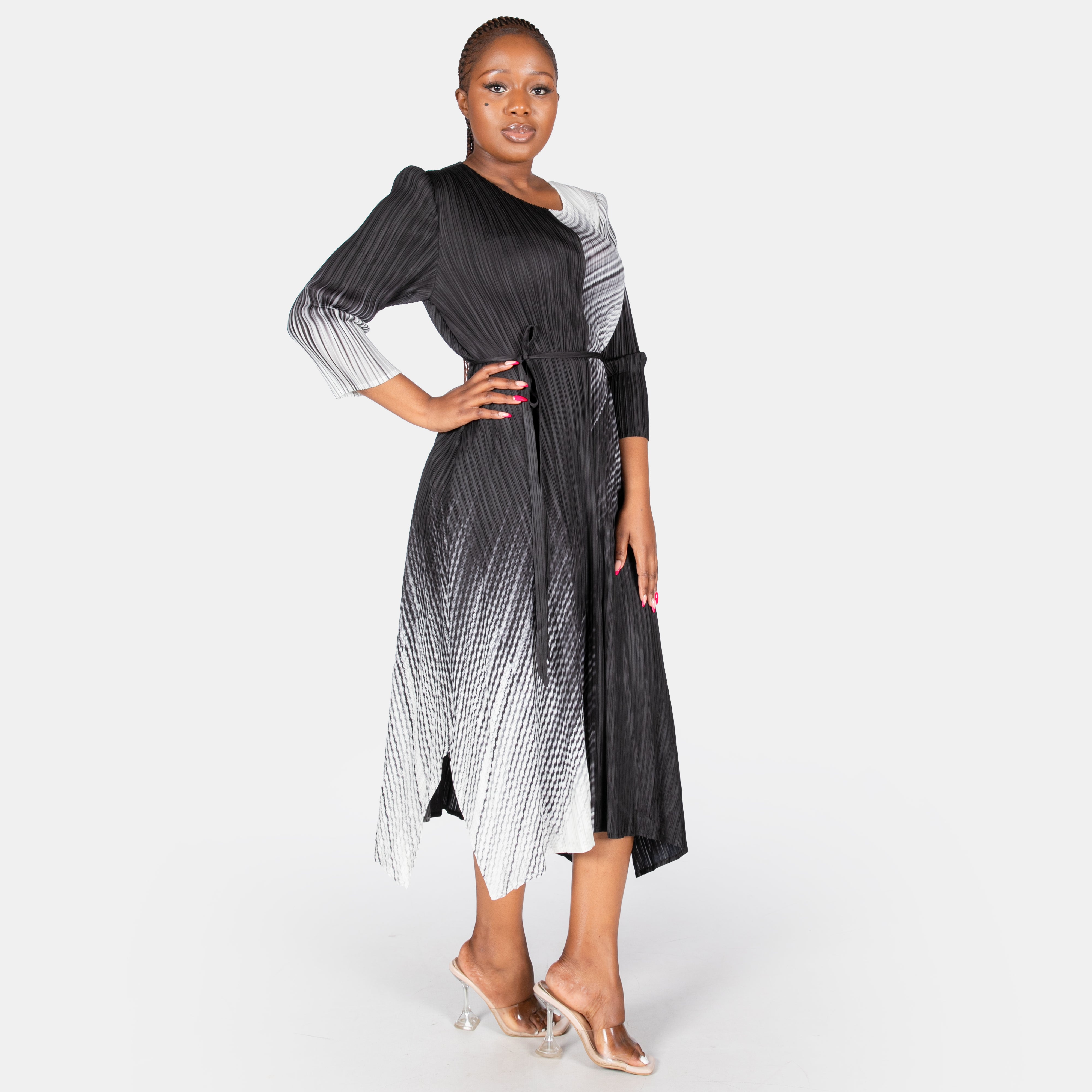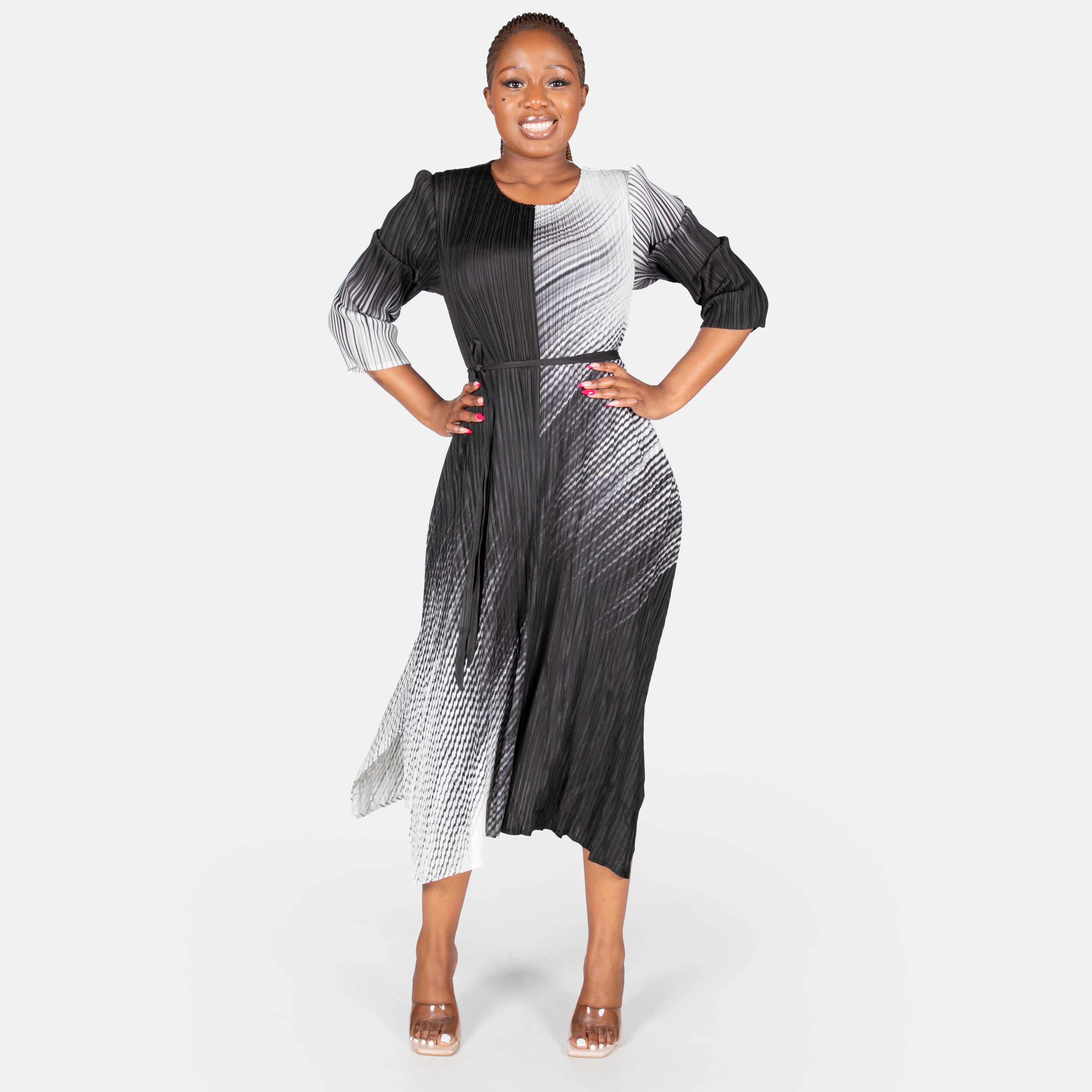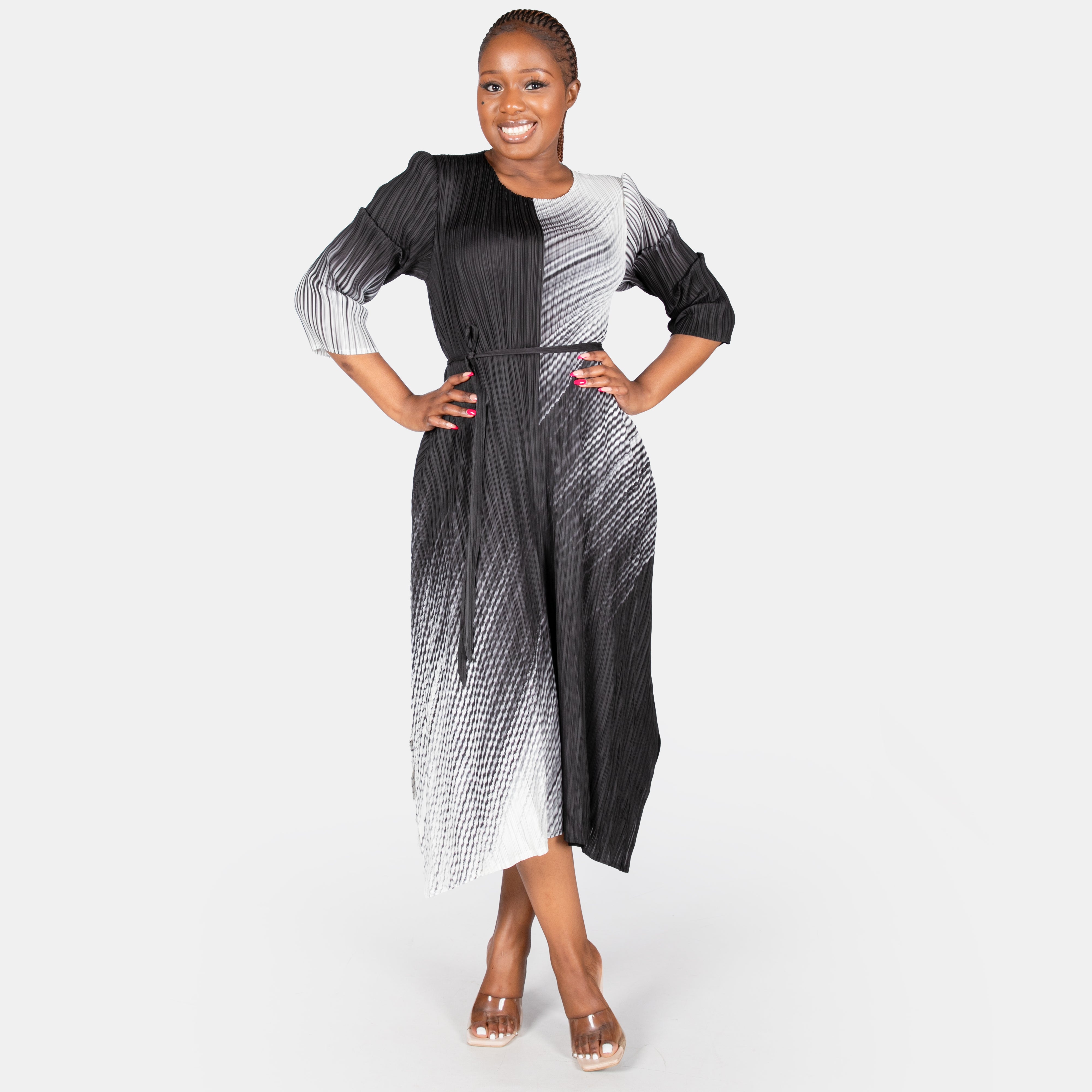 The Georgia dress is your answer to smart occasions and business travel. Crafted from a delicate permanent pleat fabric that requires no ironing and fits over your bust and hips, no matter their size. In fact, your dress can be rolled in a ball and worn straight away. She features a round neck, long sleeves and a straight cut to mid calf. You will notice small slits at the sides and a detachable soft tie belt at the waist. Georgia is definitely more dynamic in heels. One size fits most.