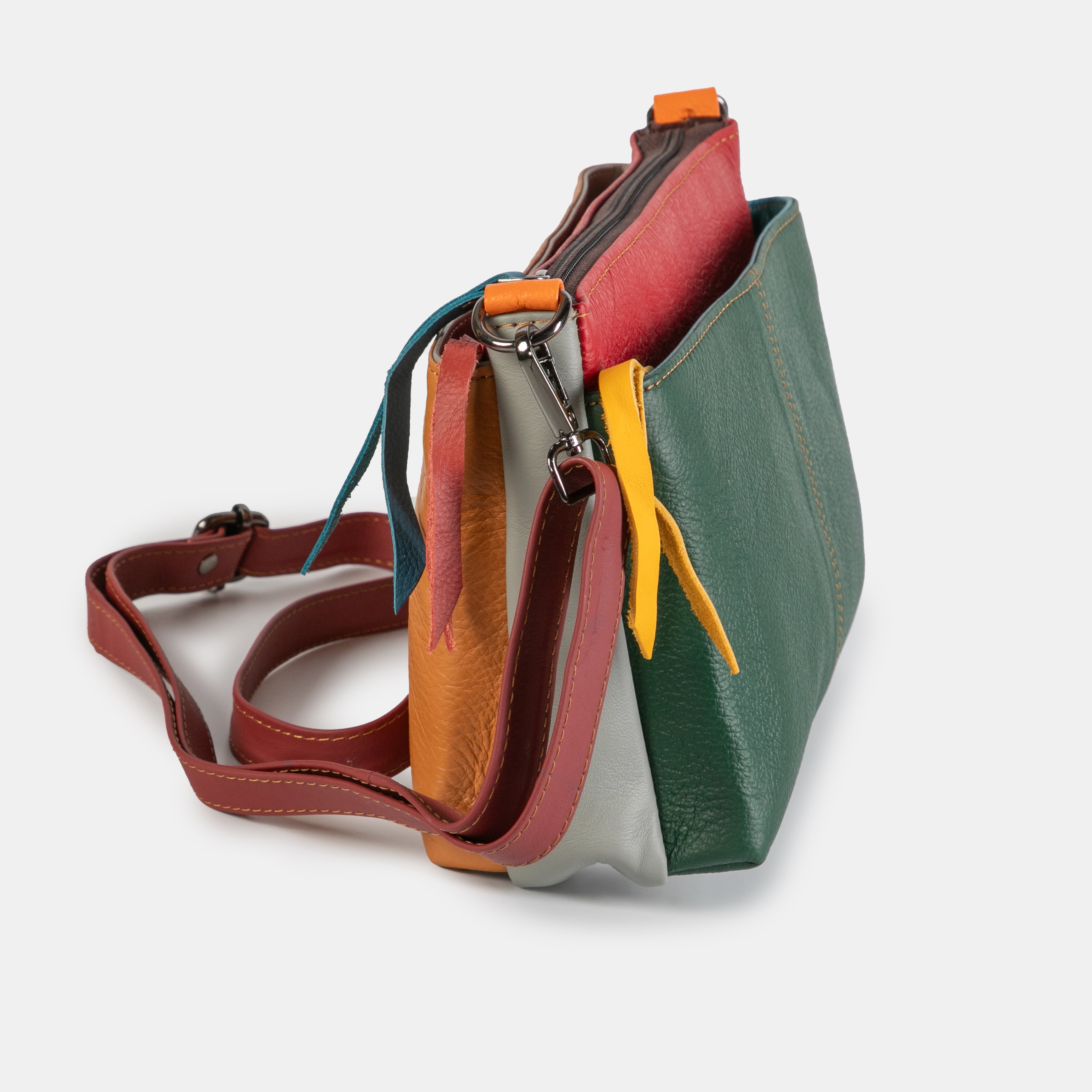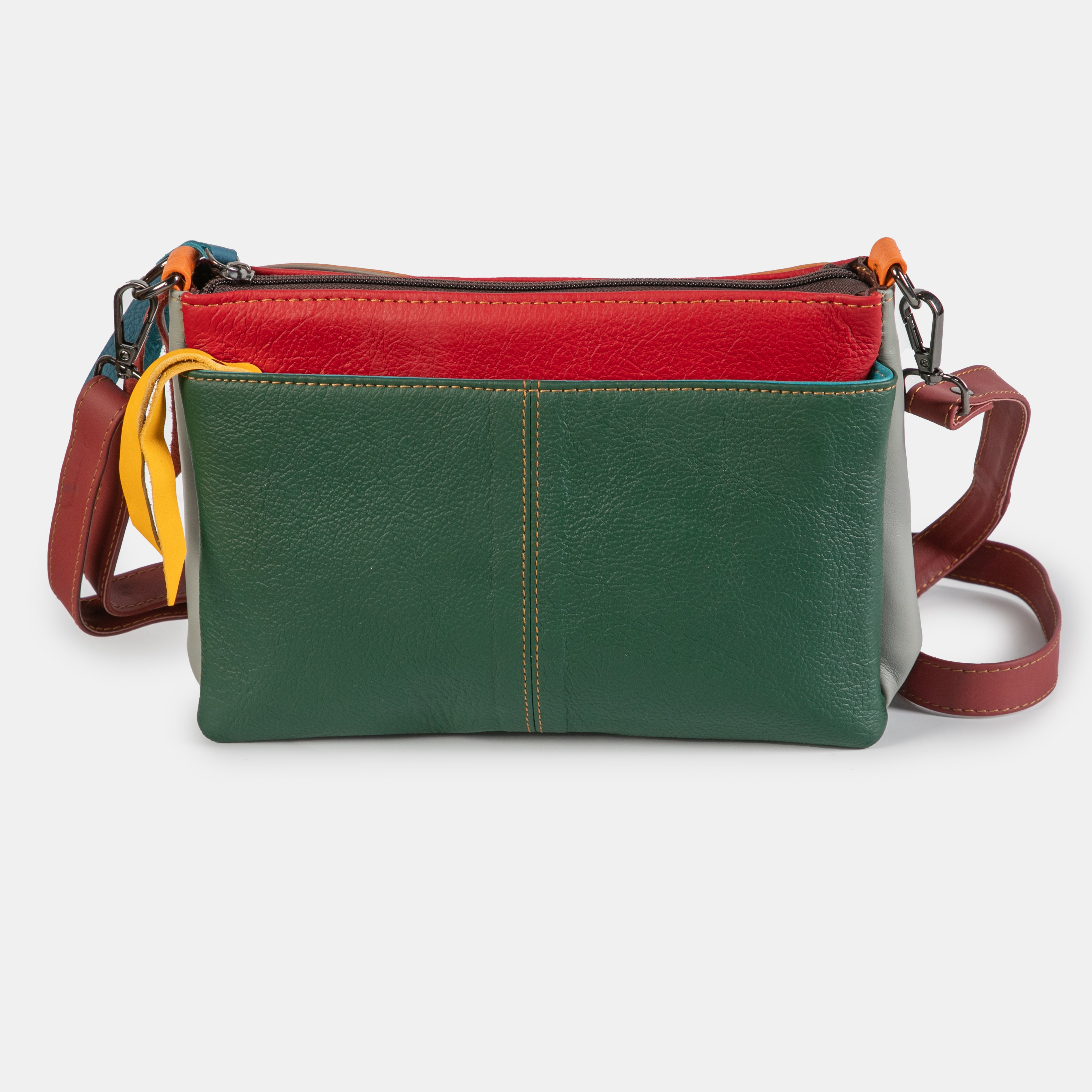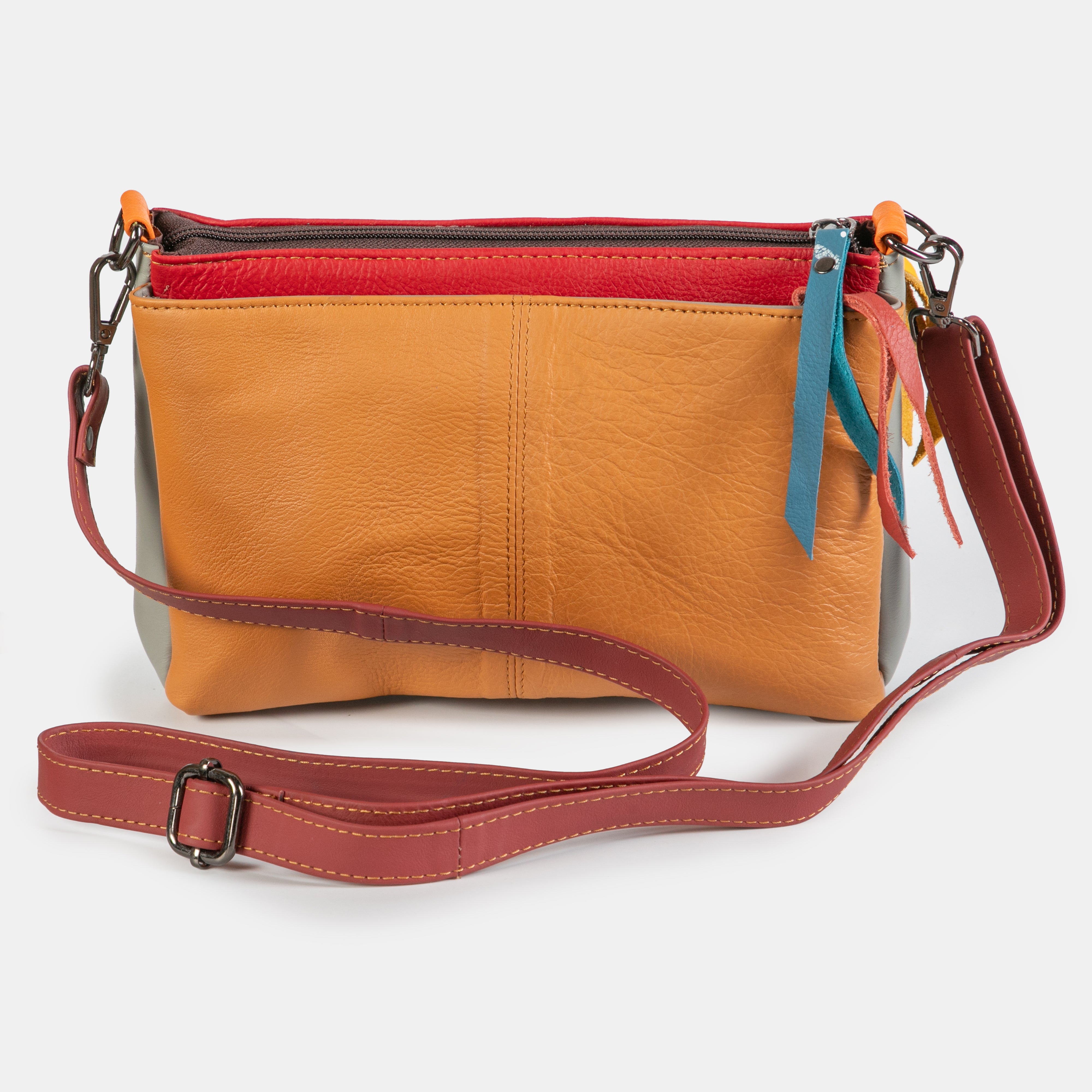 Crafted in genuine leather, this bag has three zipped compartments in different bright colours, tasselled zips and an adjustable cross body strap that is also removable.