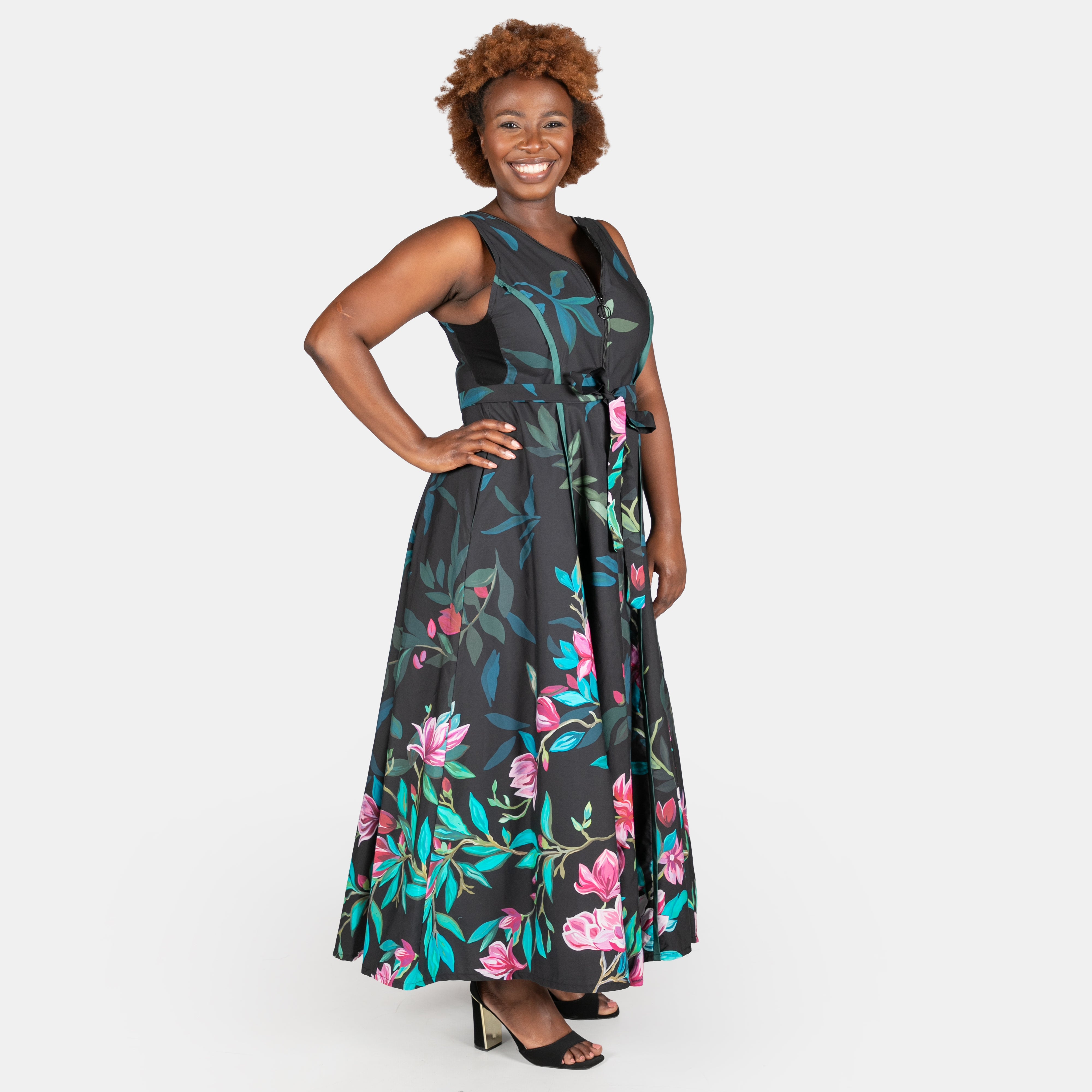 Sleeveless, it boasts a ring zipped closure in the front of the bodice.