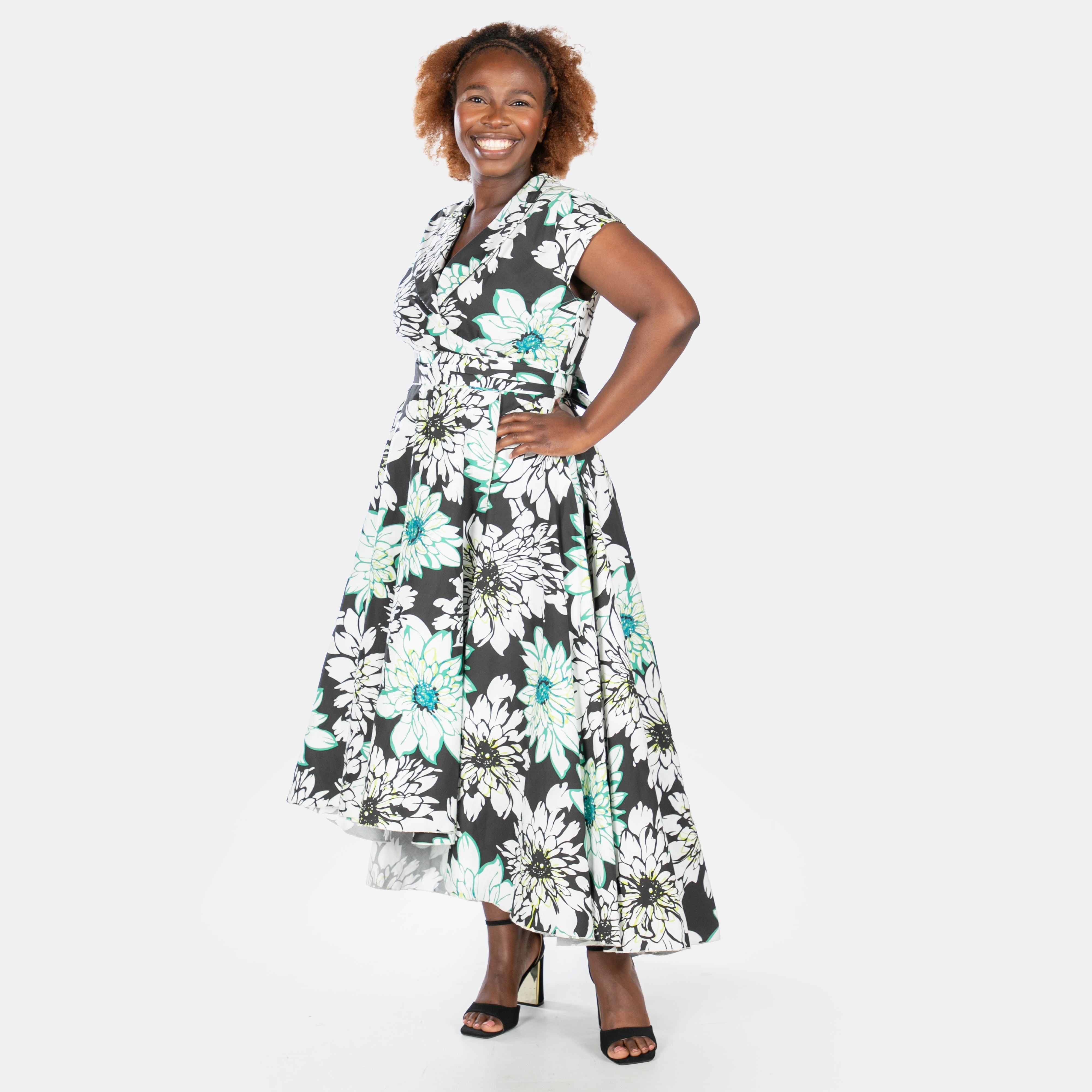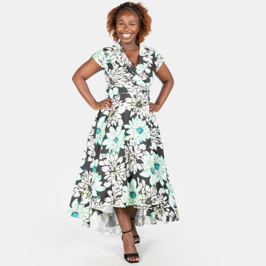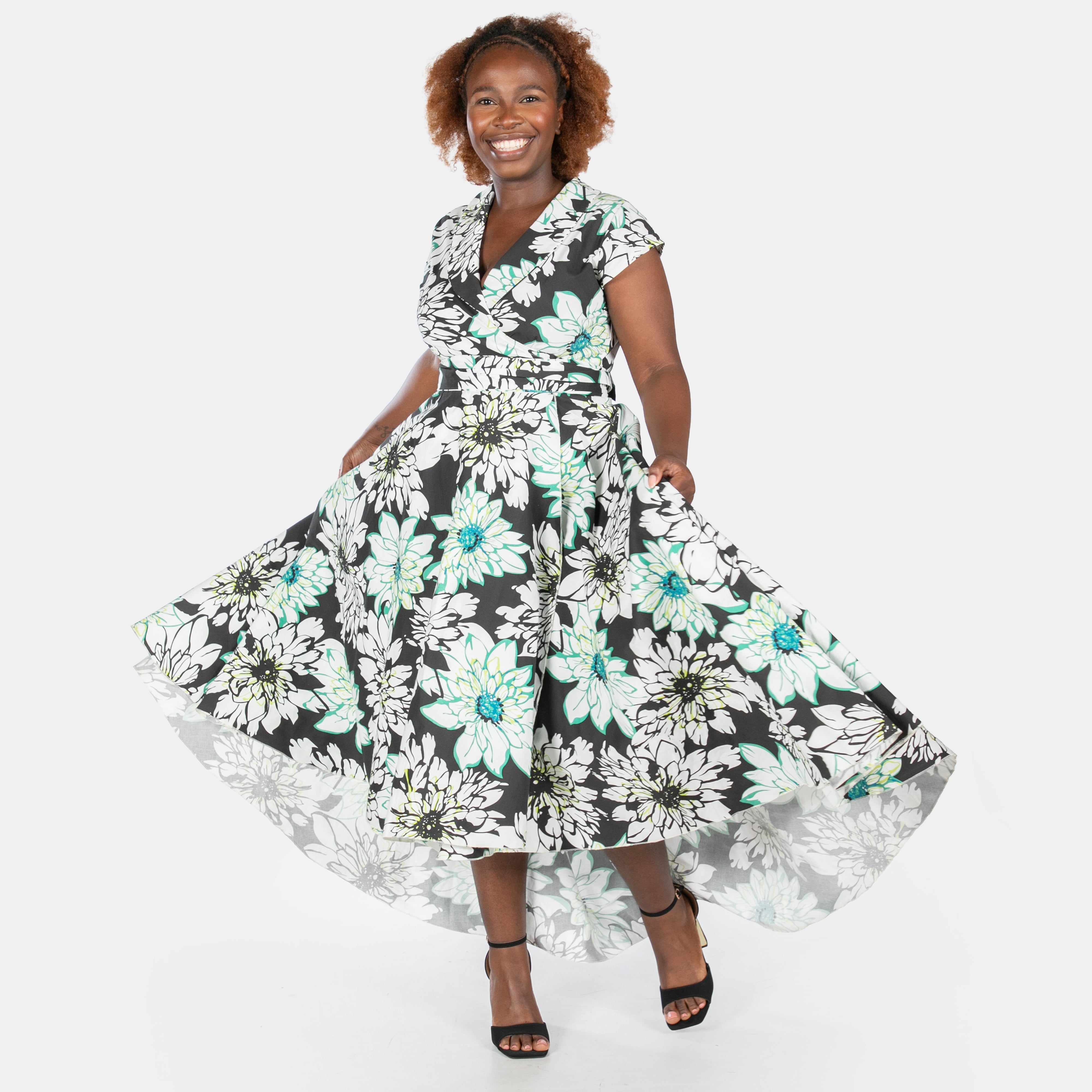 Inspired by the iconic Marilyn Monroe, this wrap dress has a longer length hem at the back. The skirt is full, has pockets and a long tie belt that threads through a gap in the side (much like a ballet jersey). The bodice boasts a cross over design, has darts to ensure a great fit, a fold over collar and short cap sleeves. Available in sizes Small to 3XL. Reactive dyed 97% Cotton 3% Spandex.