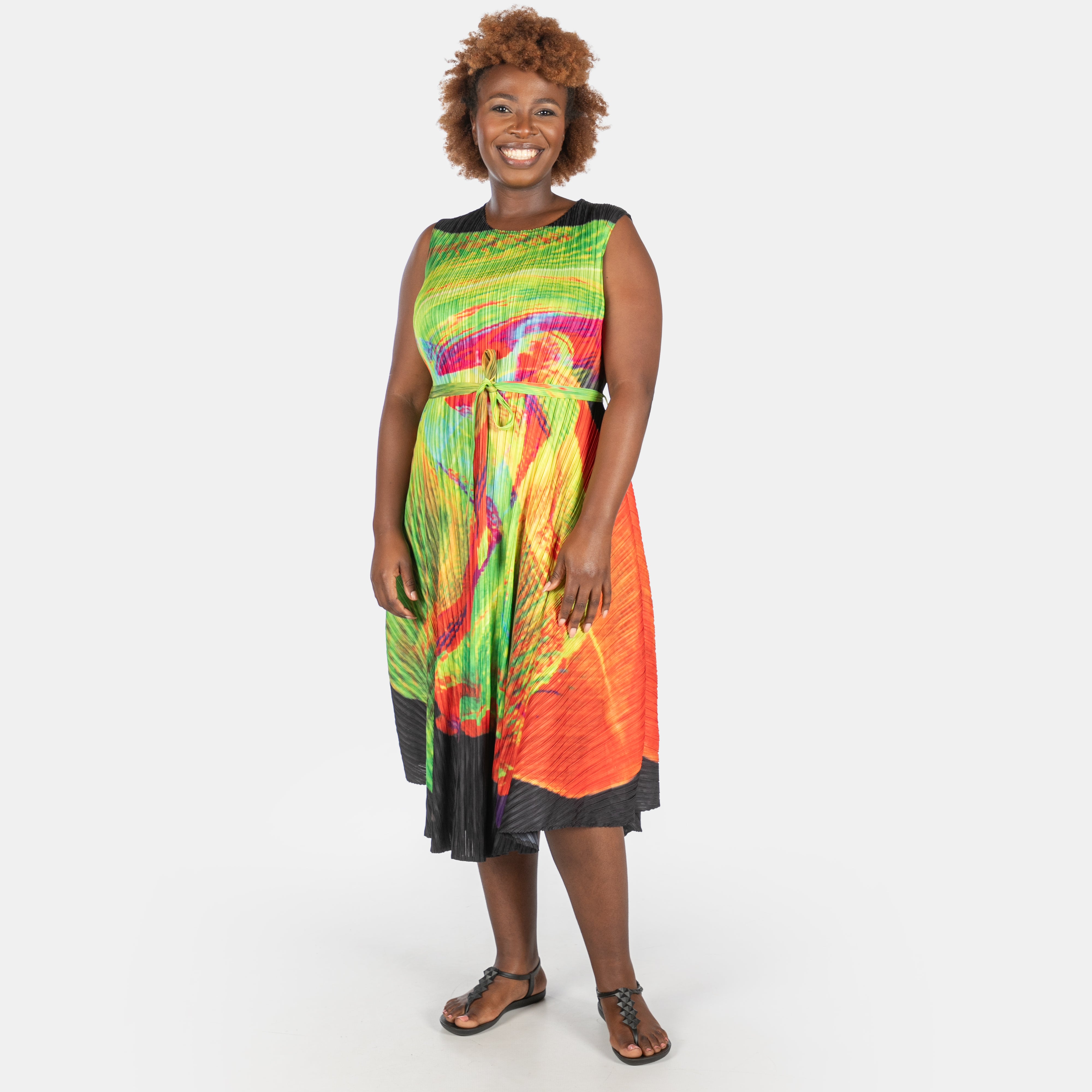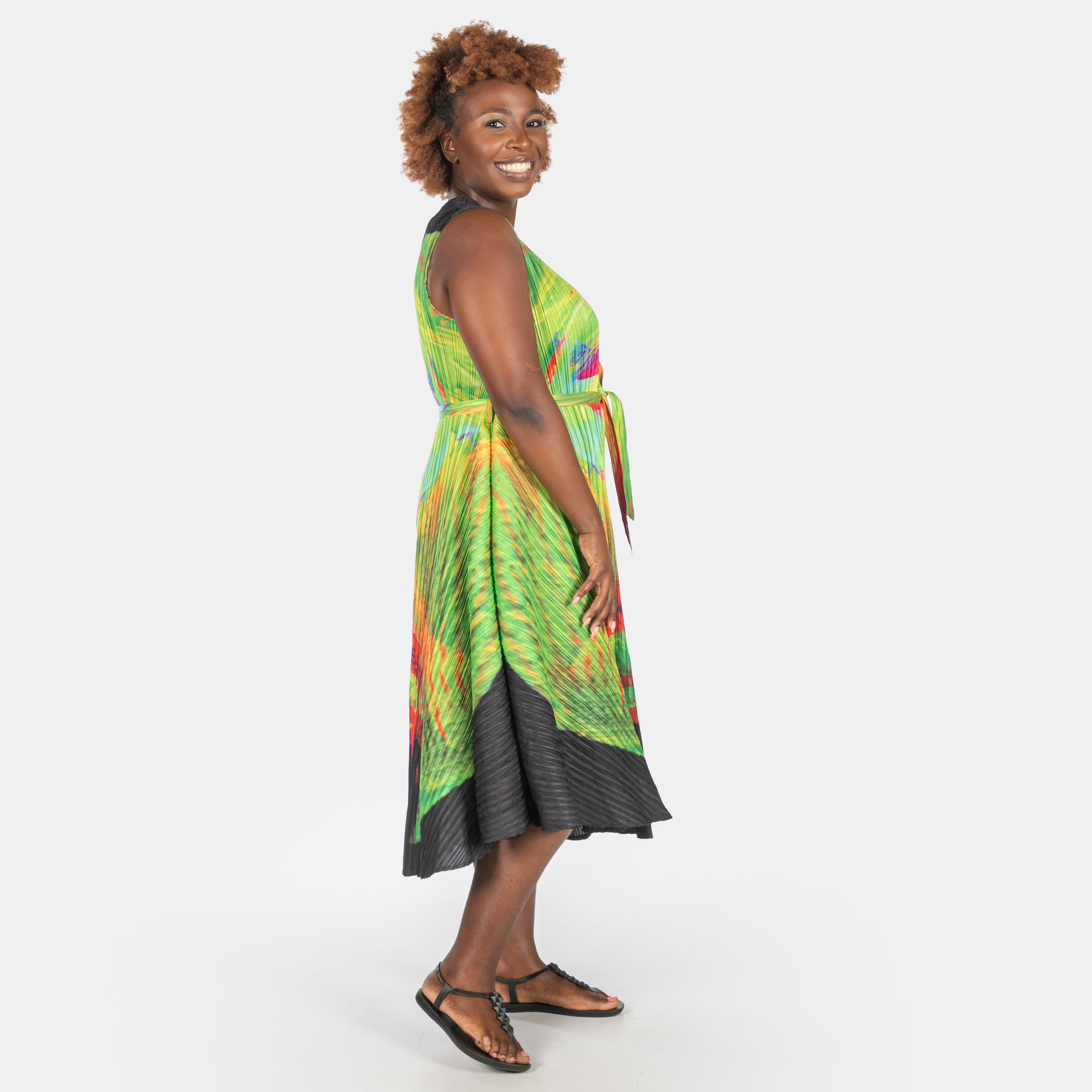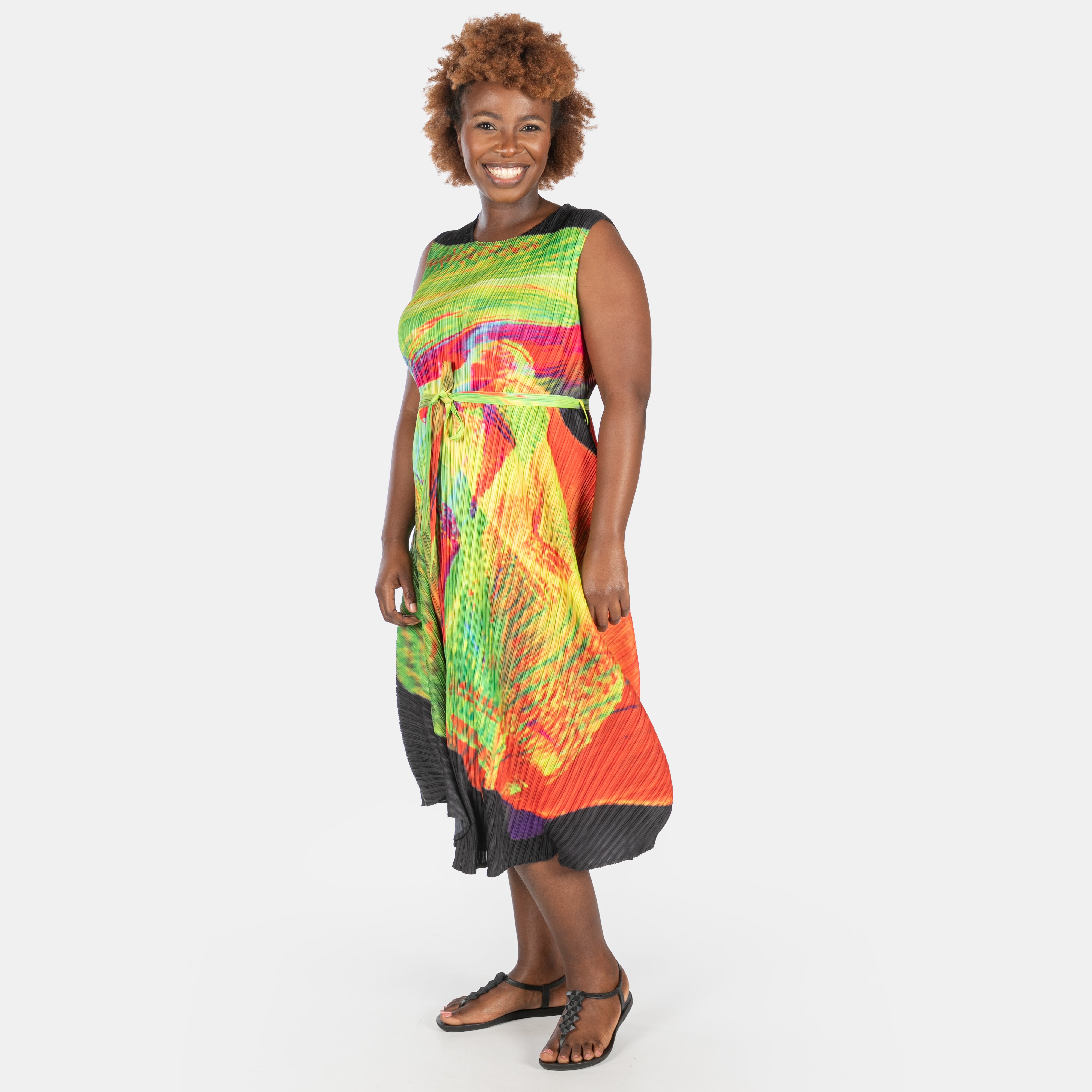 The clever A-line silhouette works magic on every body shape, while the bouncy permanent pleat fabric keeps things fresh and fun.