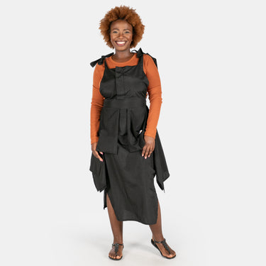This striking tunic draws inspiration from classic pinafore styling, featuring a structured bib front and adjustable back ties for the perfect fit.