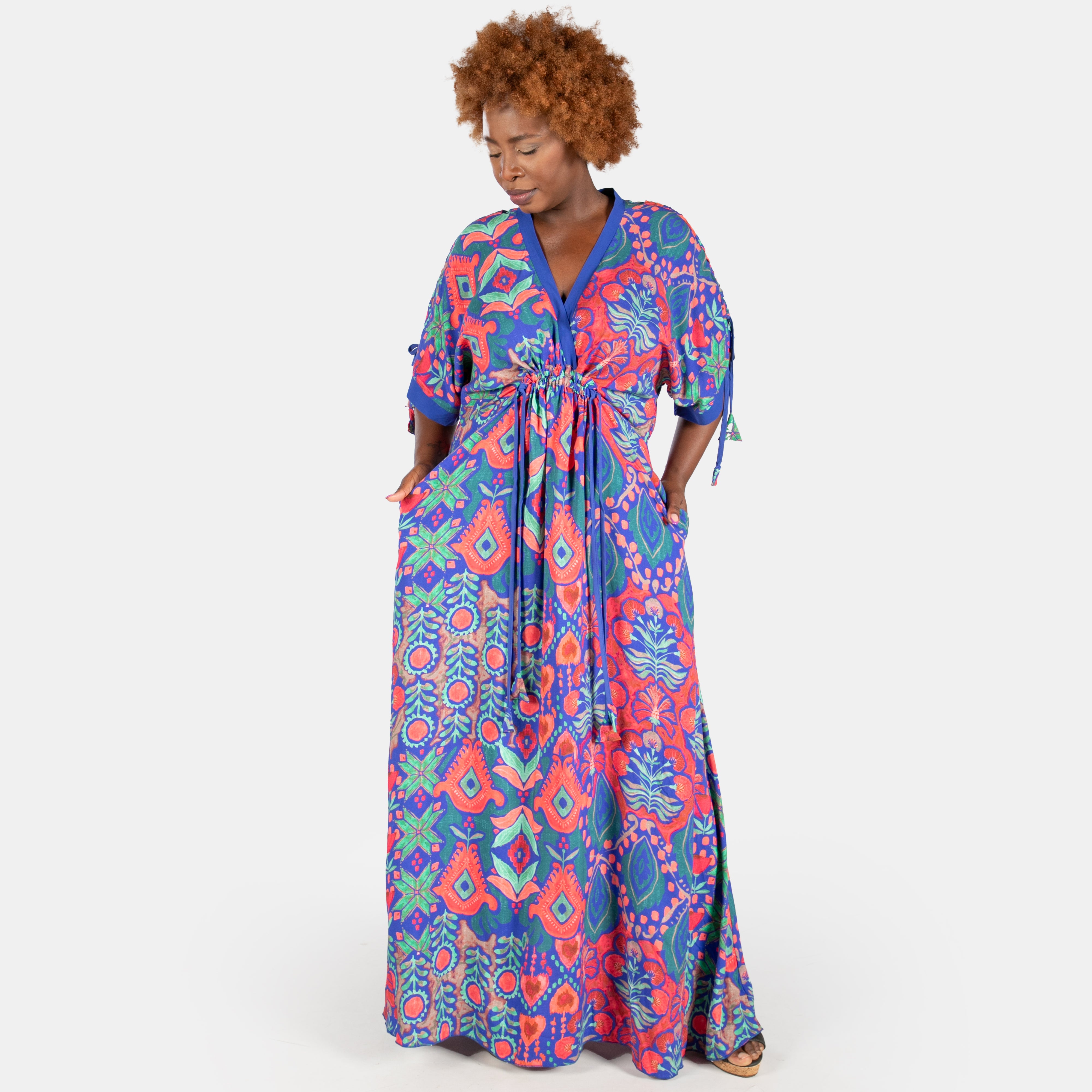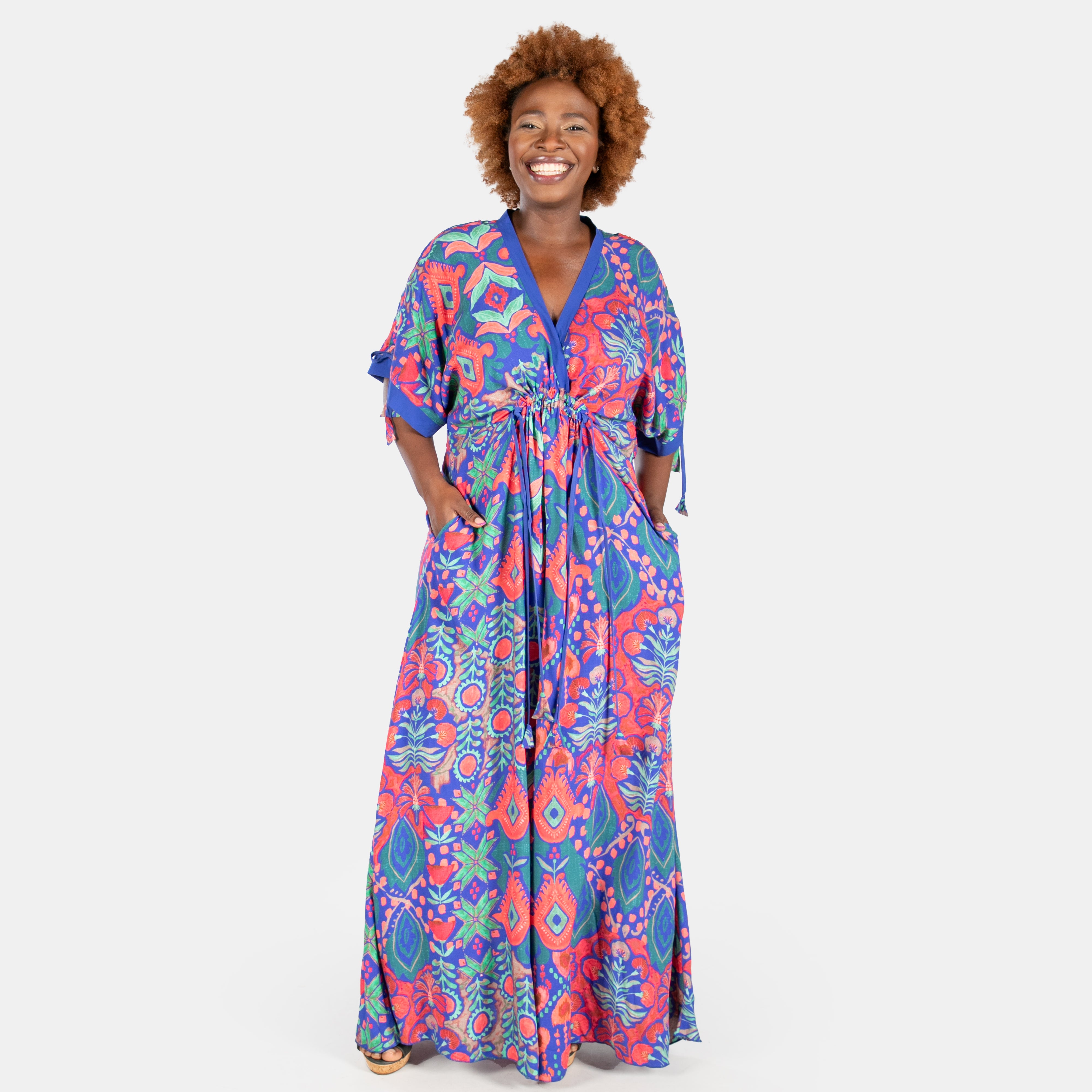 The Sugar Sweet dress features a V-neck and short sleeves. The sleeves boast drawstrings that allow you to adjust their length. You will also notice a drawstring channel across the front directly under the bust. Move this and tie the strings where it flatters you the most.