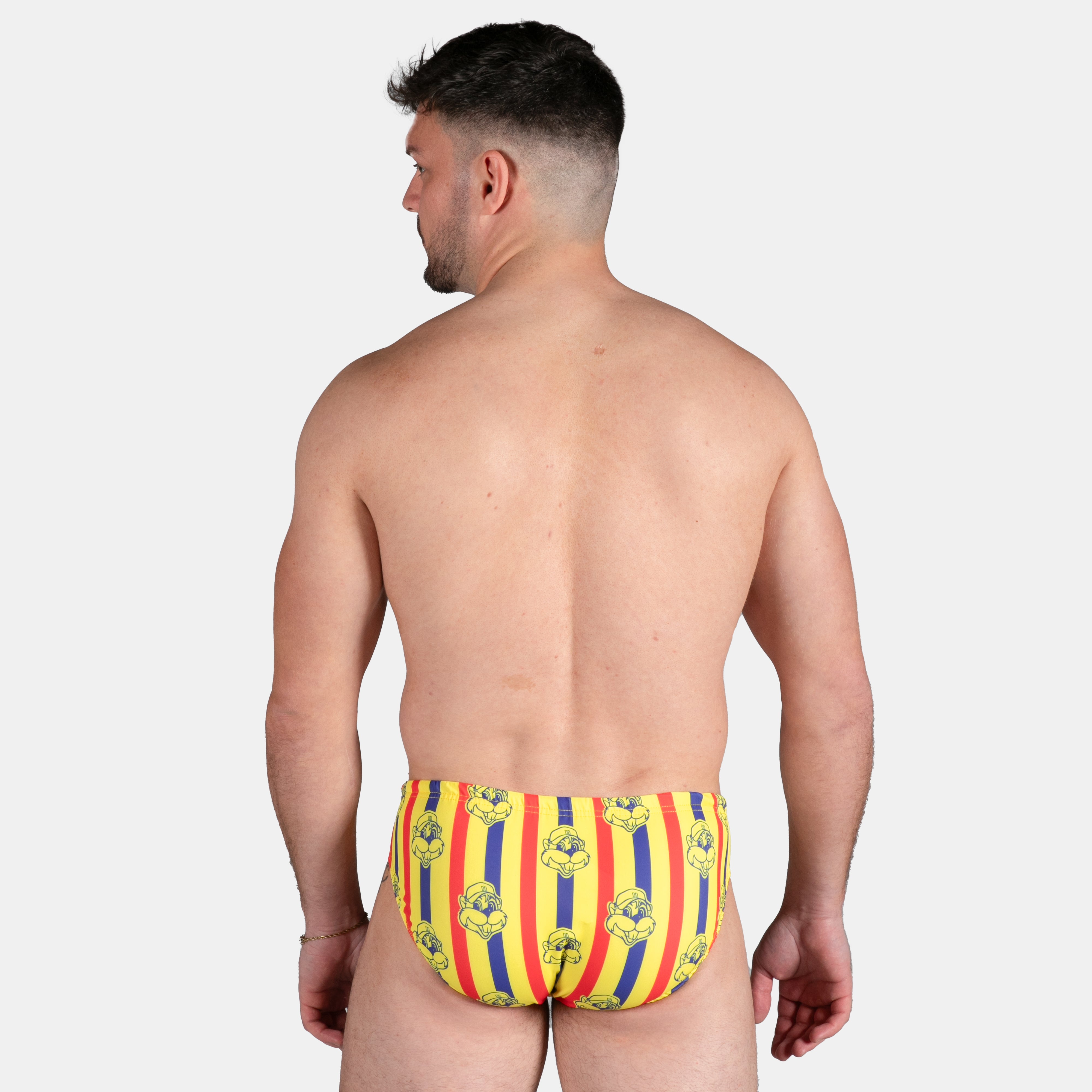 That familiar bubble gum brand with the iconic stripe chipmunk design is now on swim briefs for men. Unlined with a drawstring waistband.