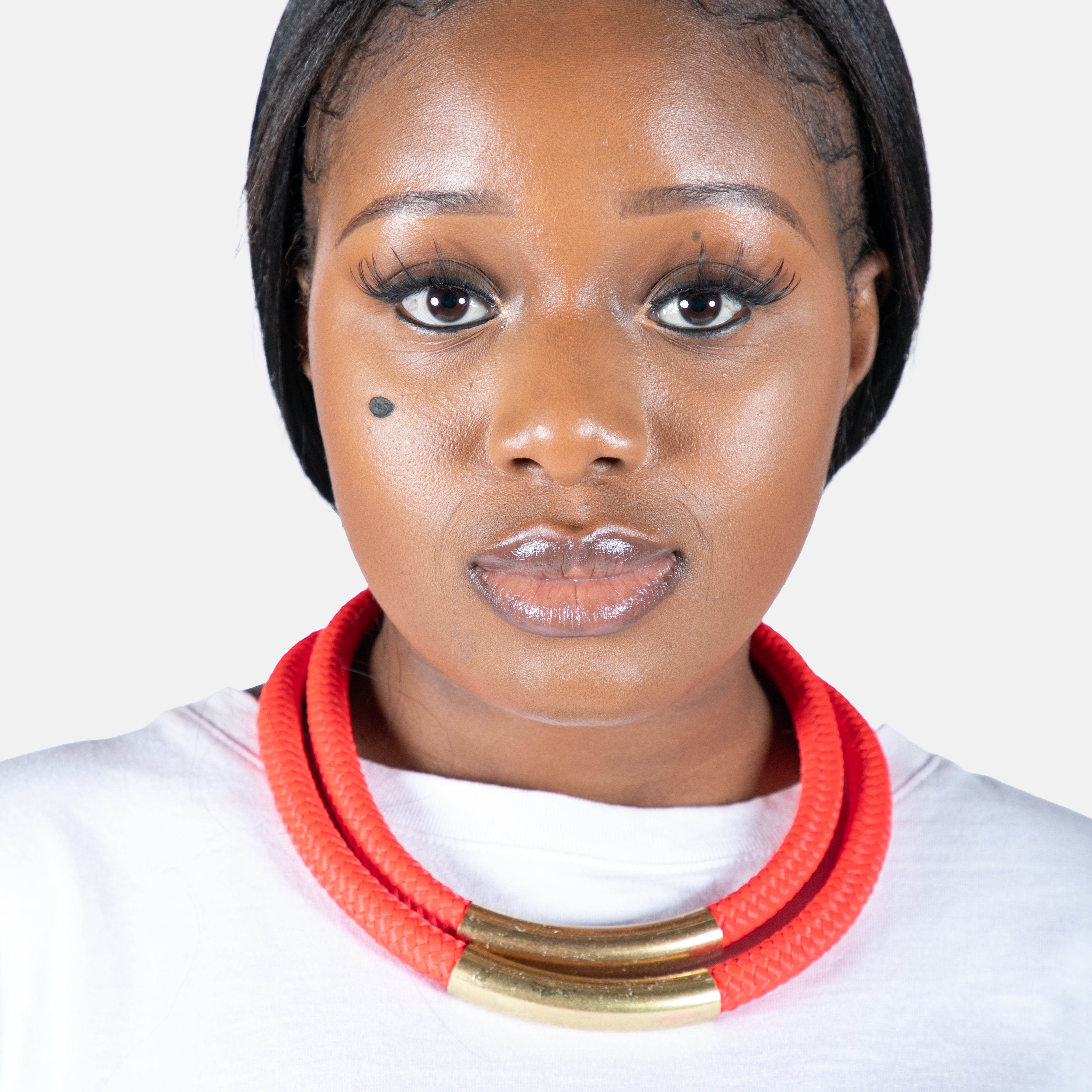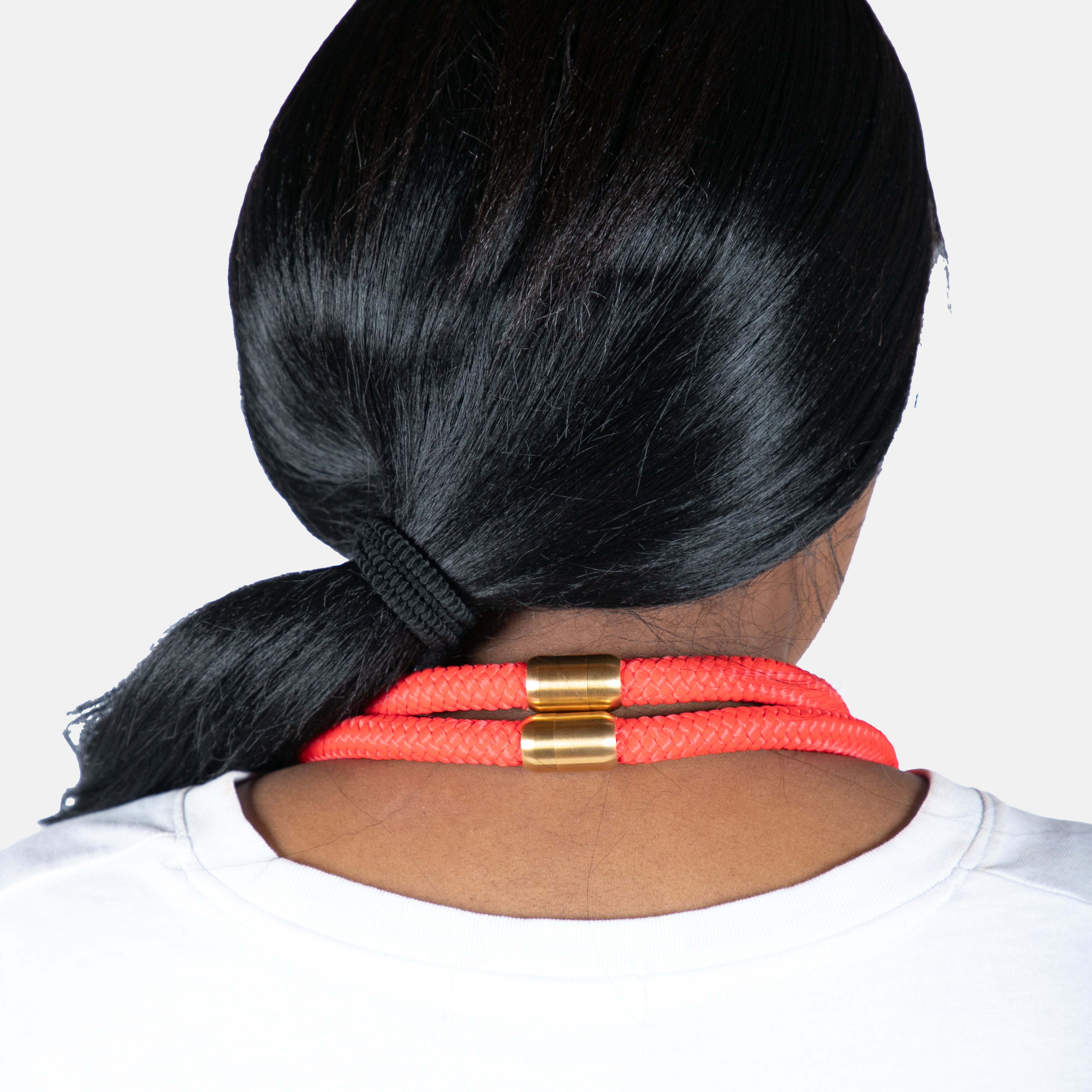 A stylish statement choker necklace with two rope and metal cords that join magnetically. Available in Red, Black and Mustard.