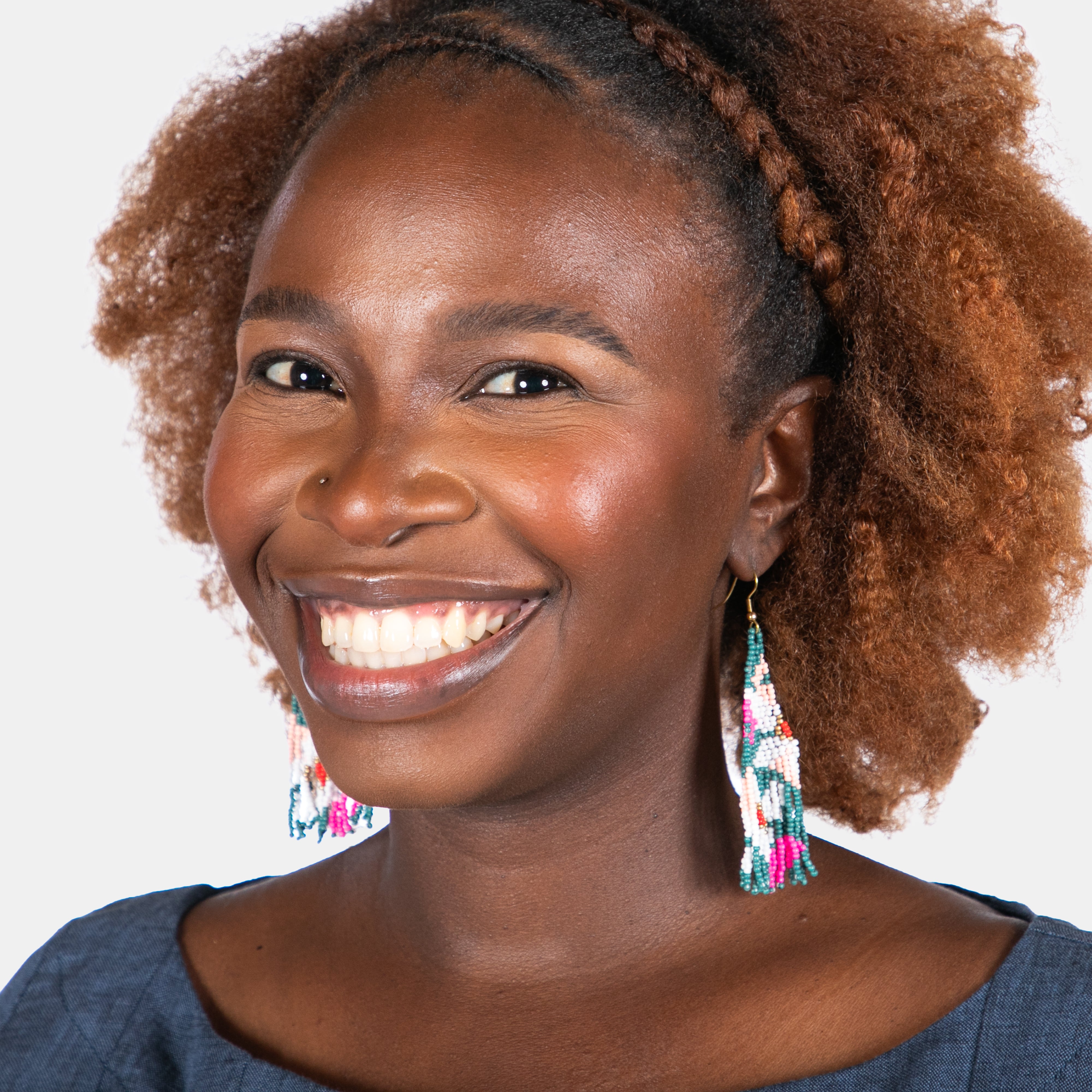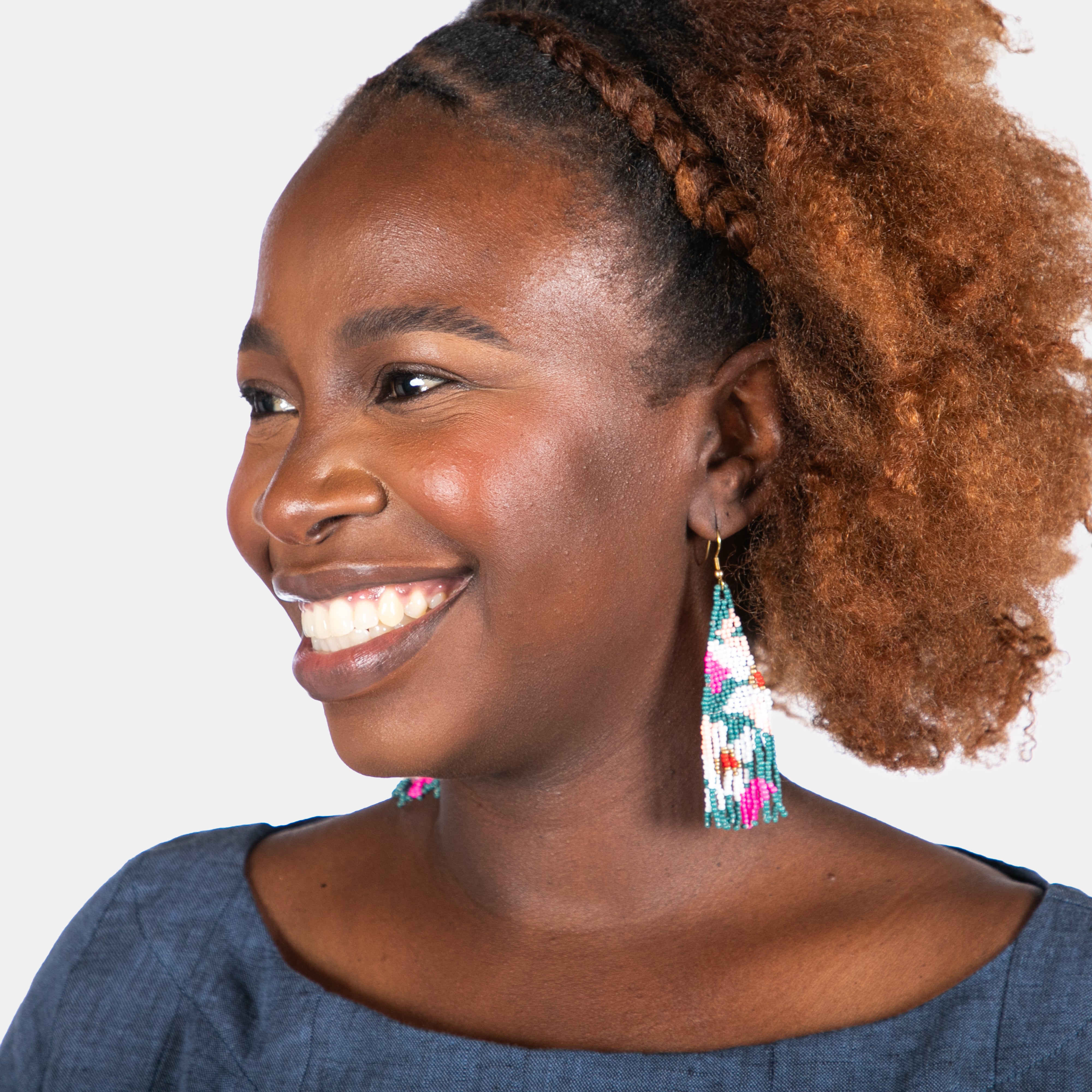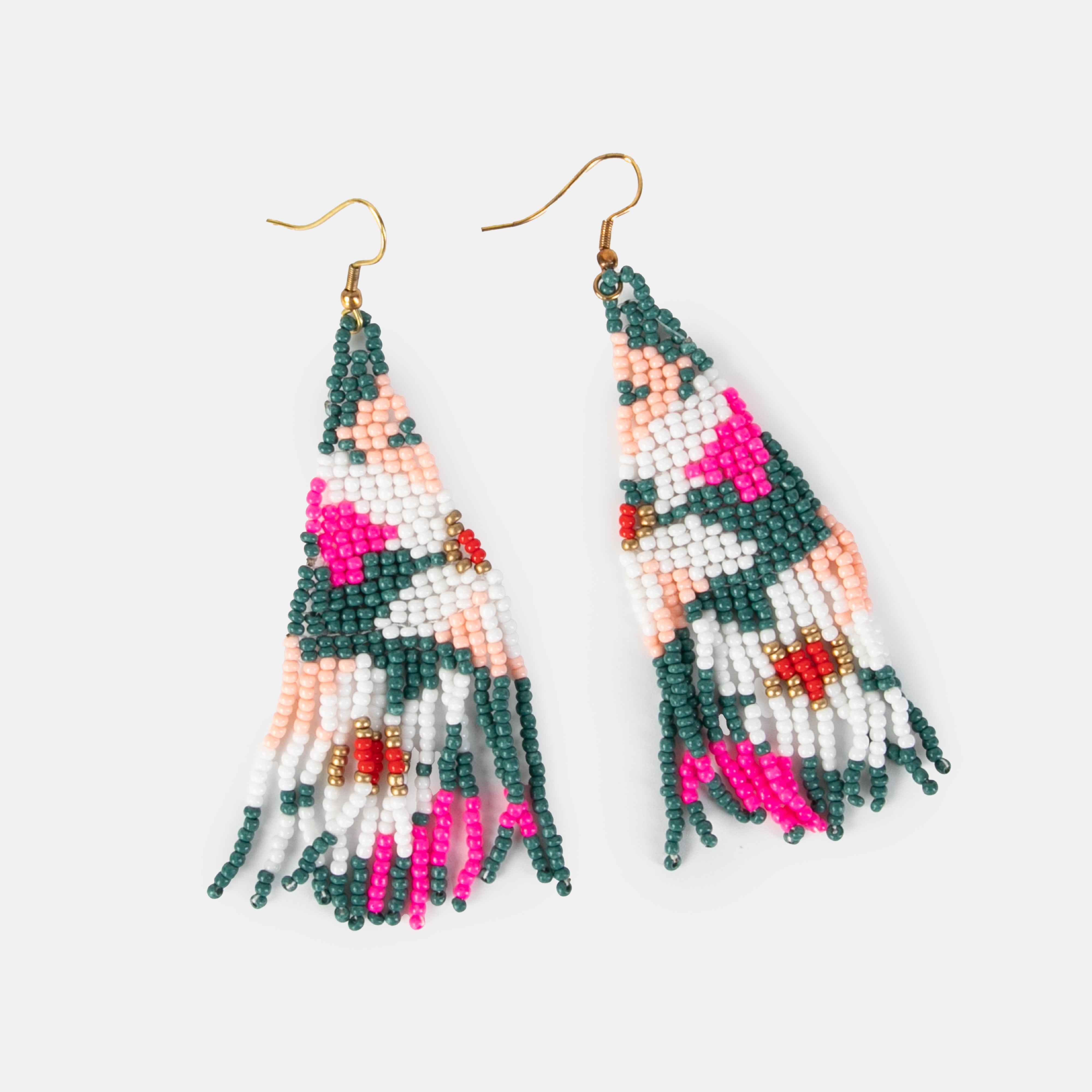 The Harriet earrings are a thoughtfully curated design of delicately hand beaded seed beads. A triangle shape at the ear extending to long tassels.