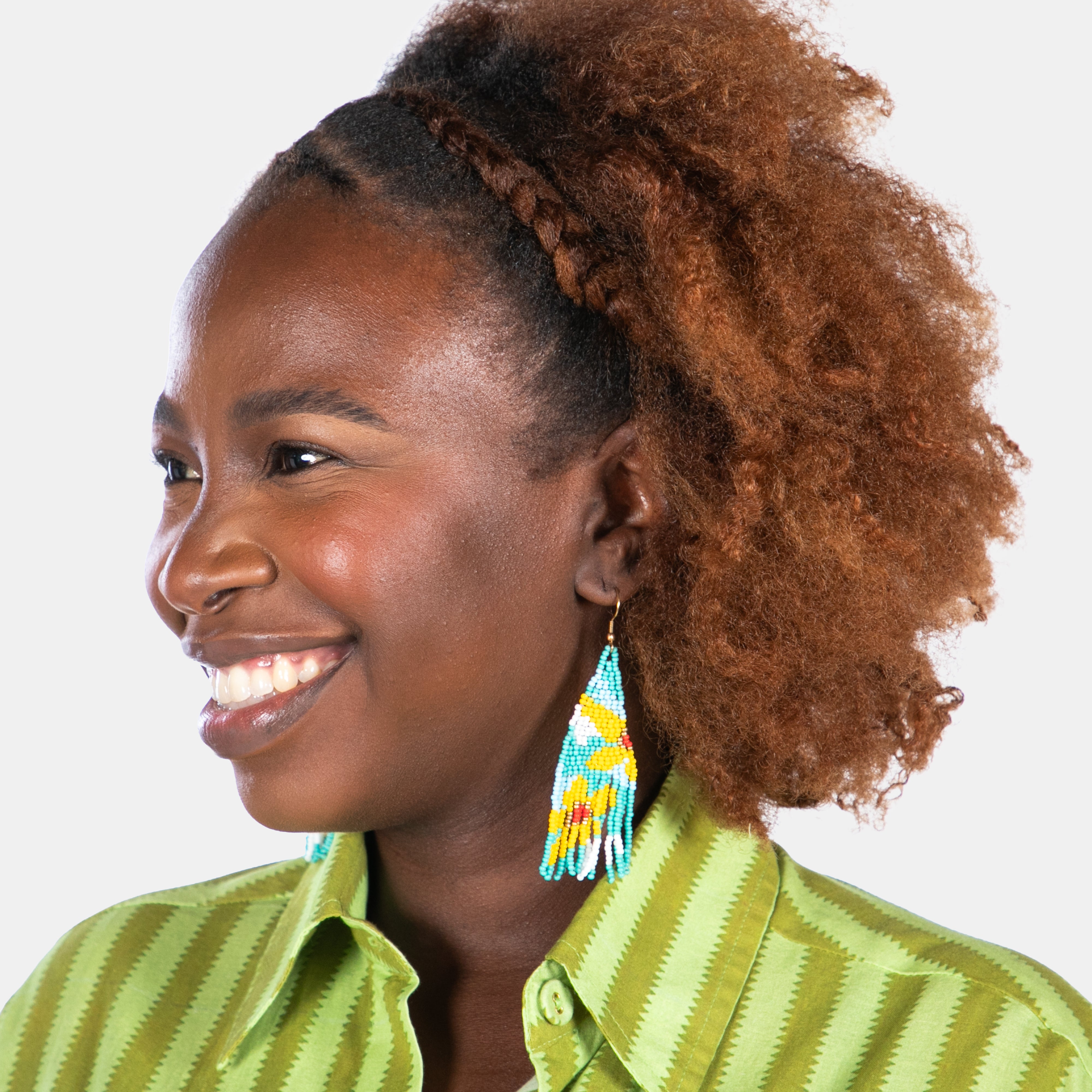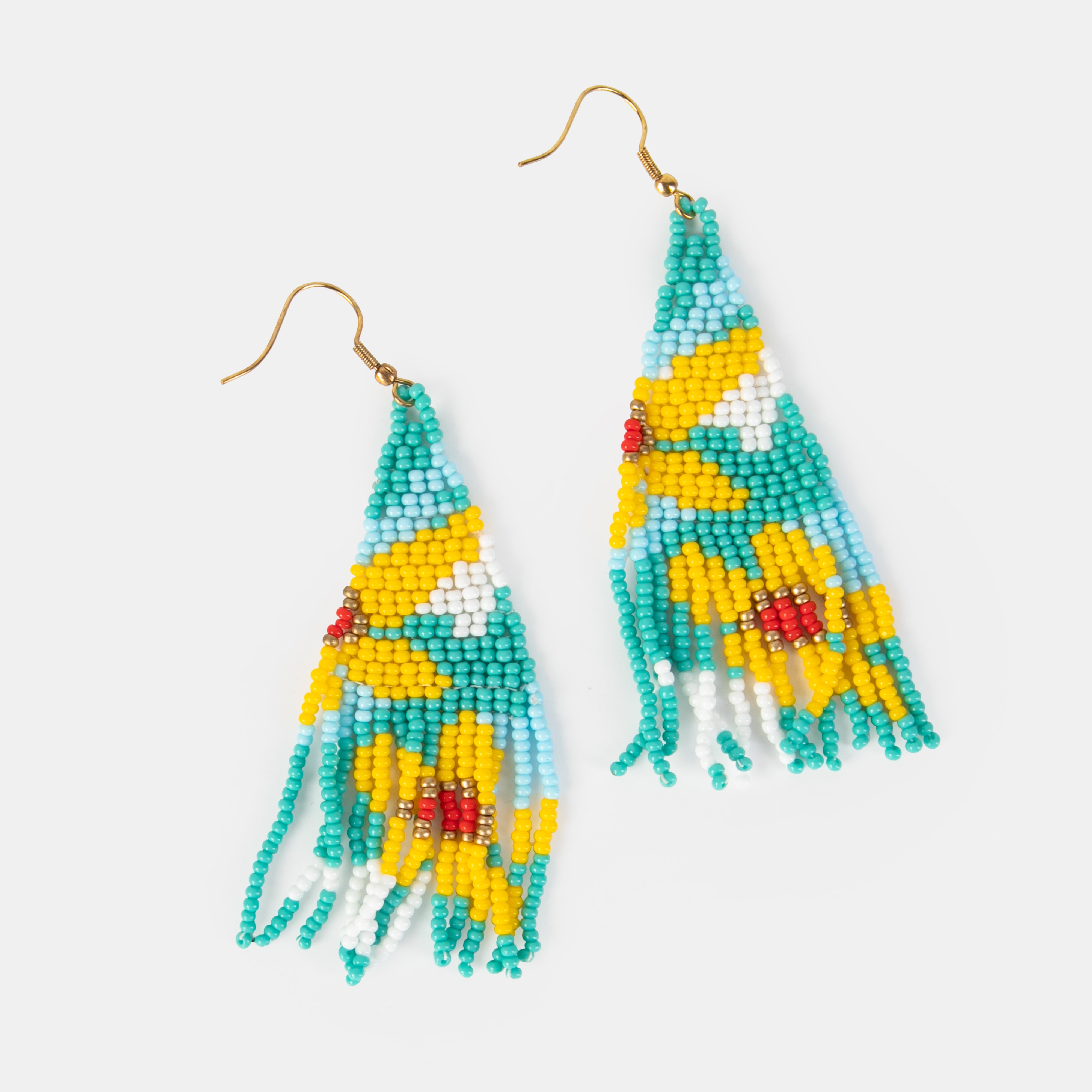 The Harriet earrings are a thoughtfully curated design of delicately hand beaded seed beads. A triangle shape at the ear extending to long tassels.