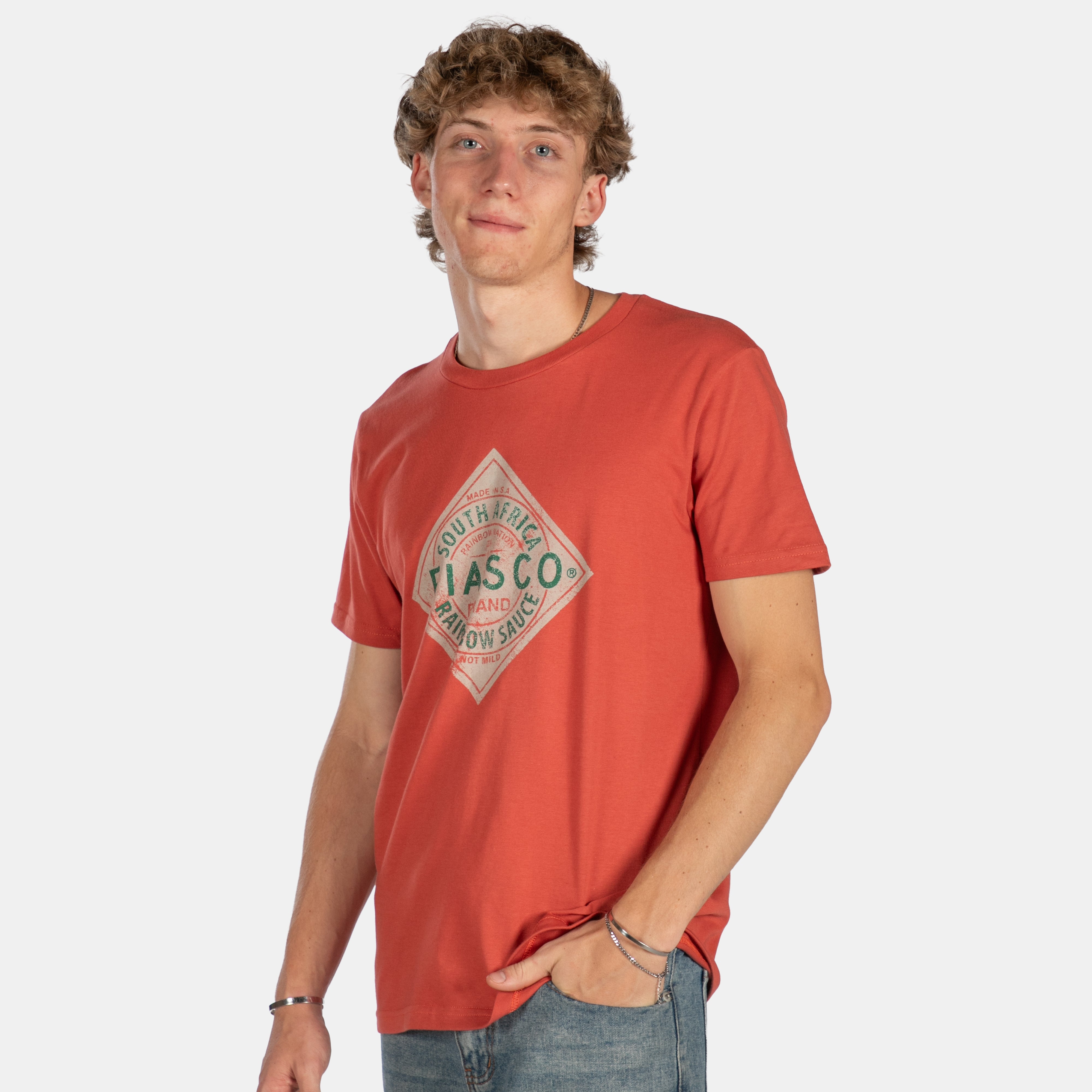 This cheeky men's tee puts a spicy spin on iconic branding with a tongue-in-cheek nod to South Africa.