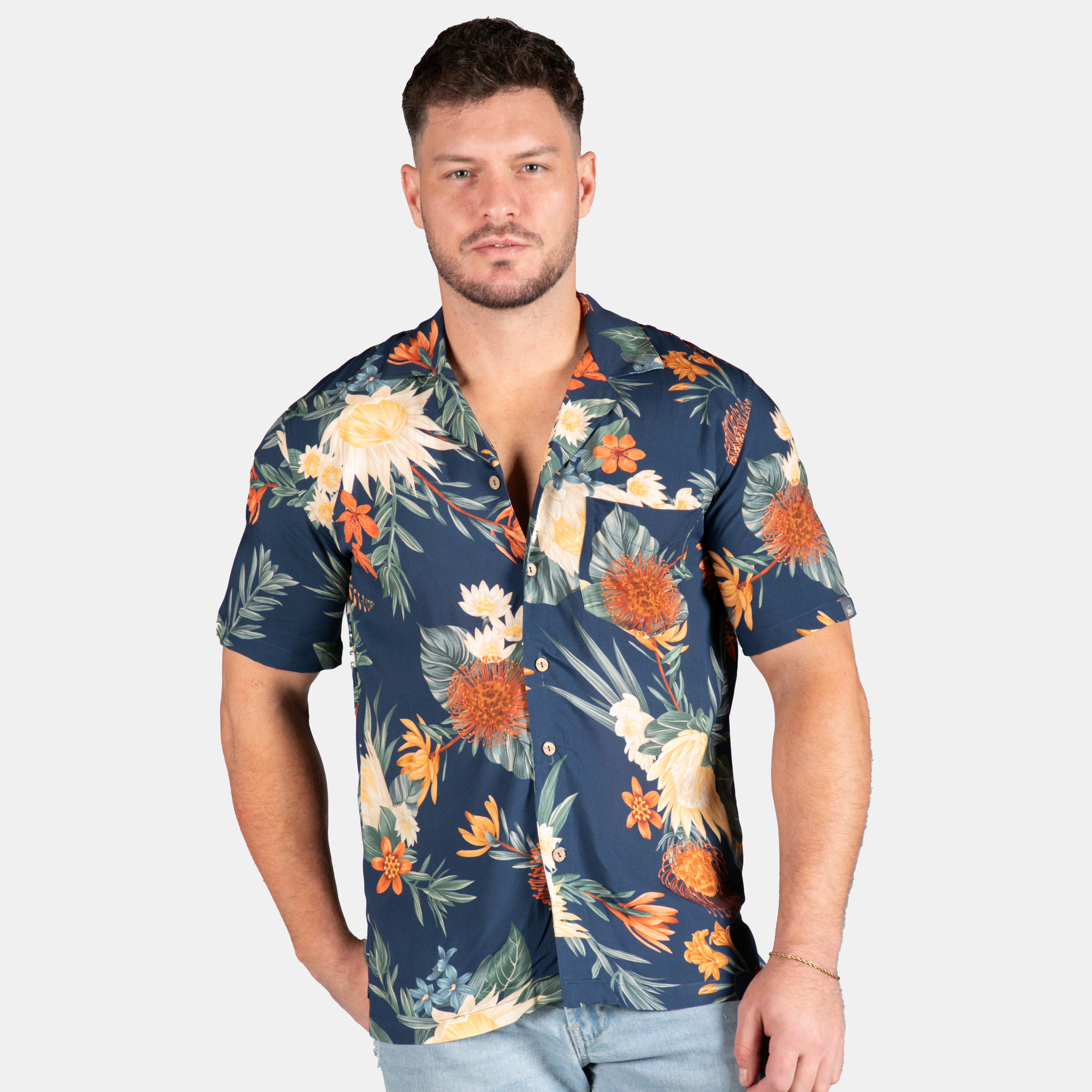 This safari style shirt boasts the most amazing masculine flora print and is tailored to flatter every male torso.