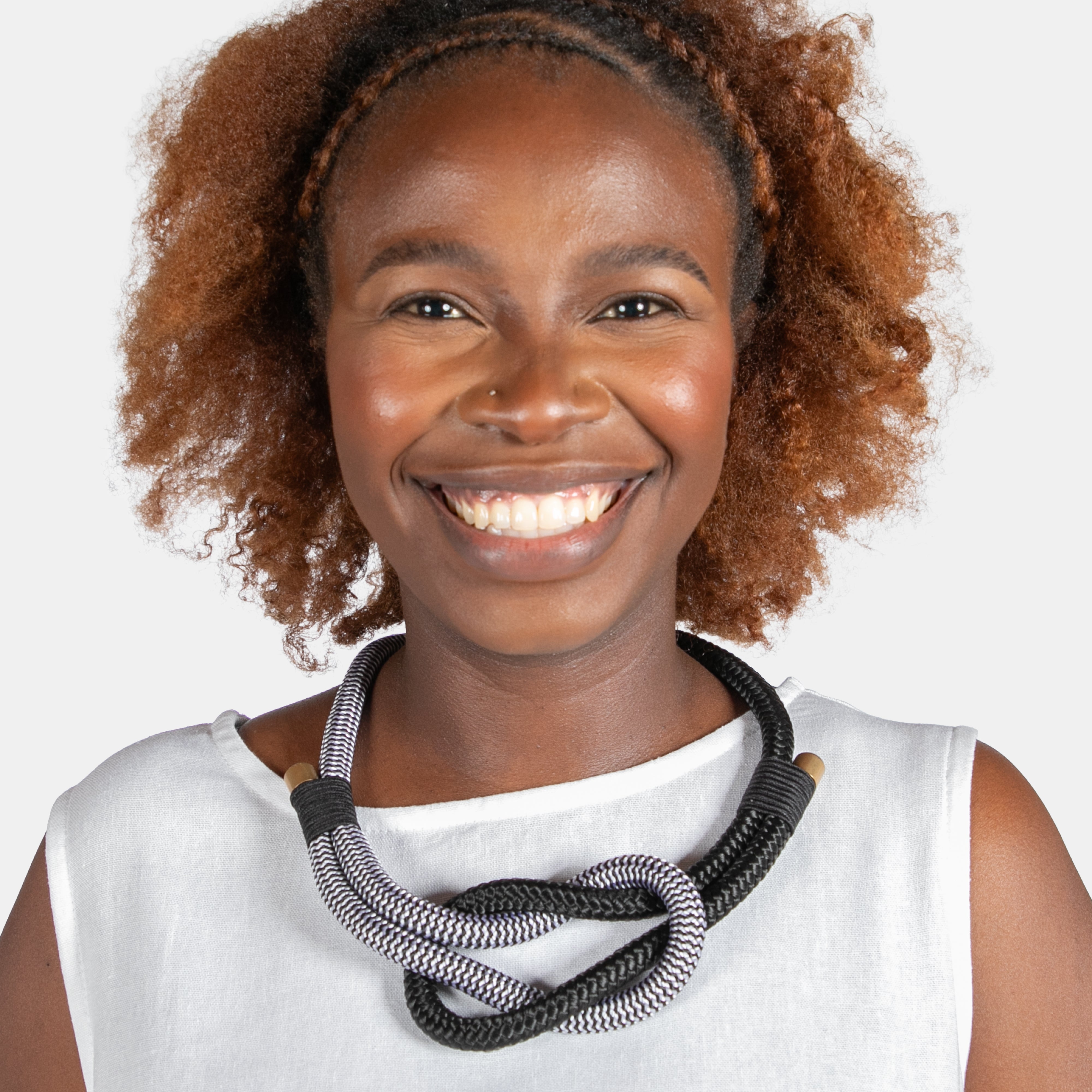 Half and half makes whole. Twisted rope in two different colours link into each other to create captivating shapes that demand attention. Secured with a sleek metal ring closure at the back. Lightweight yet bold, it's your go-to piece for adding instant personality to any outfit.