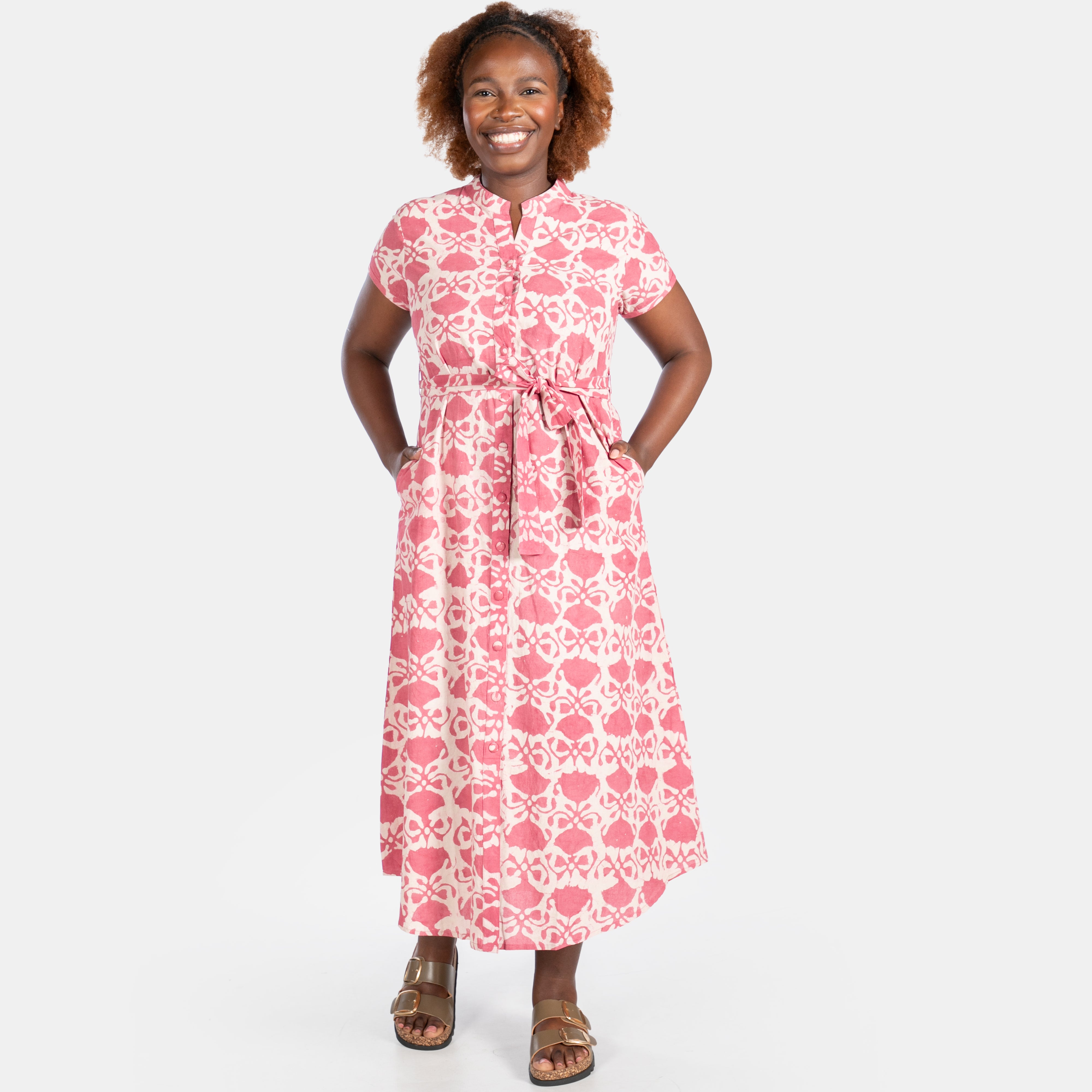 This pink coloured shirt dress brings together the best of both worlds, a crisp button-front silhouette with a charming collar stand, paired with short capped sleeves. Handcrafted in India using quality cotton and adorned with traditional block printing, it's a dress with personality. The removable tie belt lets you switch up your look, while practical side seam pockets and belt loops keep things functional. Effortlessly versatile, this dress transitions from casual weekends to put-together weekdays with ease.