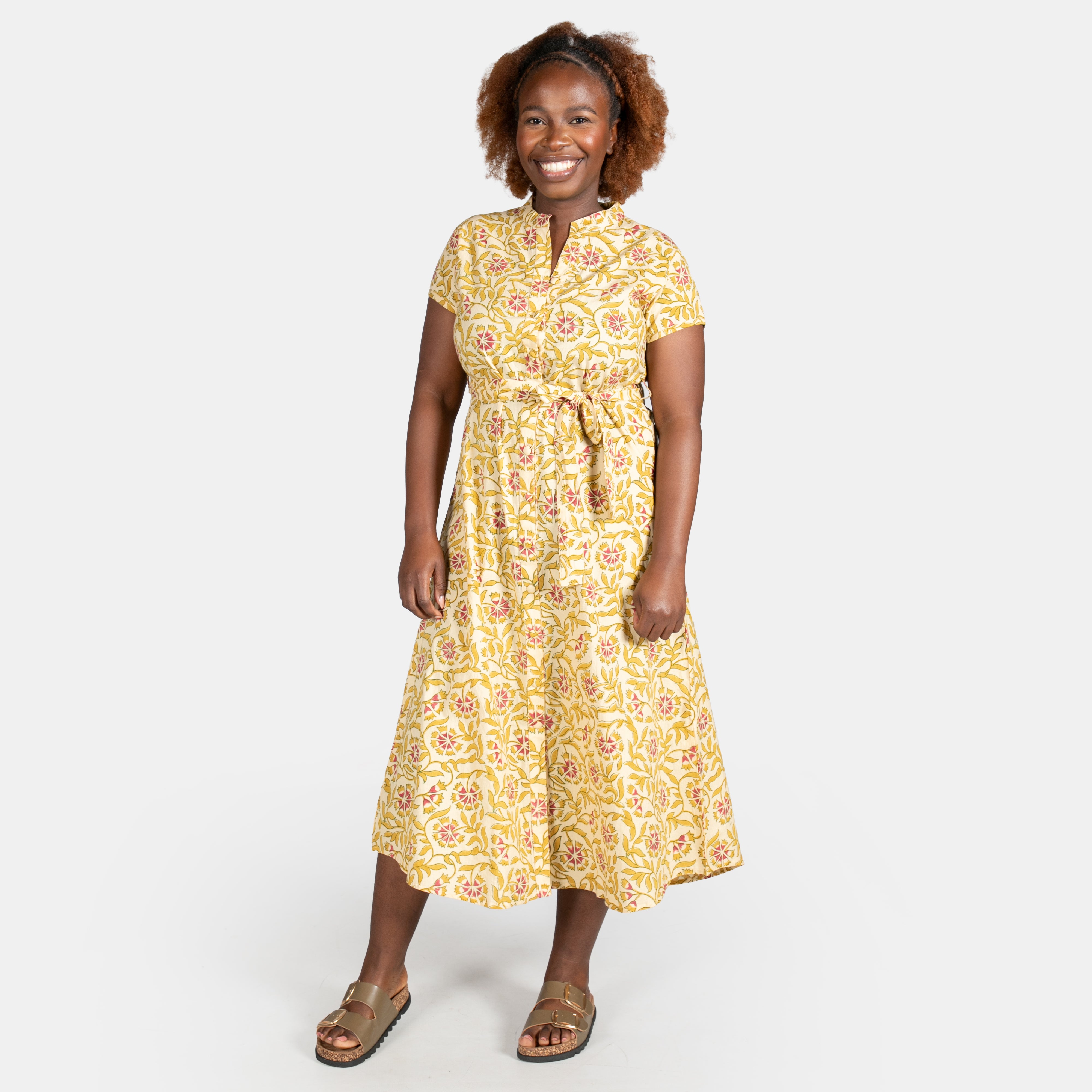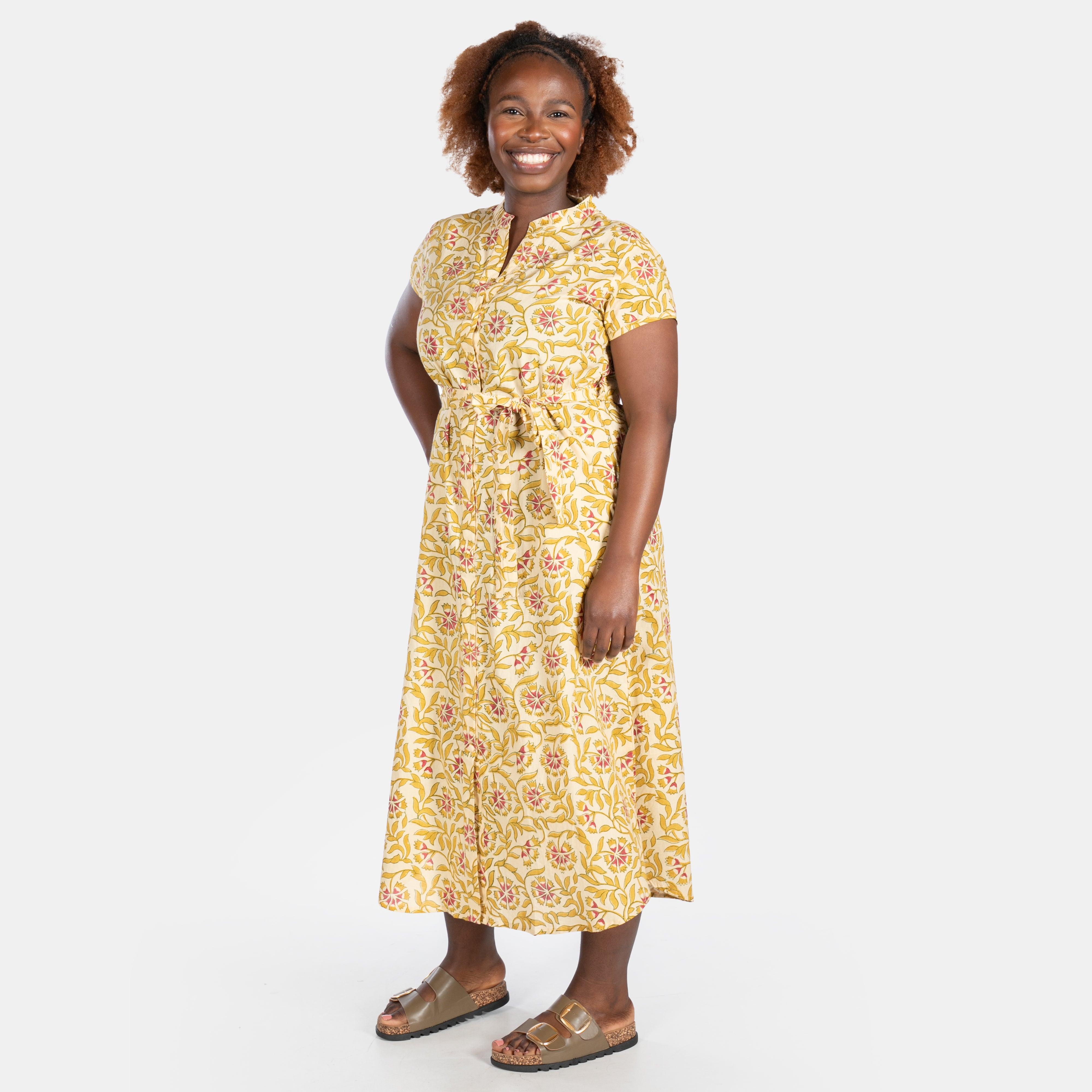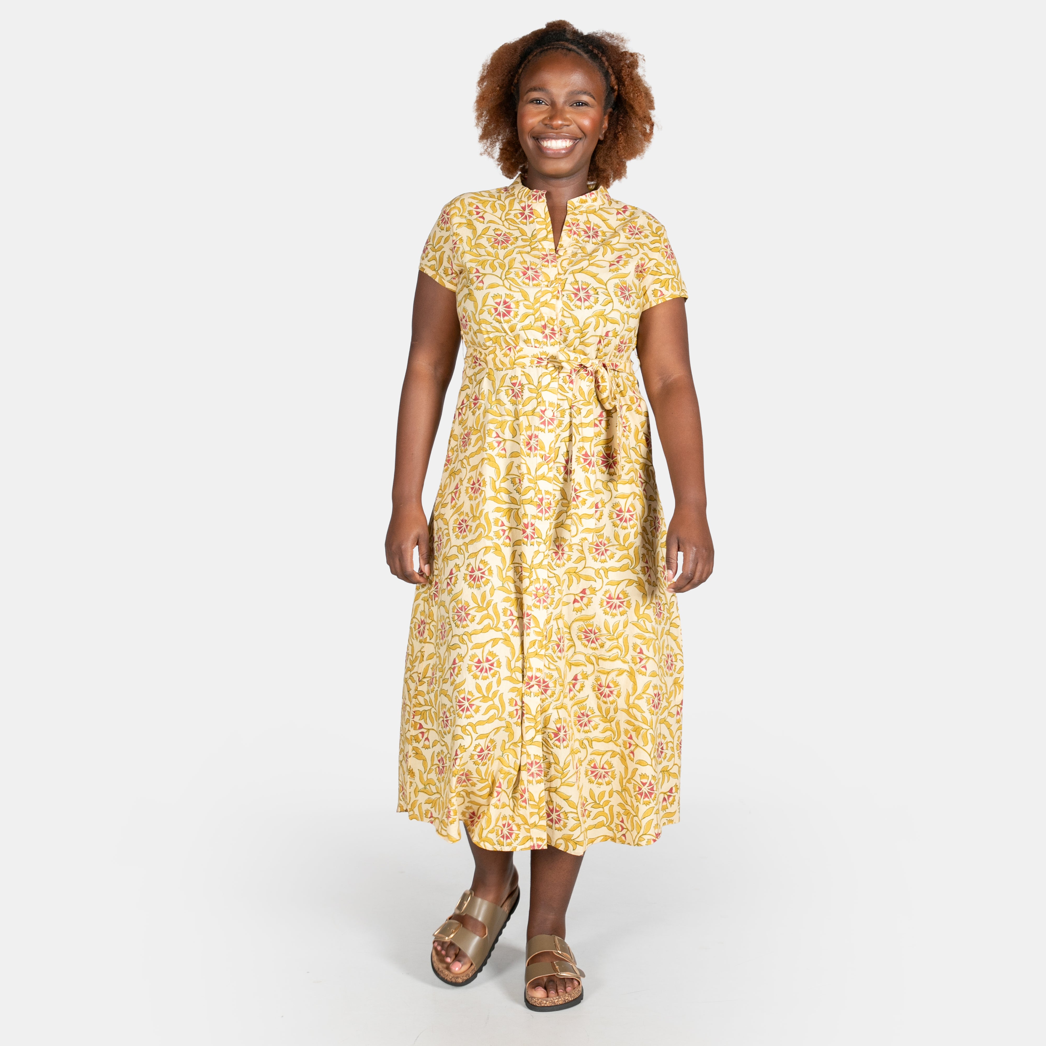 This stone-coloured shirt dress brings together the best of both worlds, a crisp button-front silhouette with a charming collar stand, paired with short capped sleeves. Handcrafted in India using quality cotton and adorned with traditional block printing, it's a dress with personality. The removable tie belt lets you switch up your look, while practical side seam pockets and belt loops keep things functional. Effortlessly versatile, this dress transitions from casual weekends to put-together weekdays with ease.