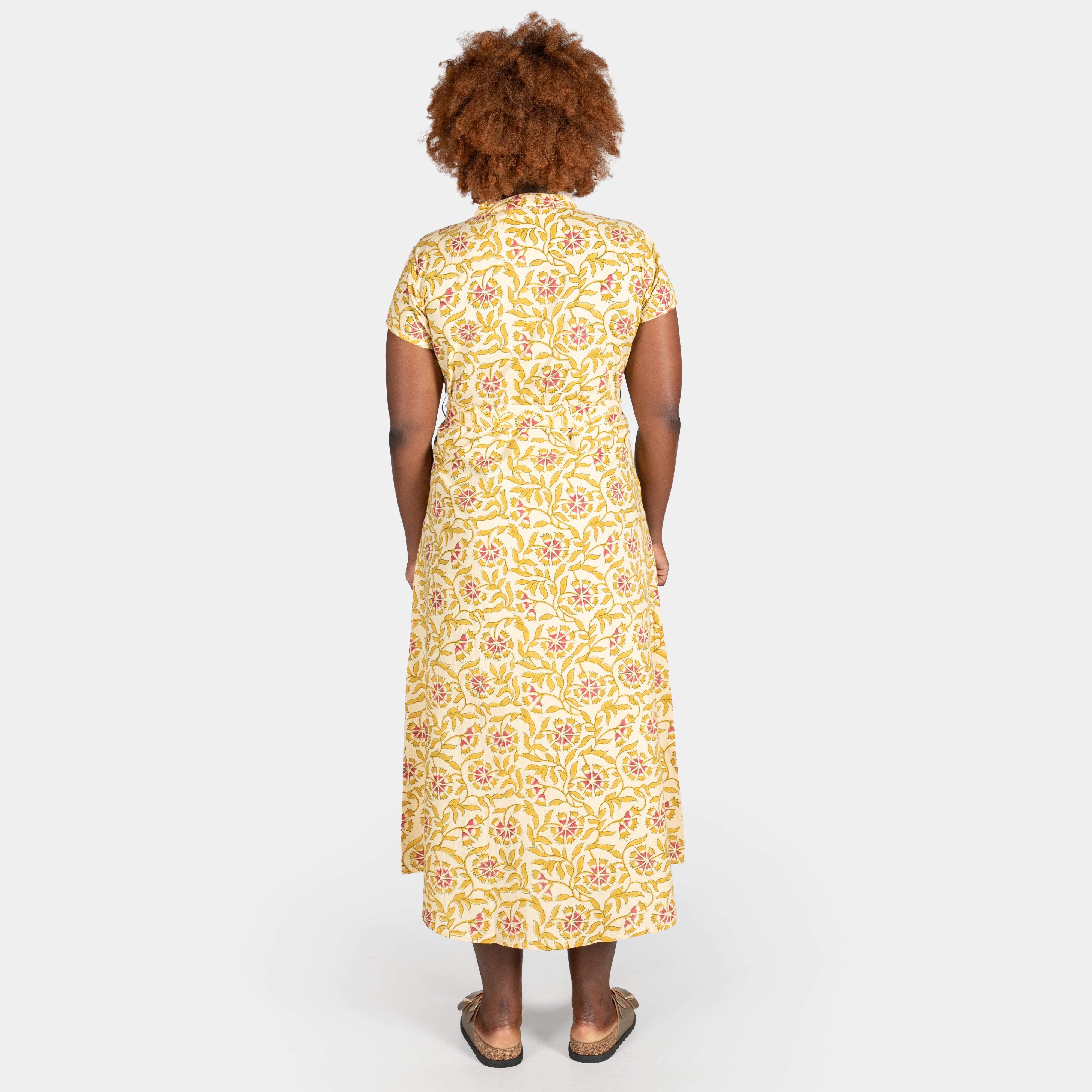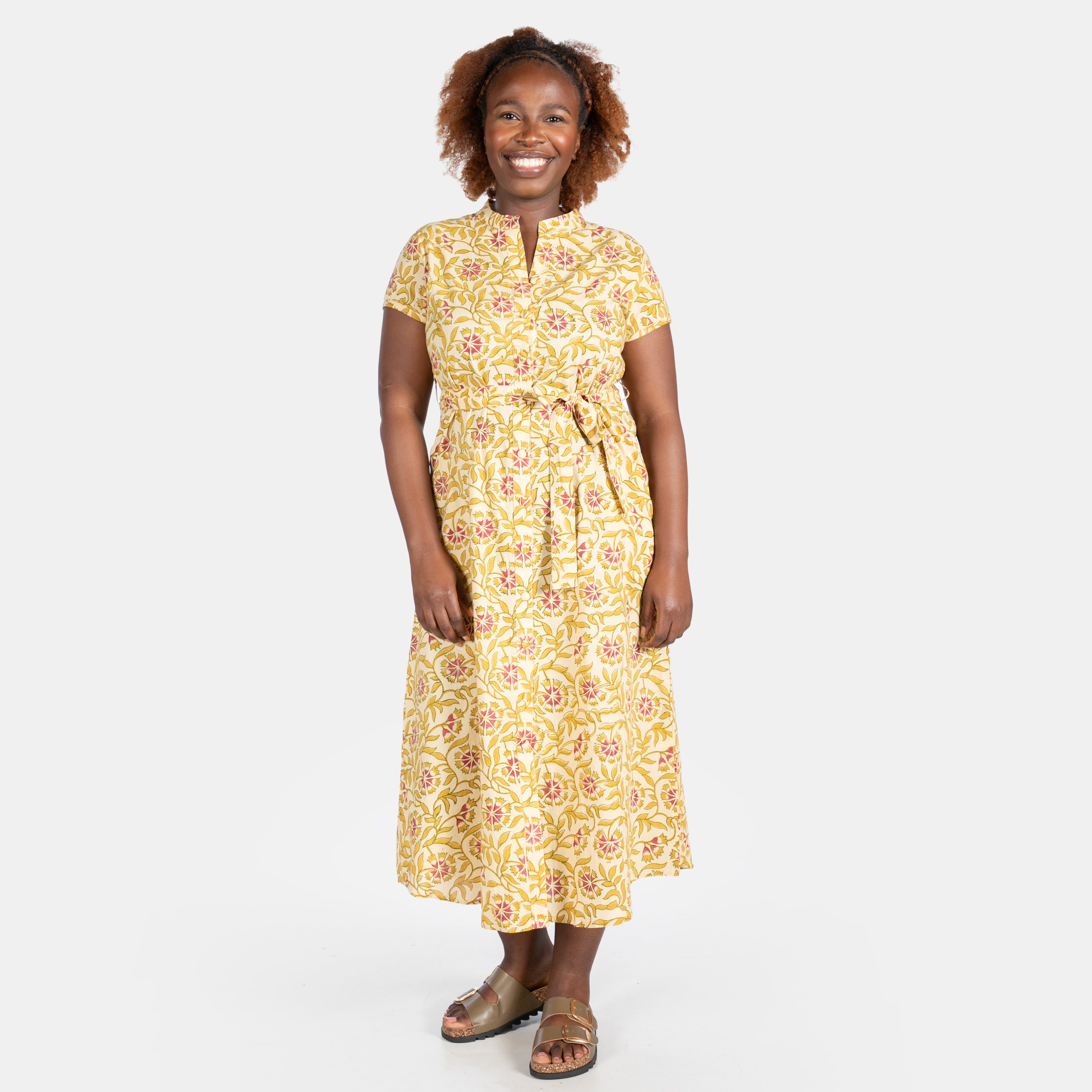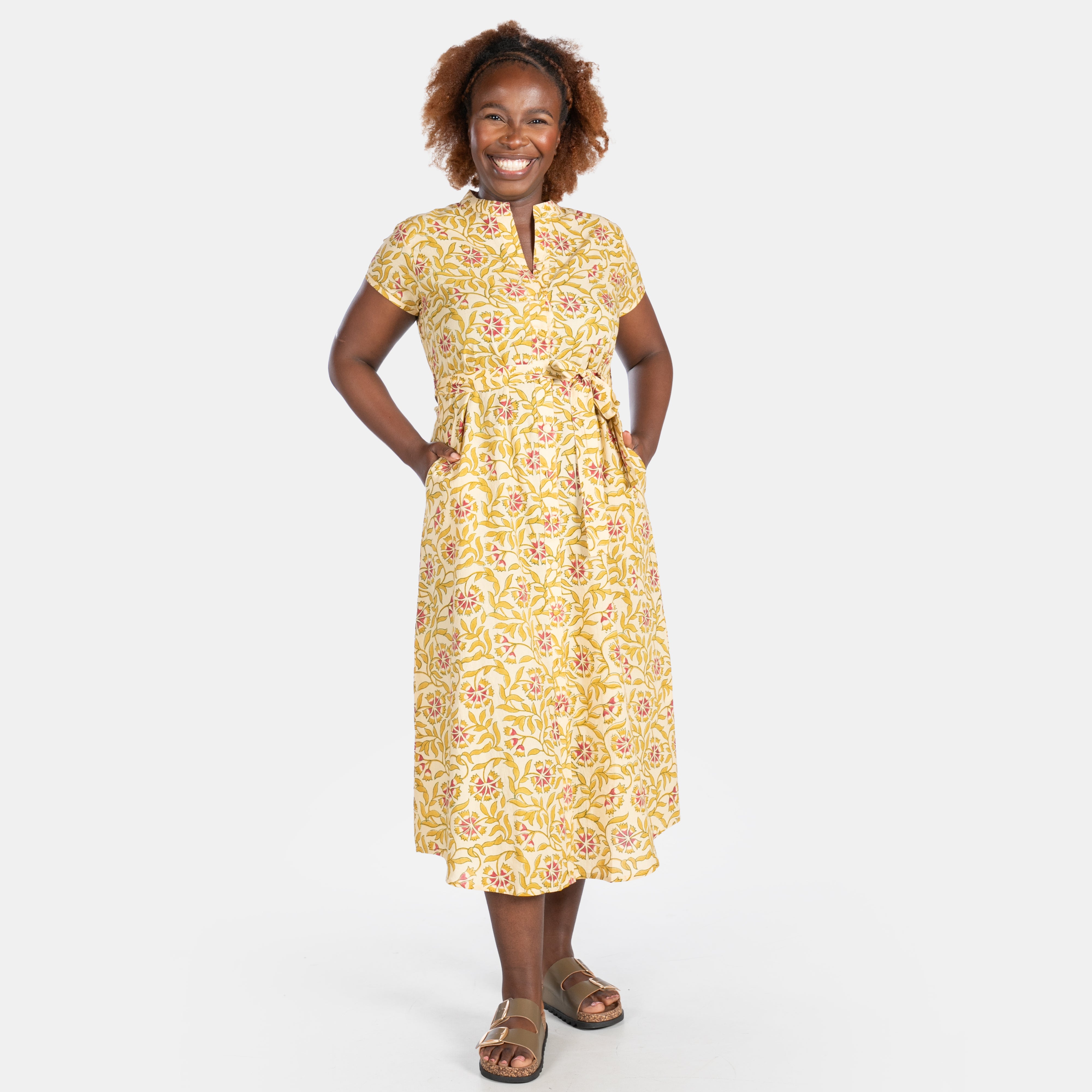 This stone-coloured shirt dress brings together the best of both worlds, a crisp button-front silhouette with a charming collar stand, paired with short capped sleeves. Handcrafted in India using quality cotton and adorned with traditional block printing, it's a dress with personality. The removable tie belt lets you switch up your look, while practical side seam pockets and belt loops keep things functional. Effortlessly versatile, this dress transitions from casual weekends to put-together weekdays with ease.