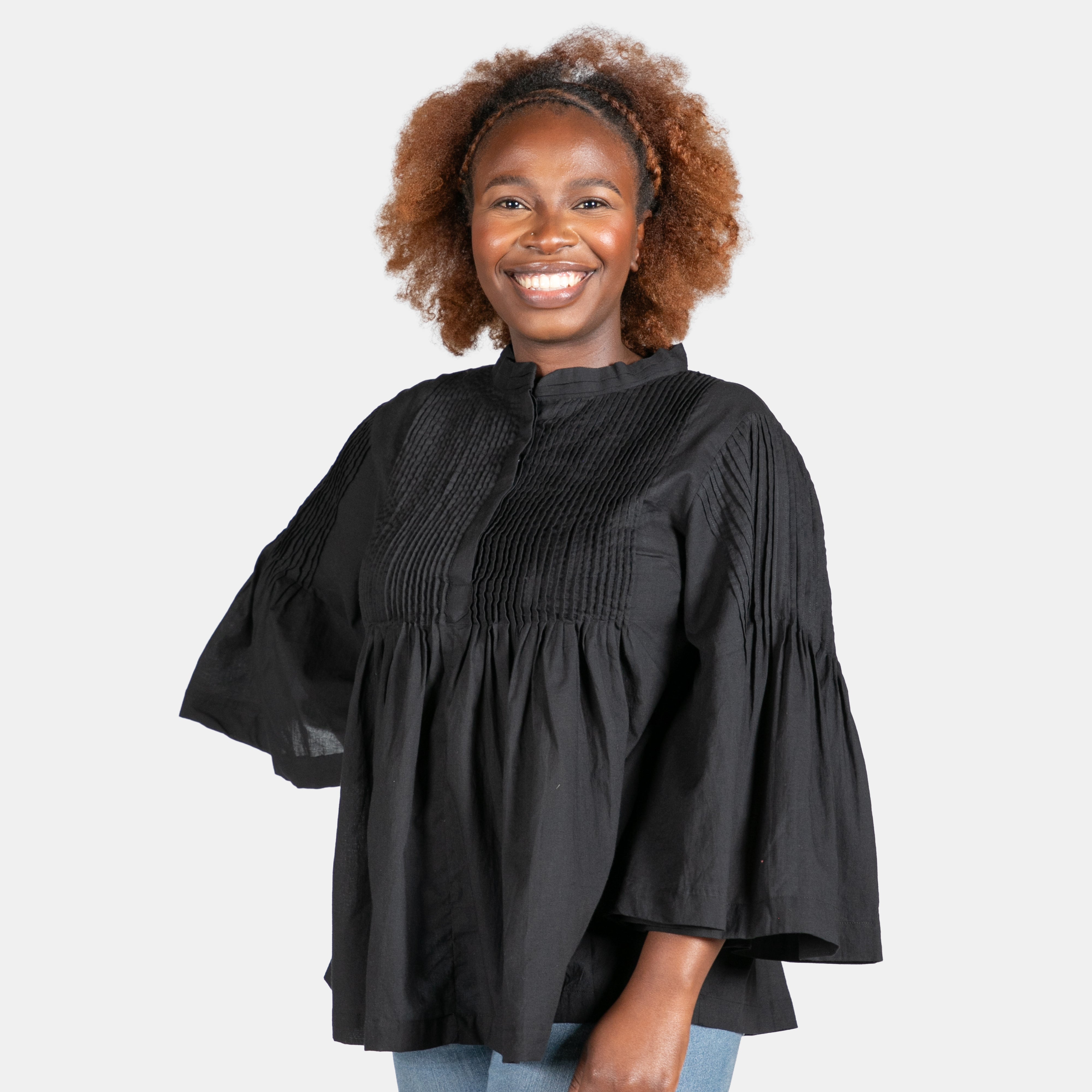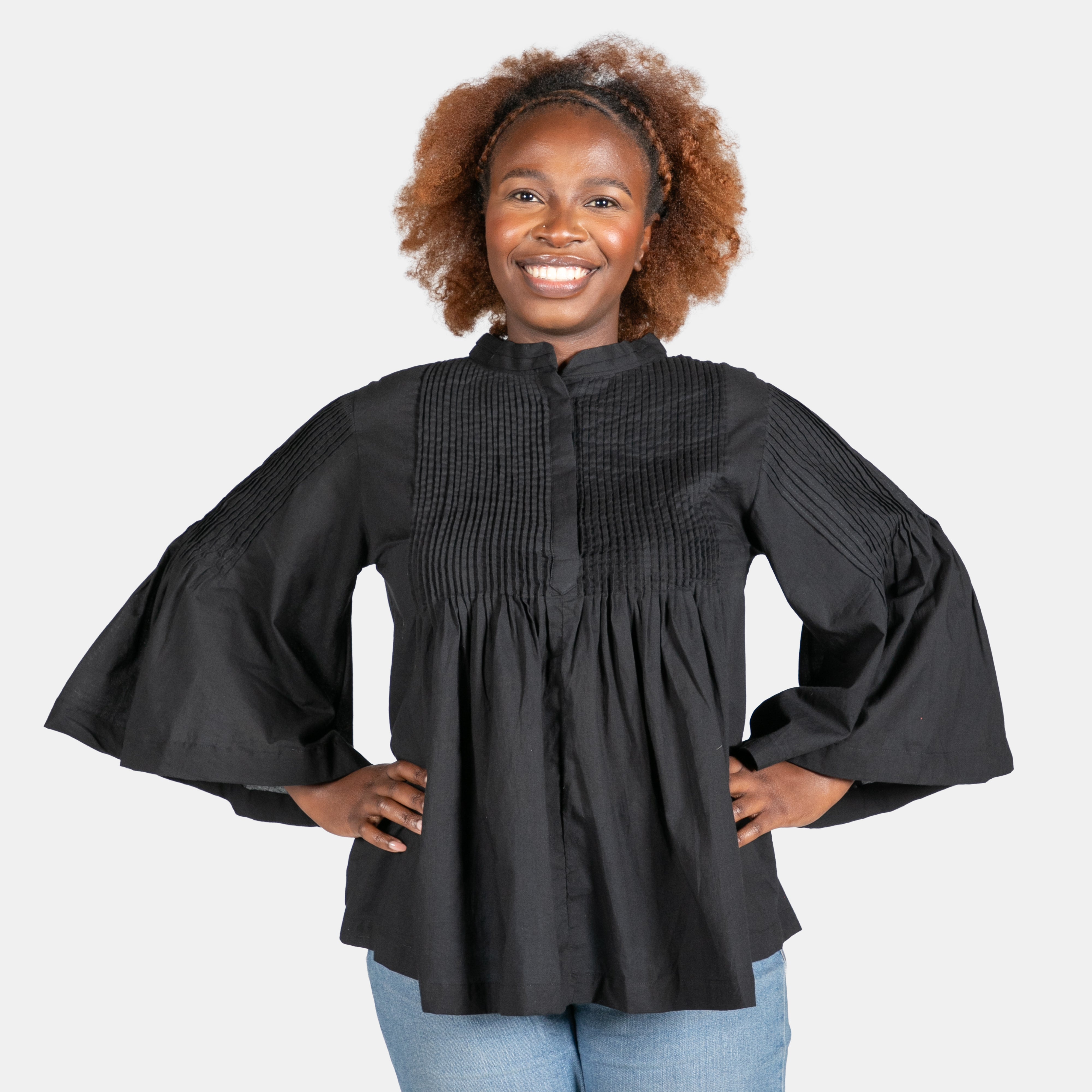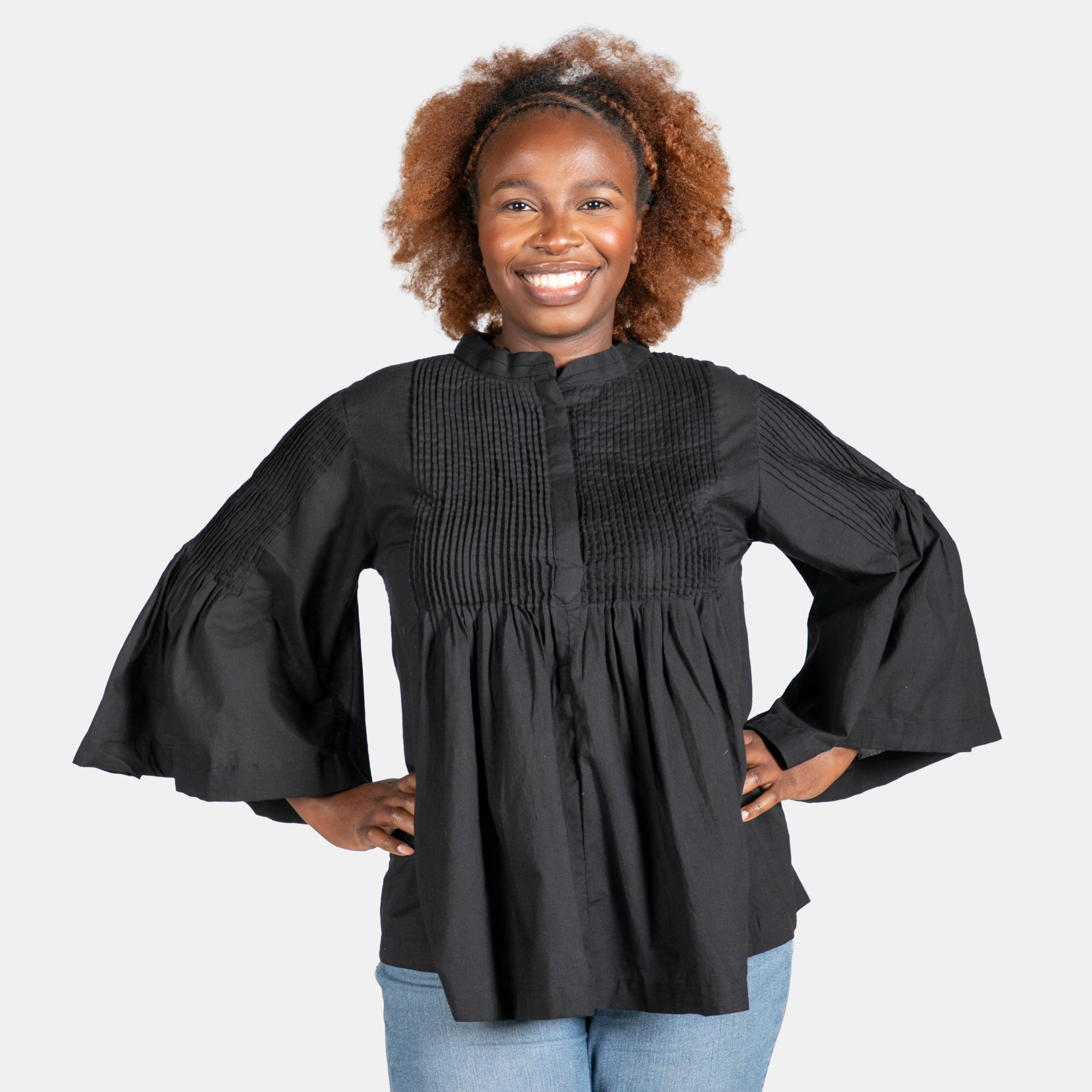 Introducing a top that's all about the details! Delicate pin tucks dance across the sleeves, front, and back, adding dimension and visual flair. Watch the long sleeves dramatically flare at the elbow for a fun, unexpected twist. Thoughtfully shaped at the hem, this black beauty is cut to celebrate your silhouette with style and personality.