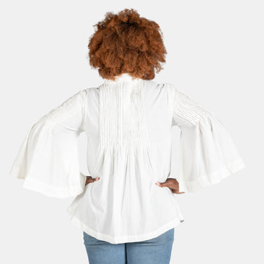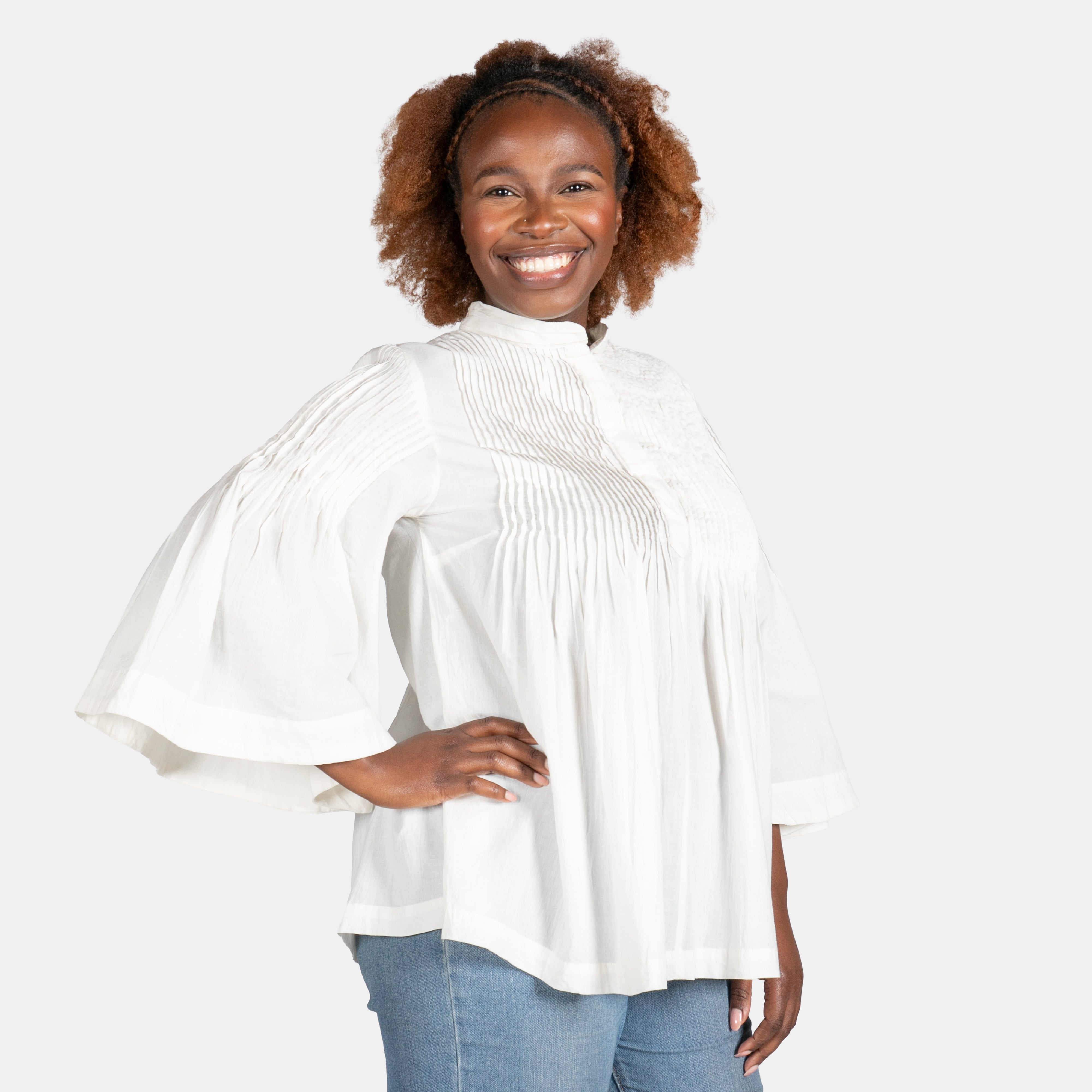 Introducing a top that's all about the details! Delicate pin tucks dance across the sleeves, front, and back, adding dimension and visual flair. Watch the long sleeves dramatically flare at the elbow for a fun, unexpected twist. Thoughtfully shaped at the hem, this cream beauty is cut to celebrate your silhouette with style and personality.