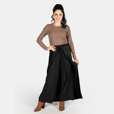 However, if you wear it with the opening to the side over the pants you have the silhouette of a long skirt with the comfort of trousers.