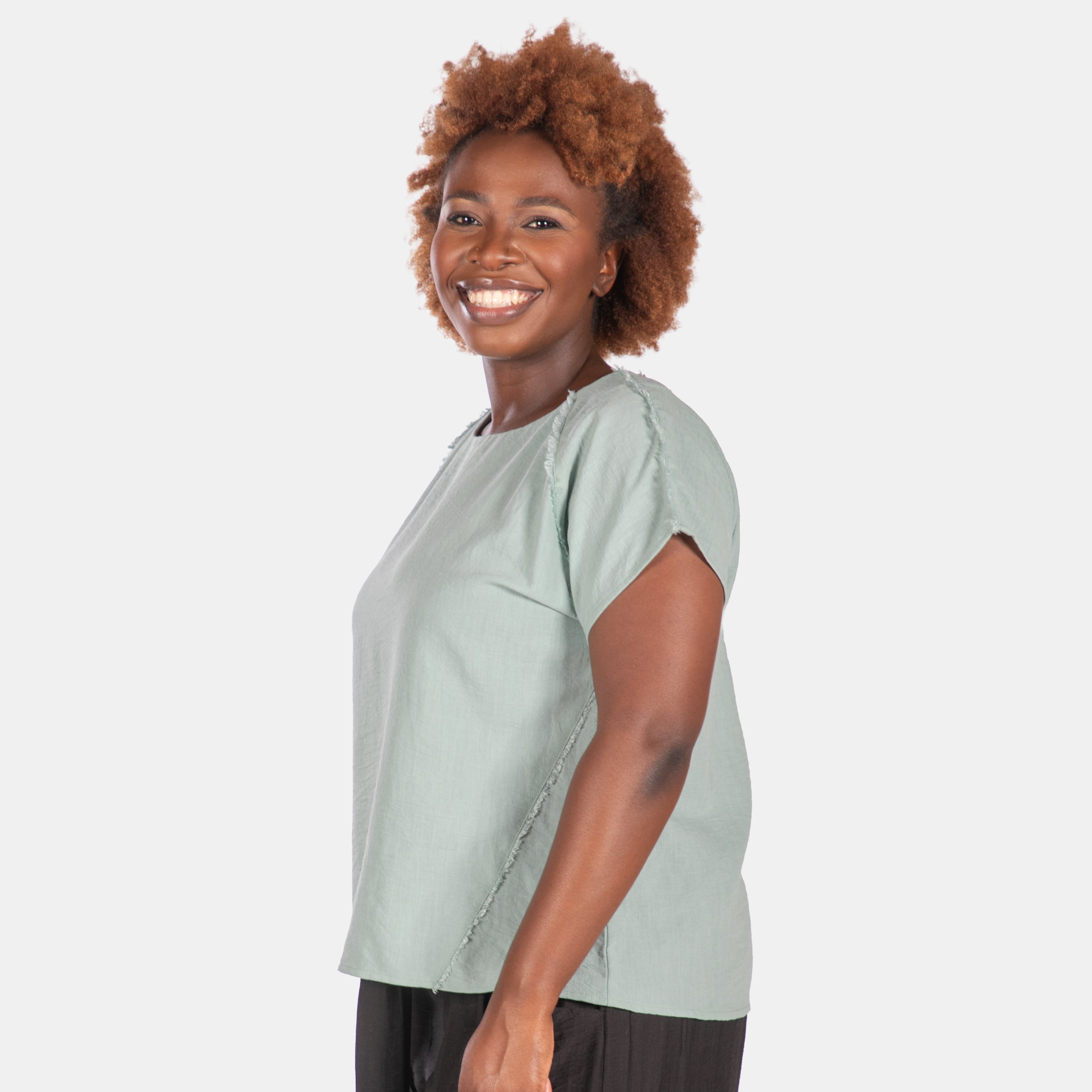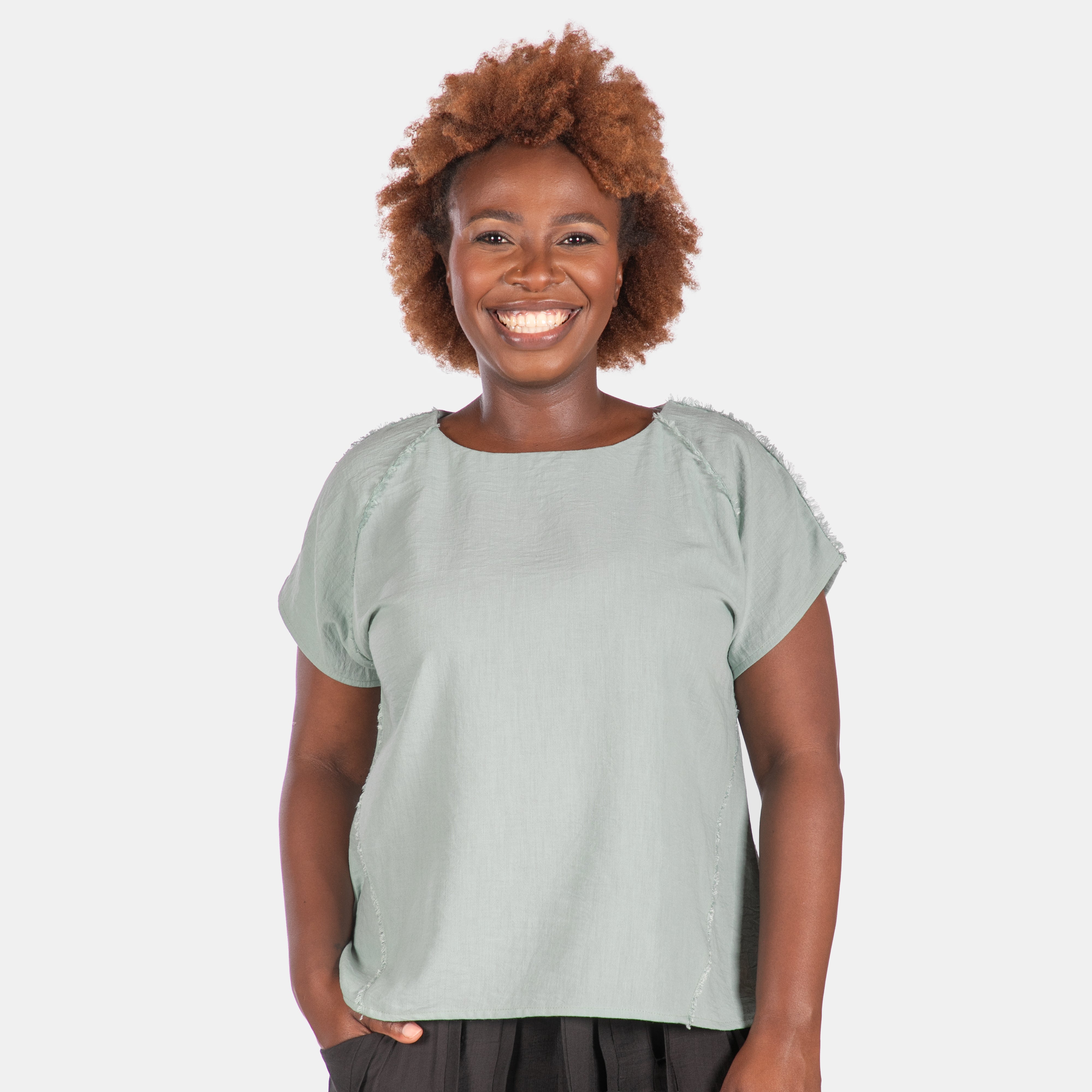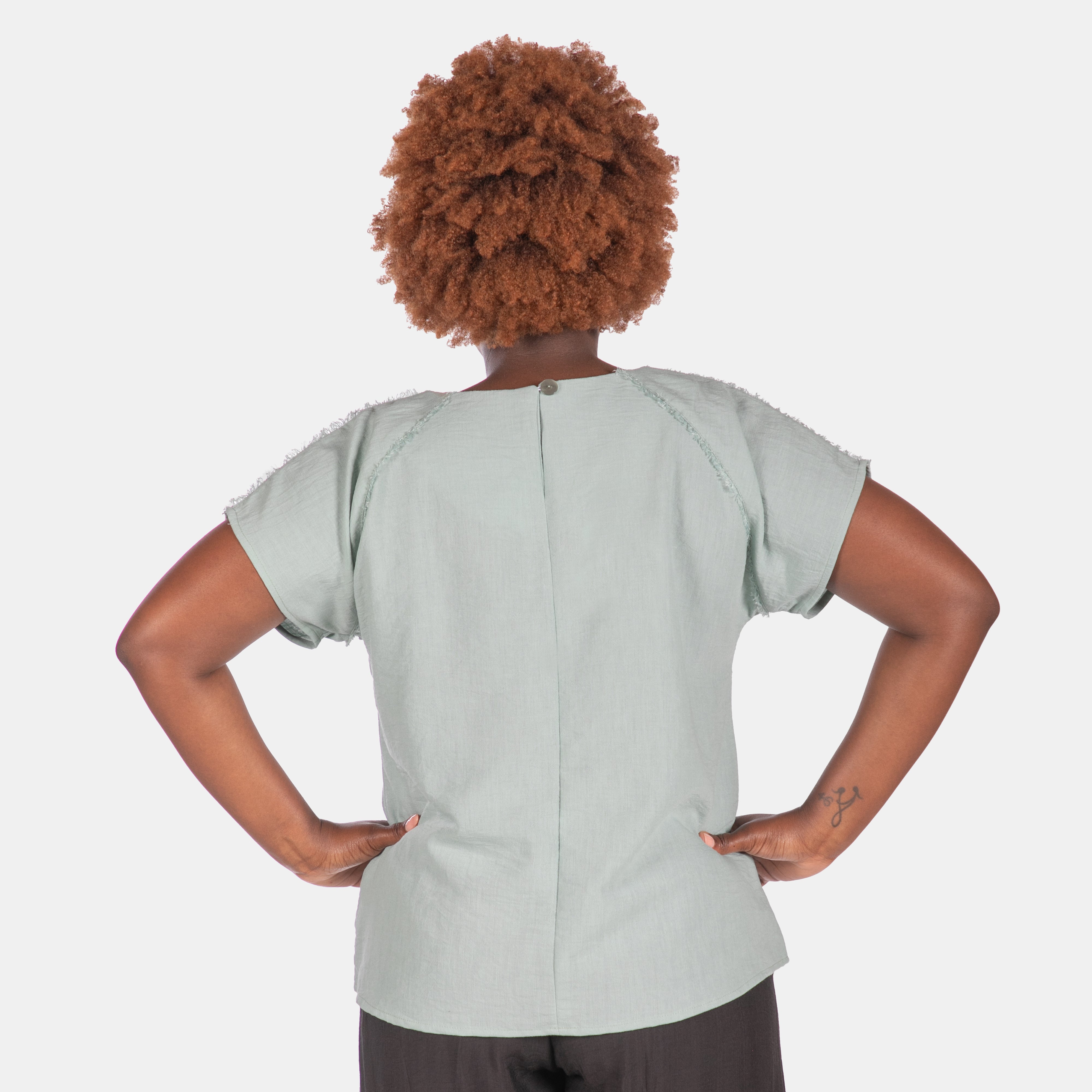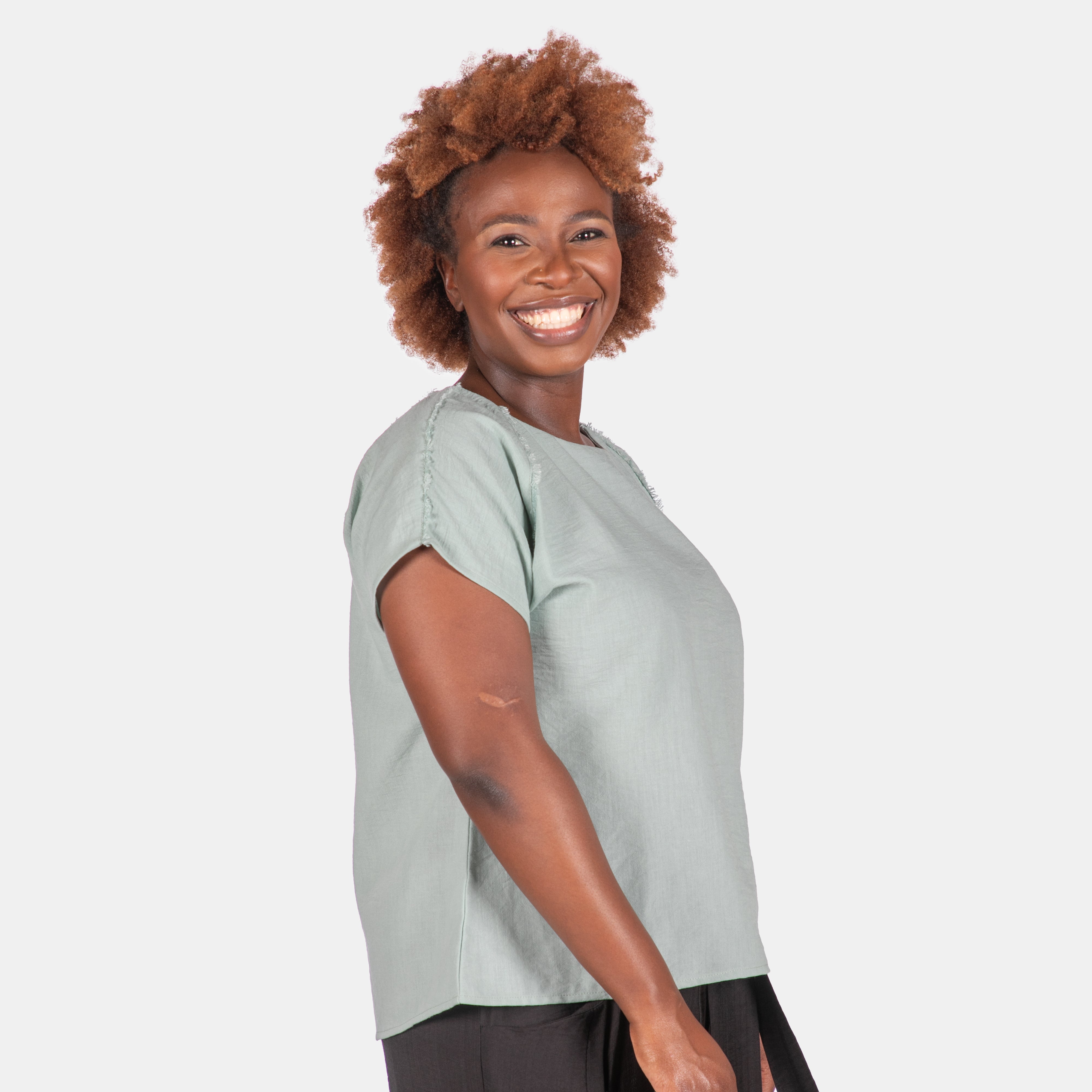 This delightful top features a classic round neckline with button closure at the back and breezy short sleeves.
