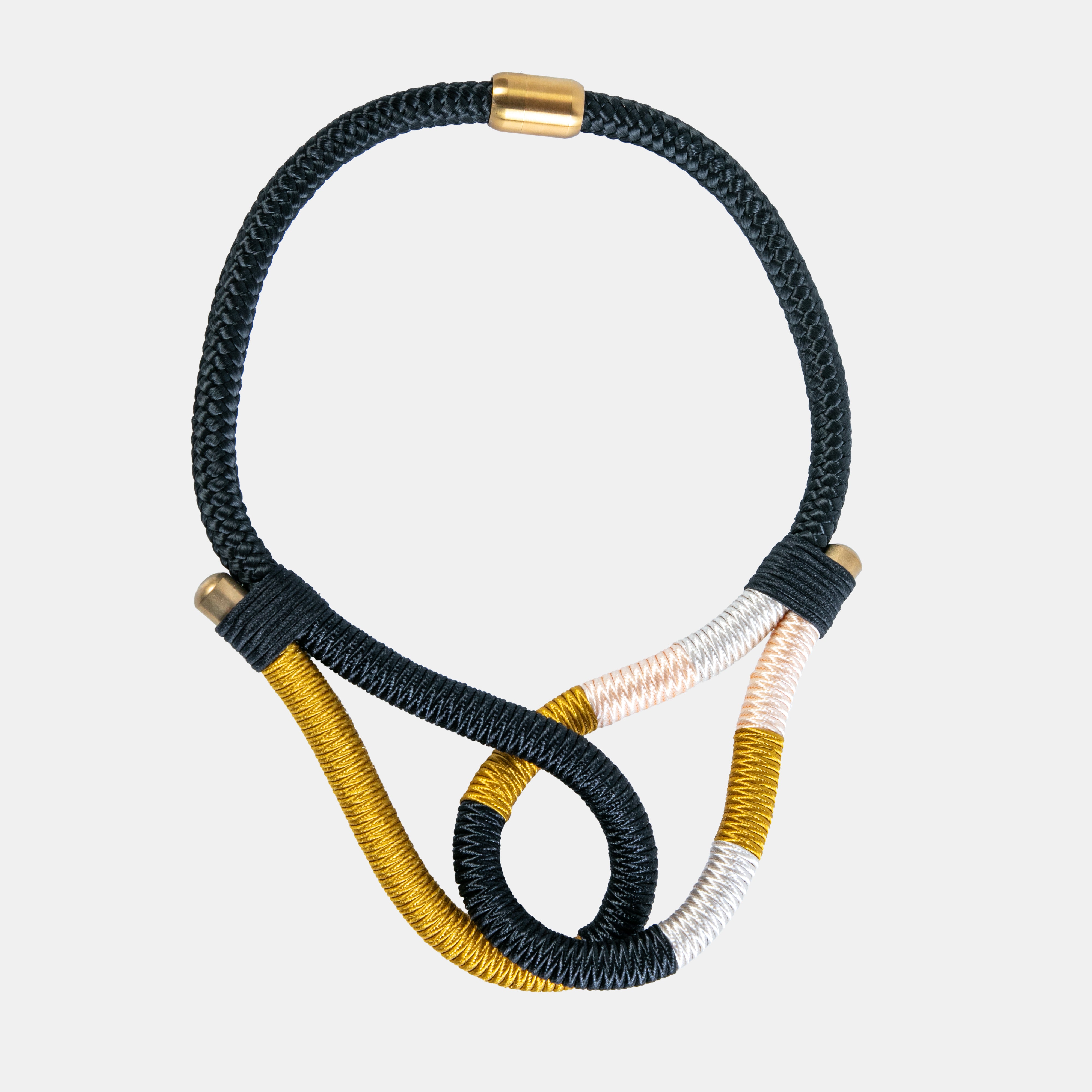 Twisted rope weaves into captivating shapes that demand attention, secured with a sleek metal ring closure at the back. Lightweight yet bold, it's your go-to piece for adding instant personality to any outfit.