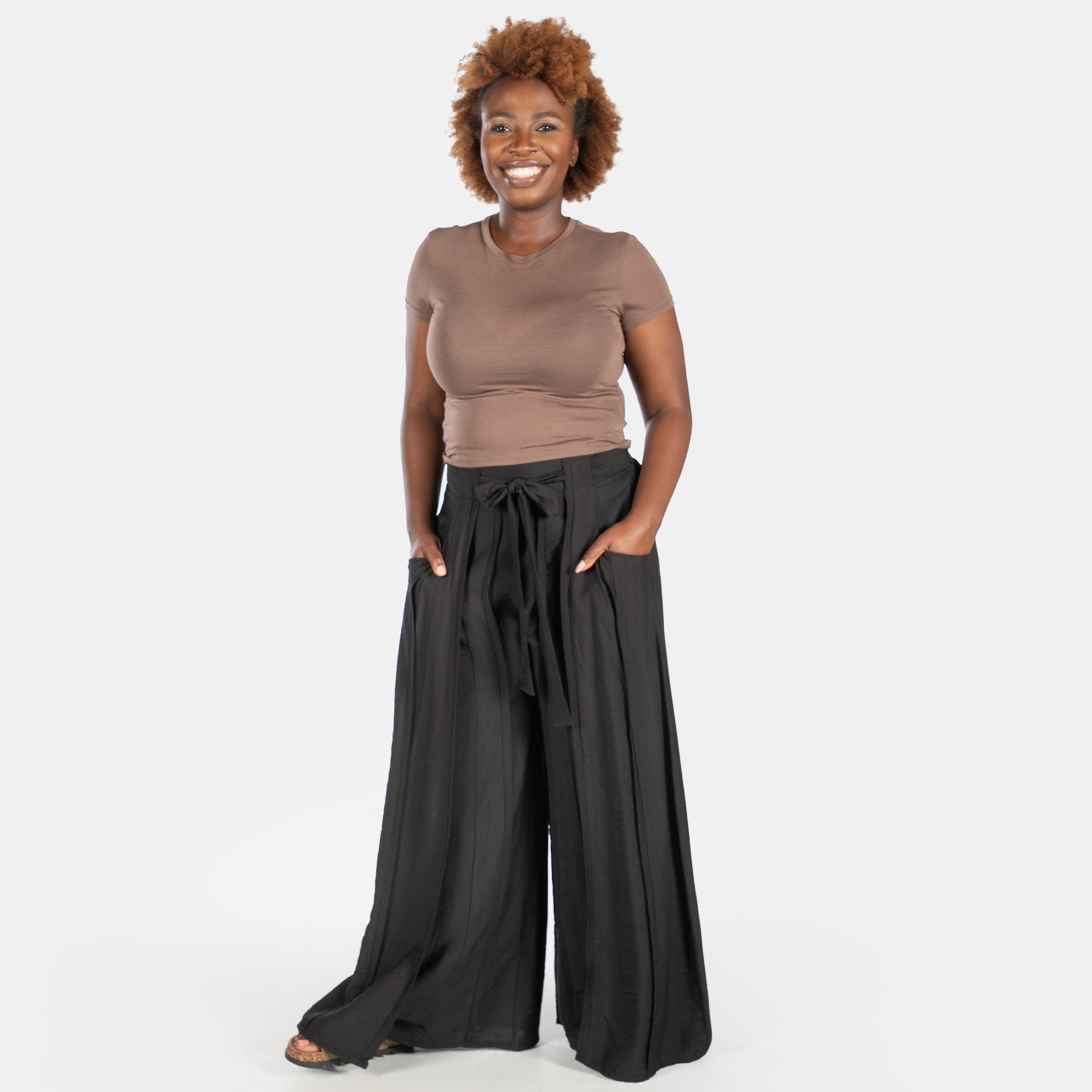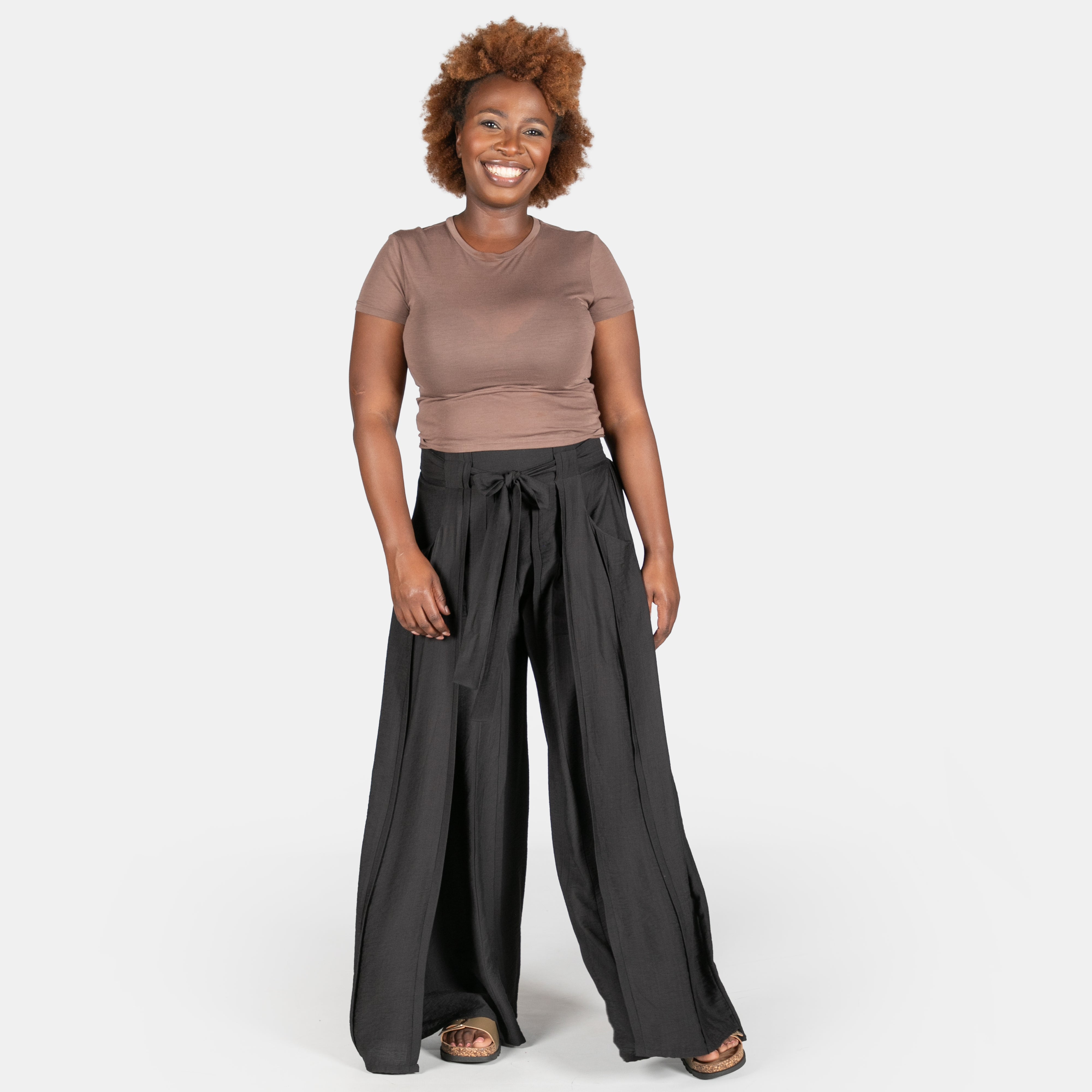 The widening legs have pin tuck pleats on the vertical and panels around the outer sides that create movement as you walk.