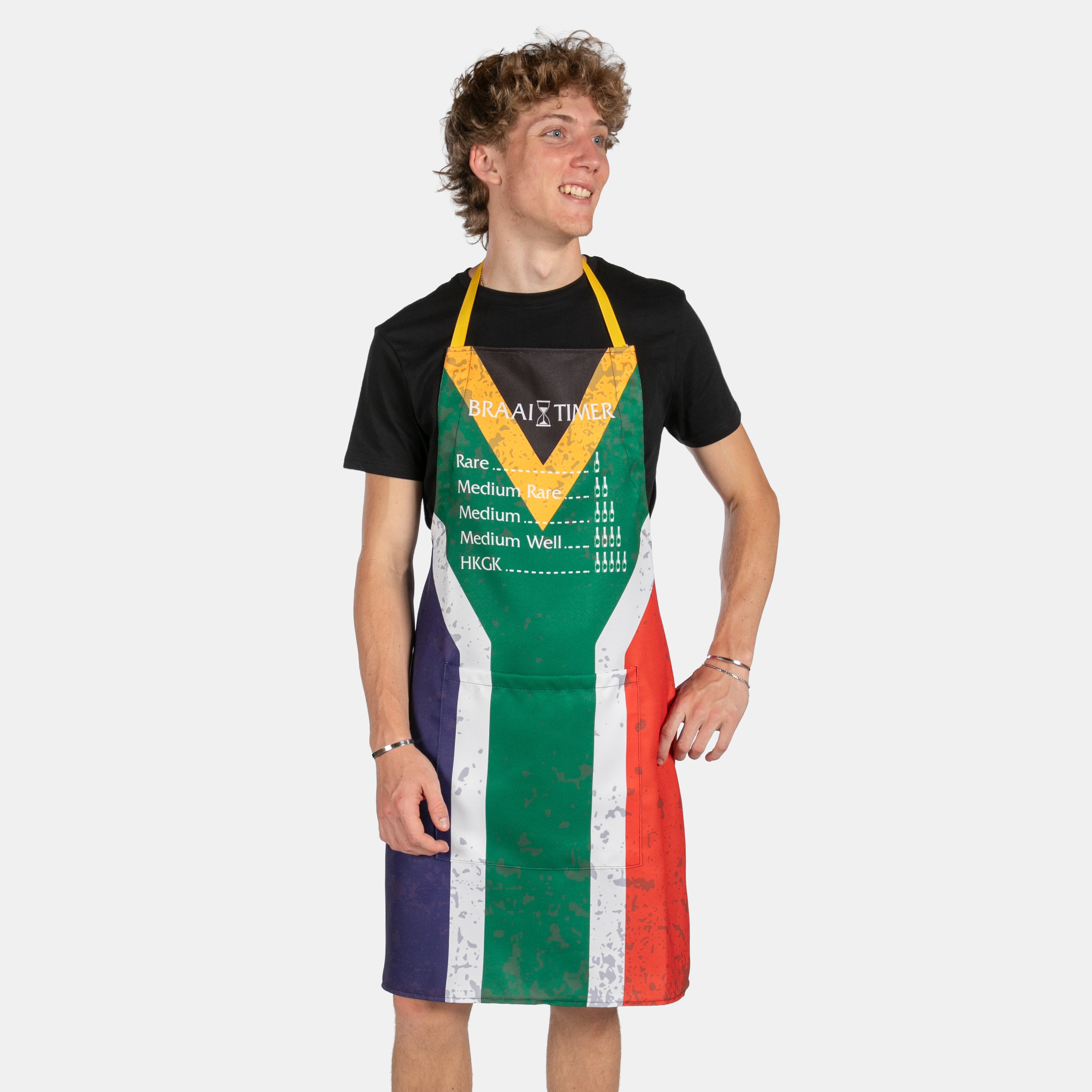 This great South African flag apron features a built-in timer on the bib that measures doneness from Rare straight through to HKGK (well done).