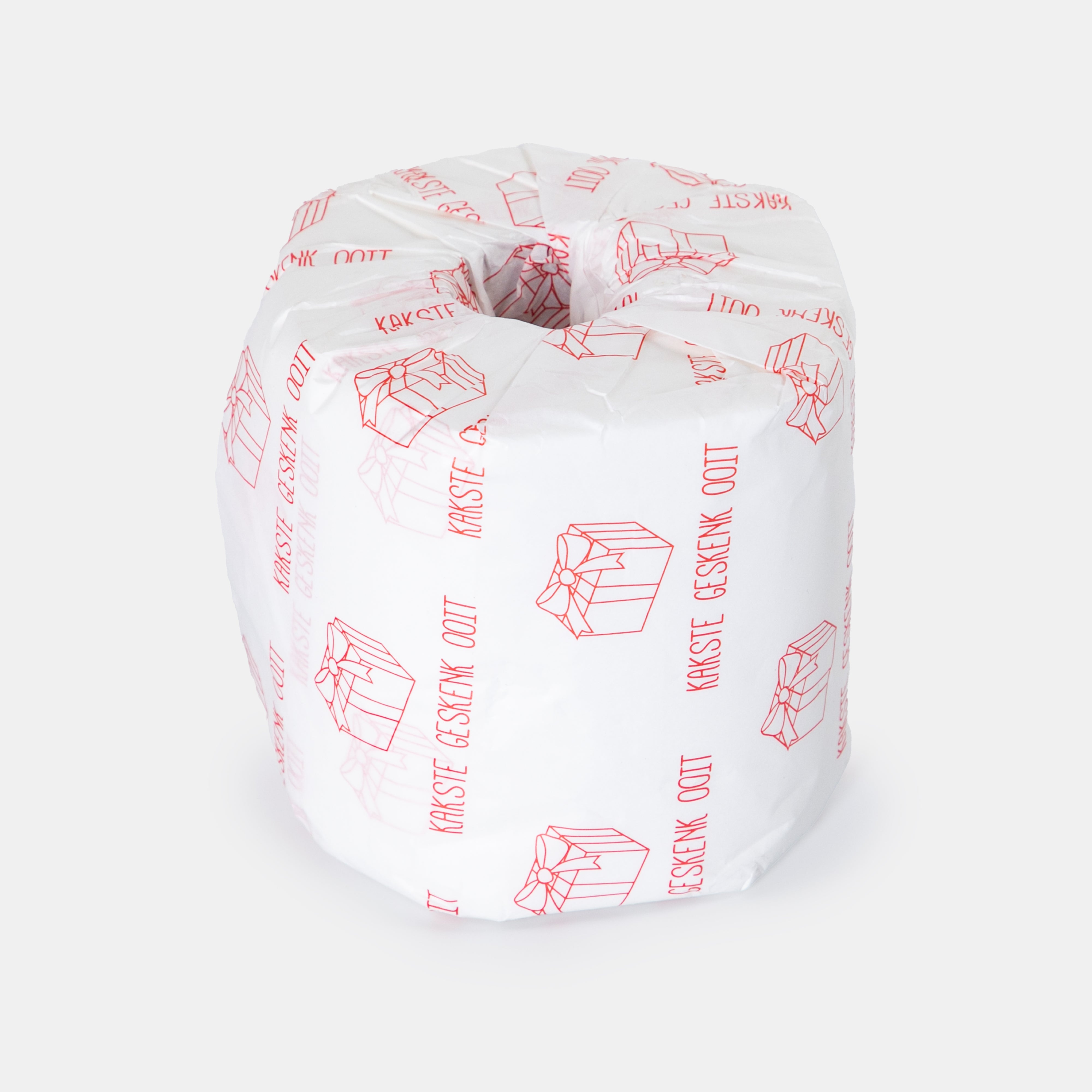 2 ply white toilet paper wrapped in printed tissue making for a hilarious Christmas morning!