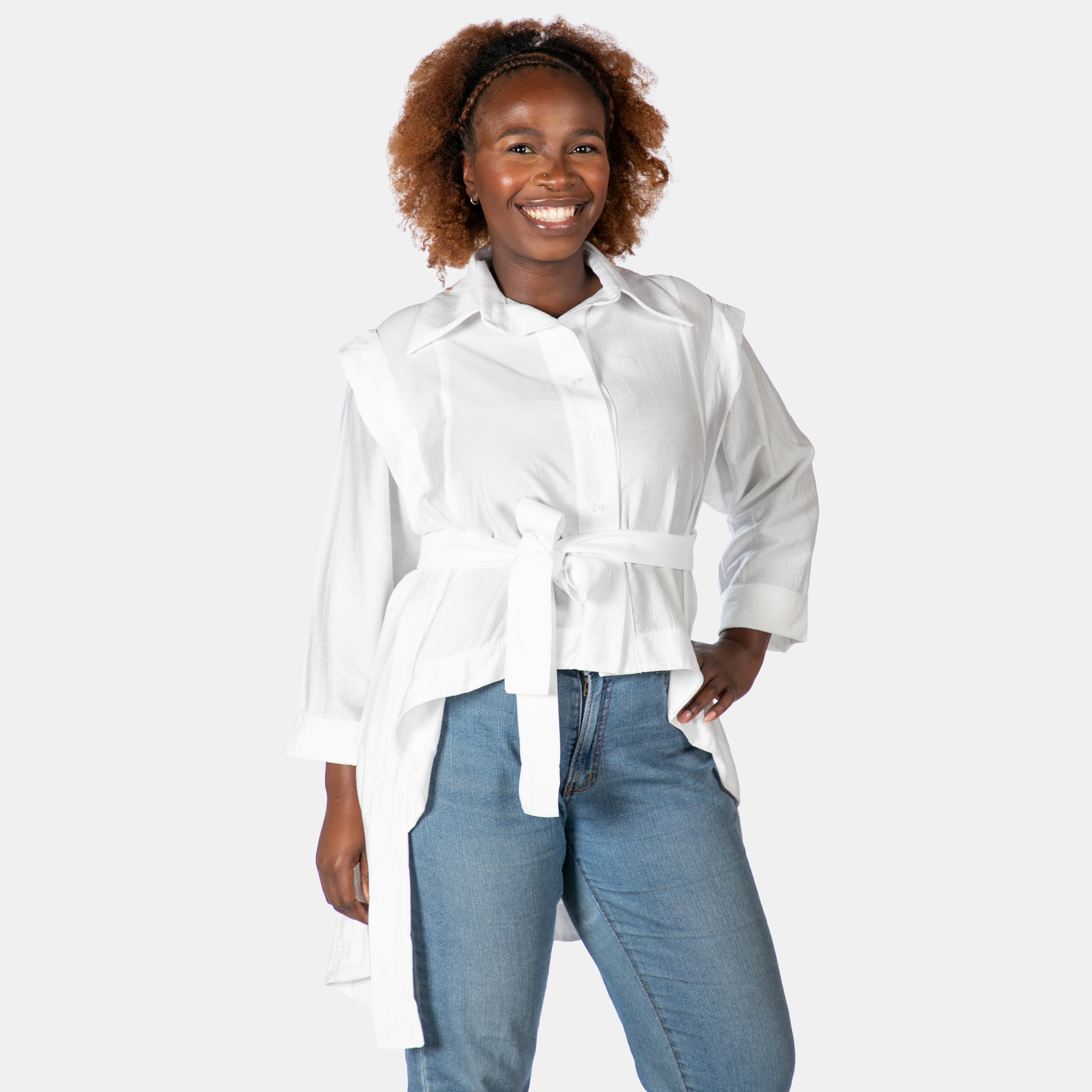 The Lorelei Shirt brings attitude and versatility in one gorgeous package. Styled with three-quarter sleeves, a sharp collar, and front button closure, this piece features a clever asymmetrical cut that's cropped at the front and flows to mid-thigh at the back. The bonus detachable belt gives you instant styling options—cinch it for definition or ditch it for an easy, relaxed look. Pair with jeans, layer over basics, or wear it solo as a lightweight jacket. One shirt, endless possibilities.