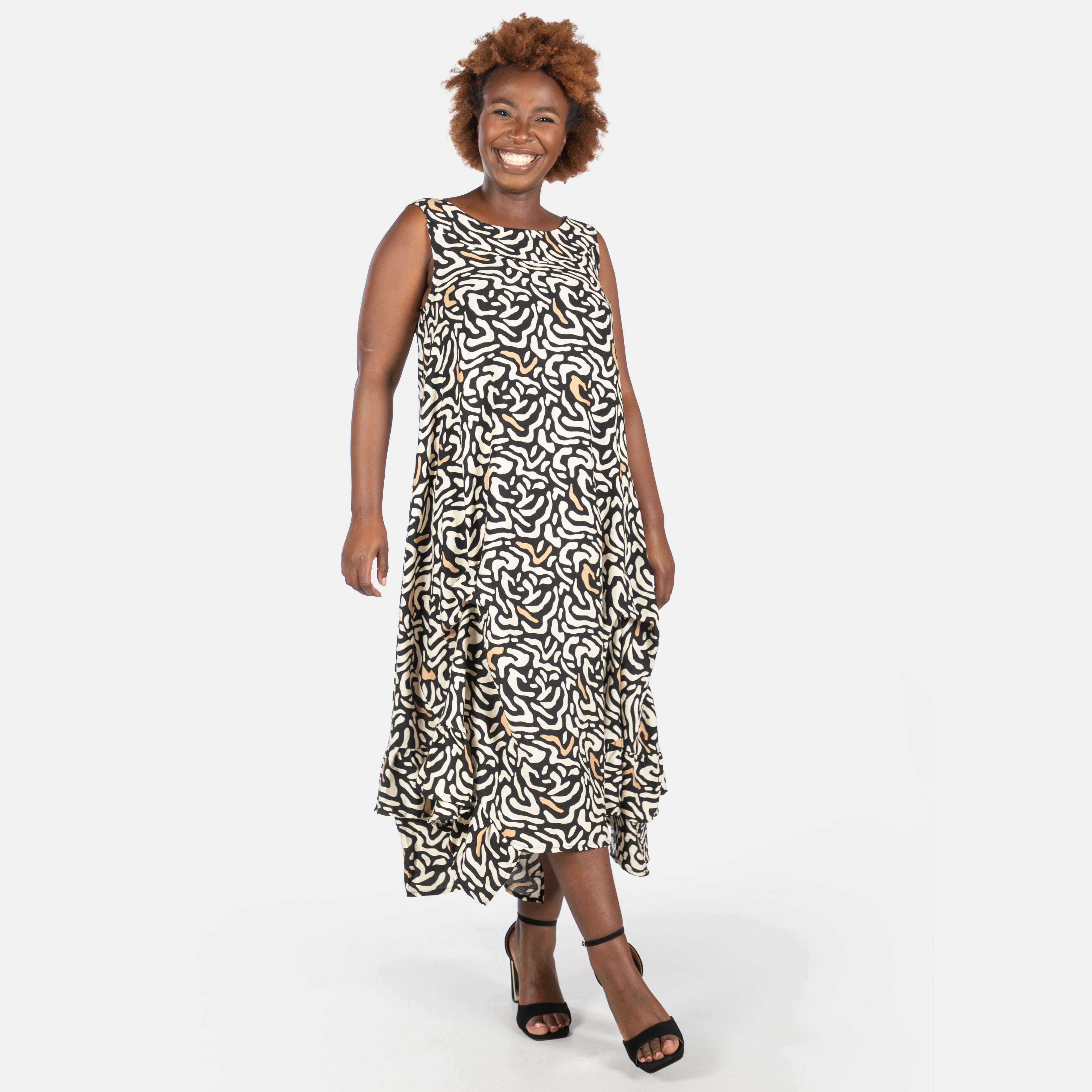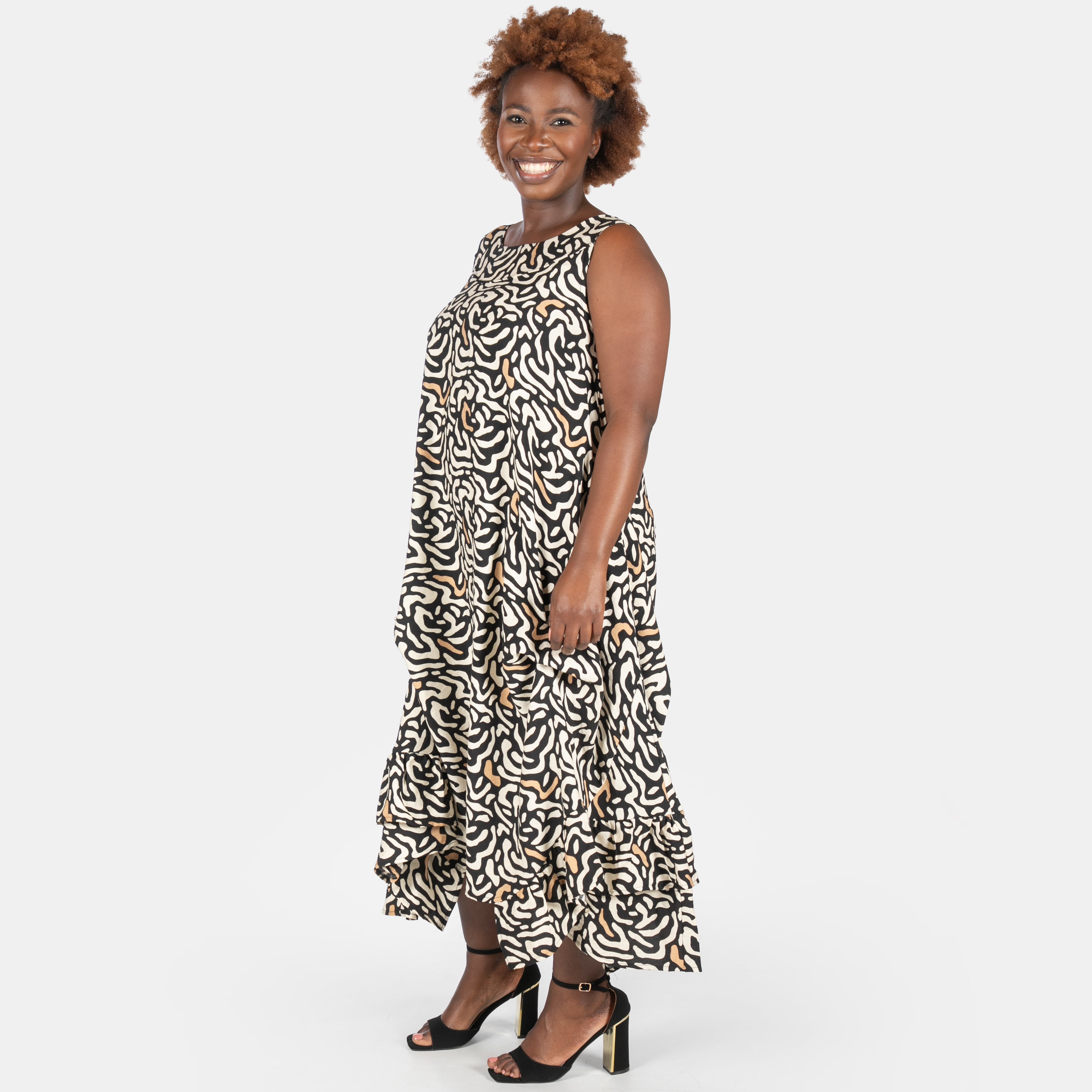 The straight-cut waist flows into playful ruffled hemming, while the striking black and white patterned fabric, with its wild, almost animal-print aesthetic, ensures you'll turn heads wherever you go.