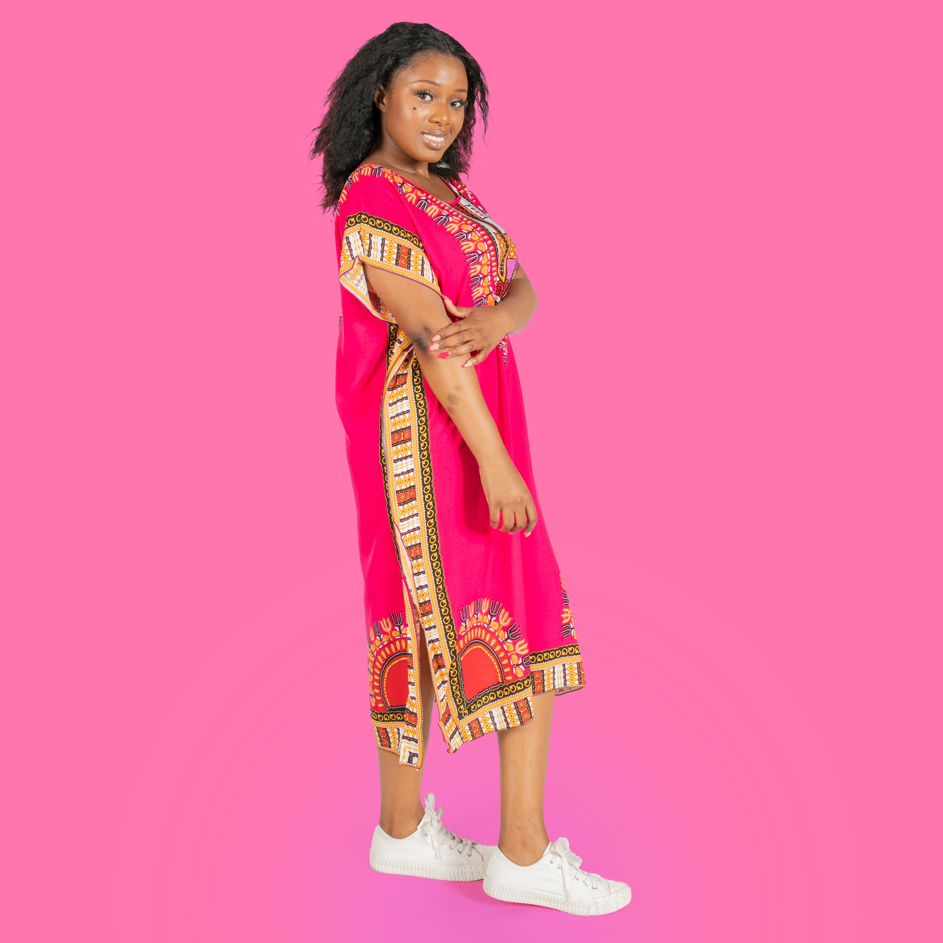 This Pink ladies' slim fit kaftan combines elegance with comfort, designed to flatter most body types with its one-size-fits-most silhouette. Its lightweight fabric drapes gracefully, making it perfect for warm days or casual gatherings. Elevate your wardrobe with a versatile piece that adds a splash of vibrant color and effortless style to any occasion.