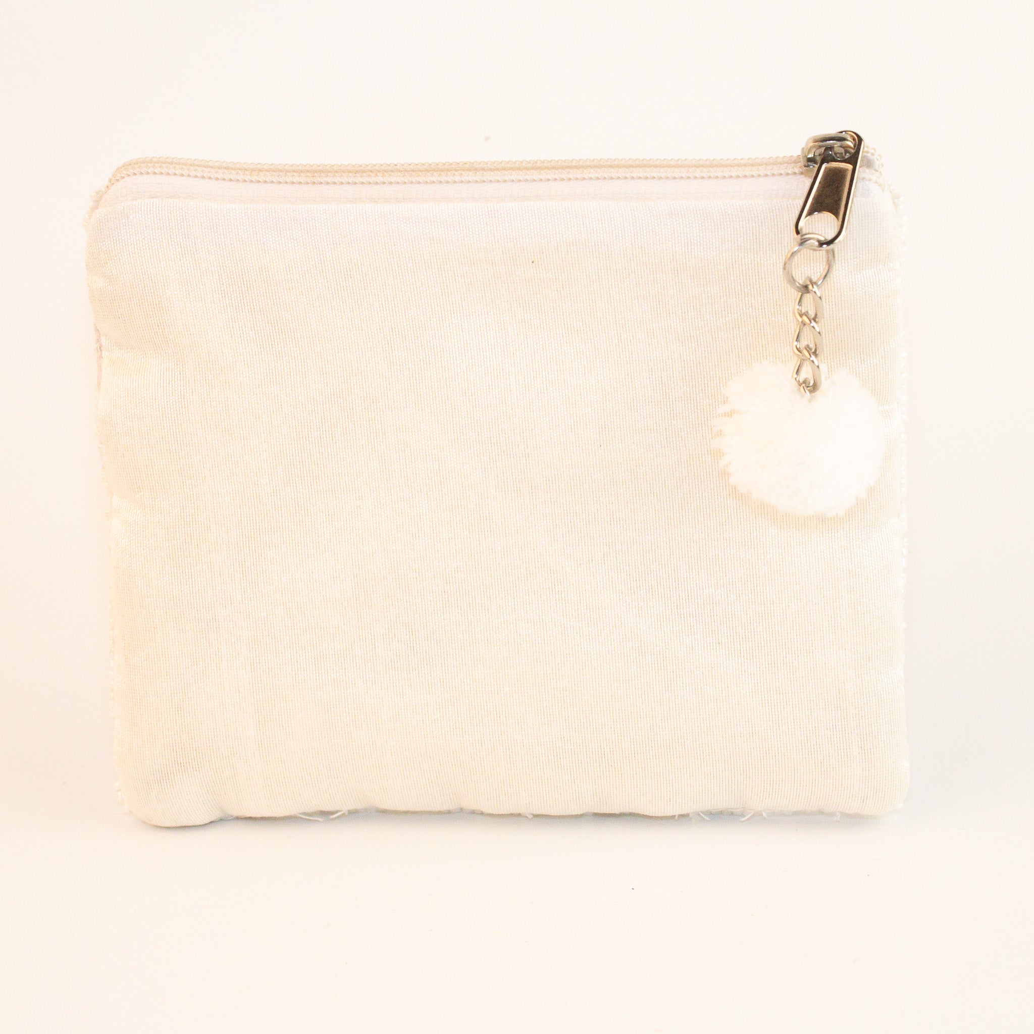 This little purse is hand beaded on the front, lined and boasts a pom pom on it's zipper. Use it for make up, cash, earphones or just about anything.