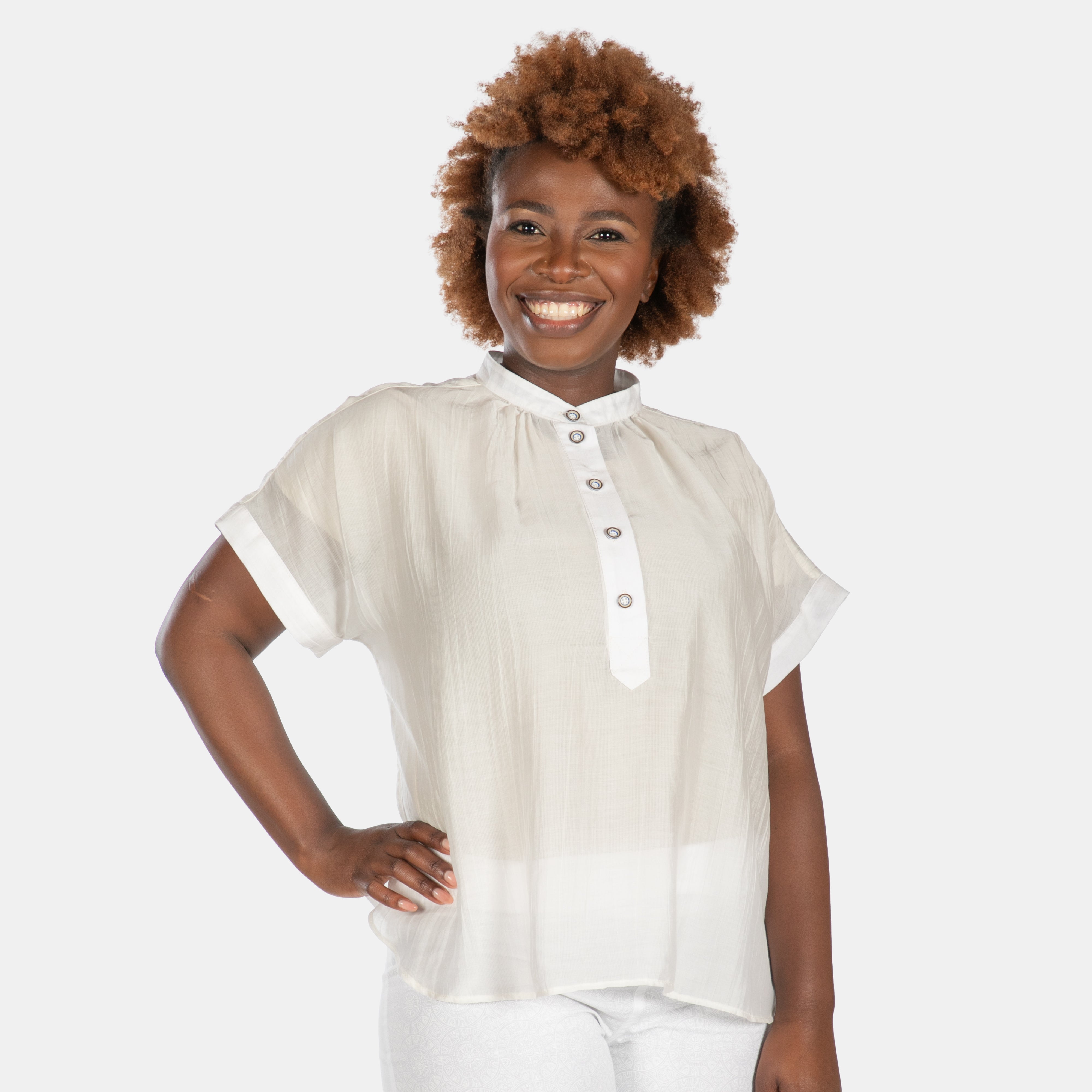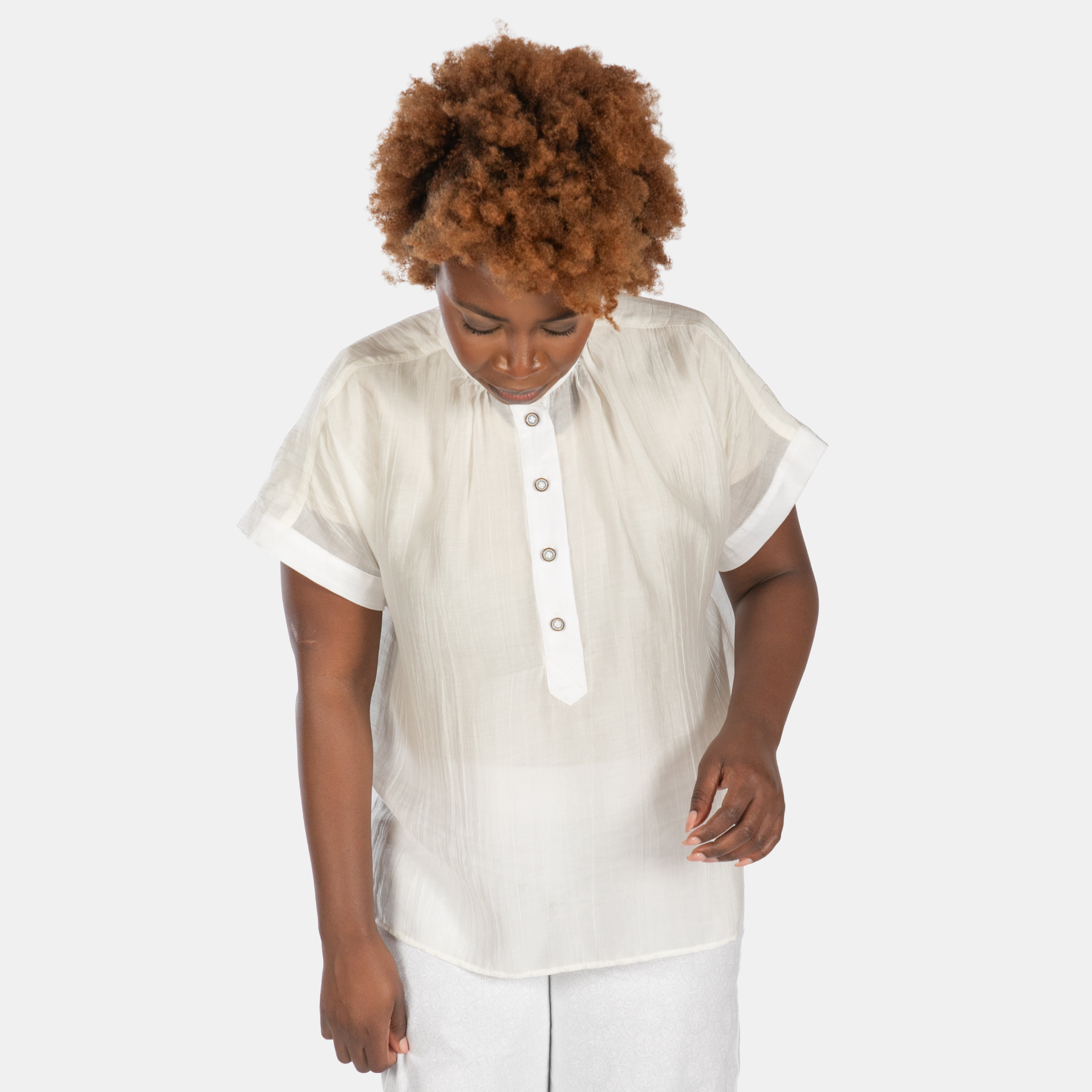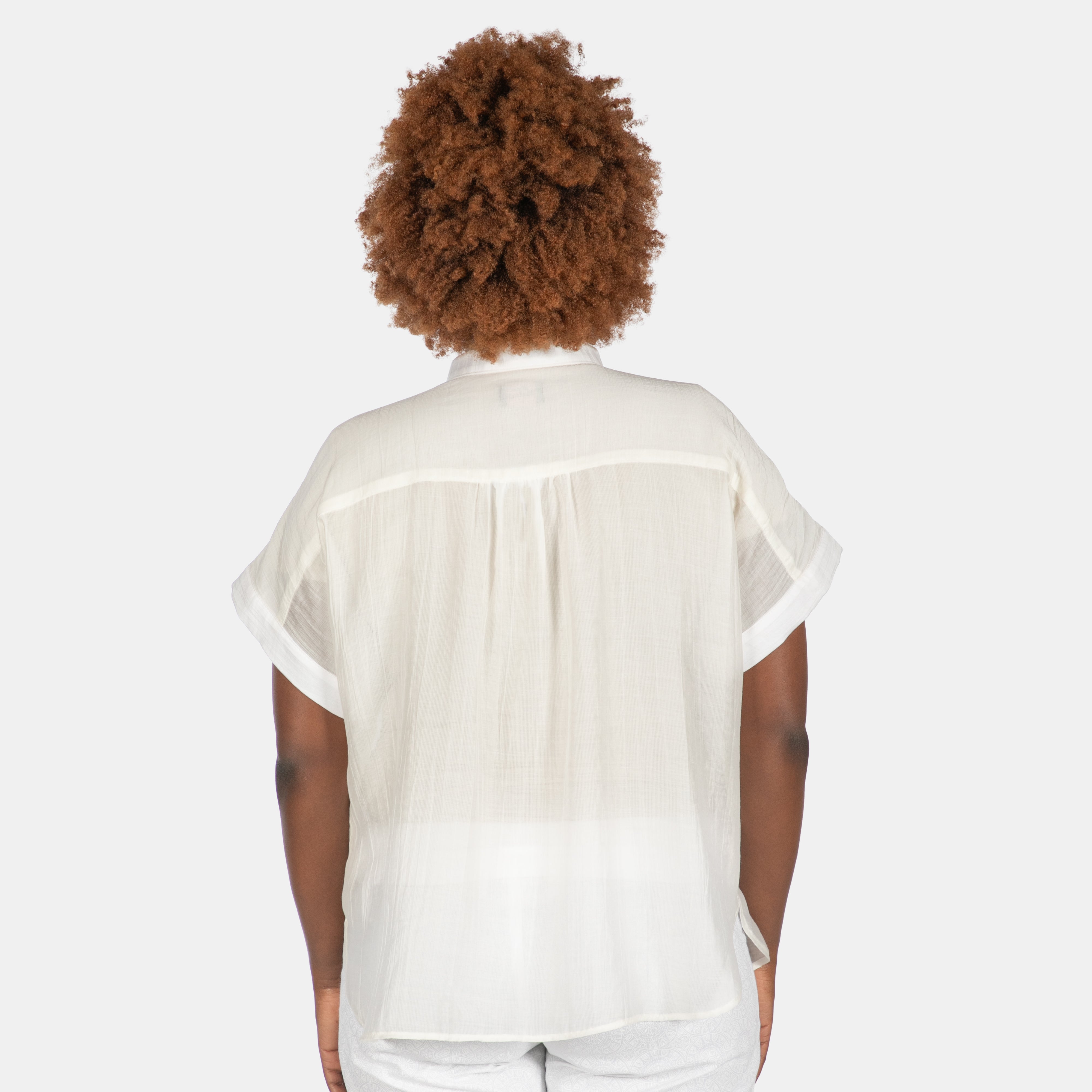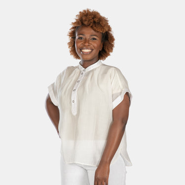 The Rio top features a round neck with button up placket that goes about half way down the front. The short sleeves are wide and gather gently along the collar. Gathers across the back yoke add volume to the back. You will notice the hem is shaped with slits at the sides.